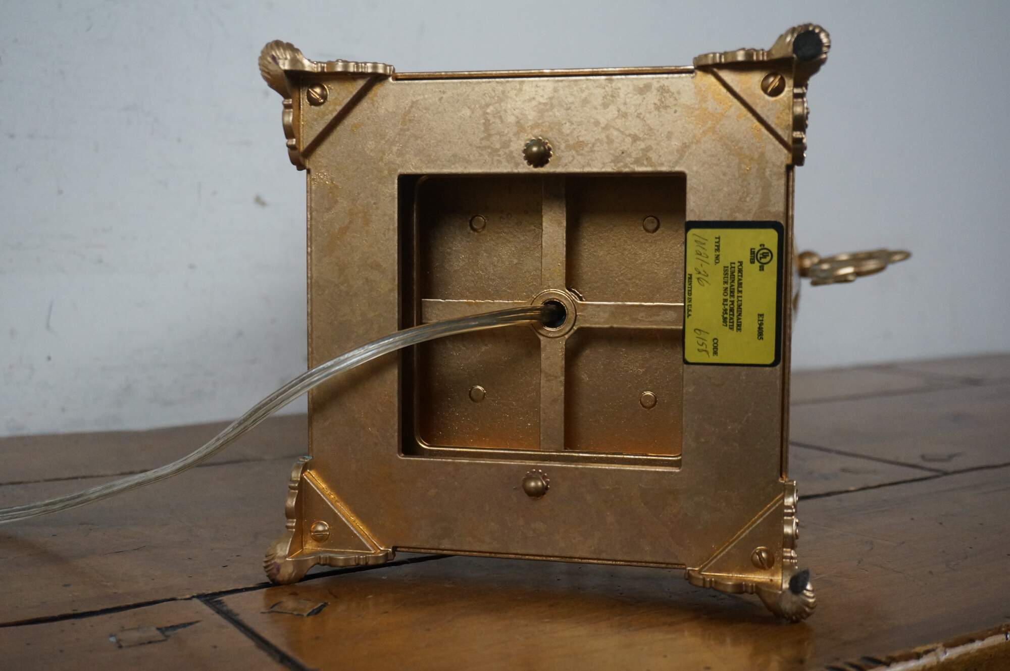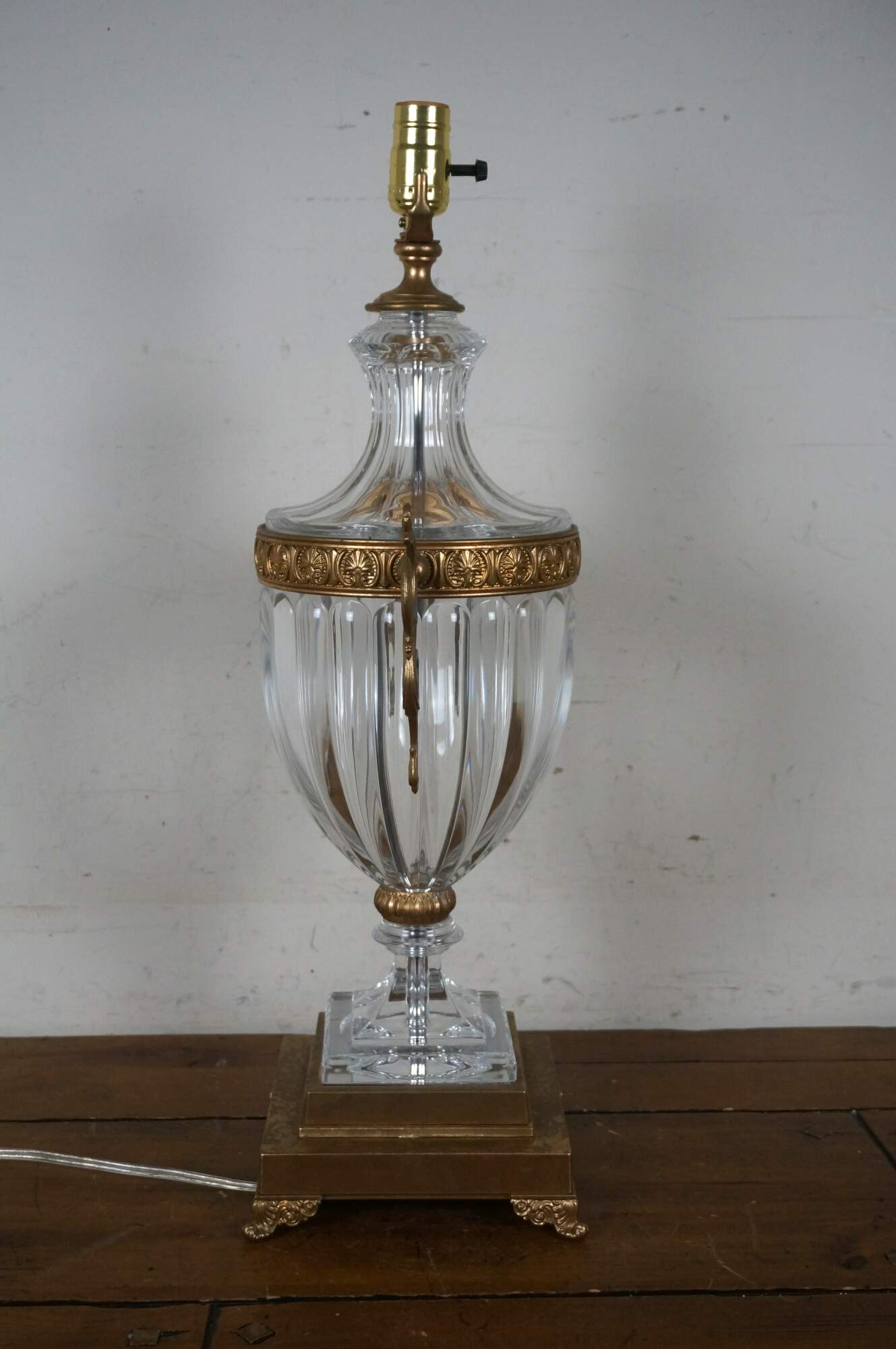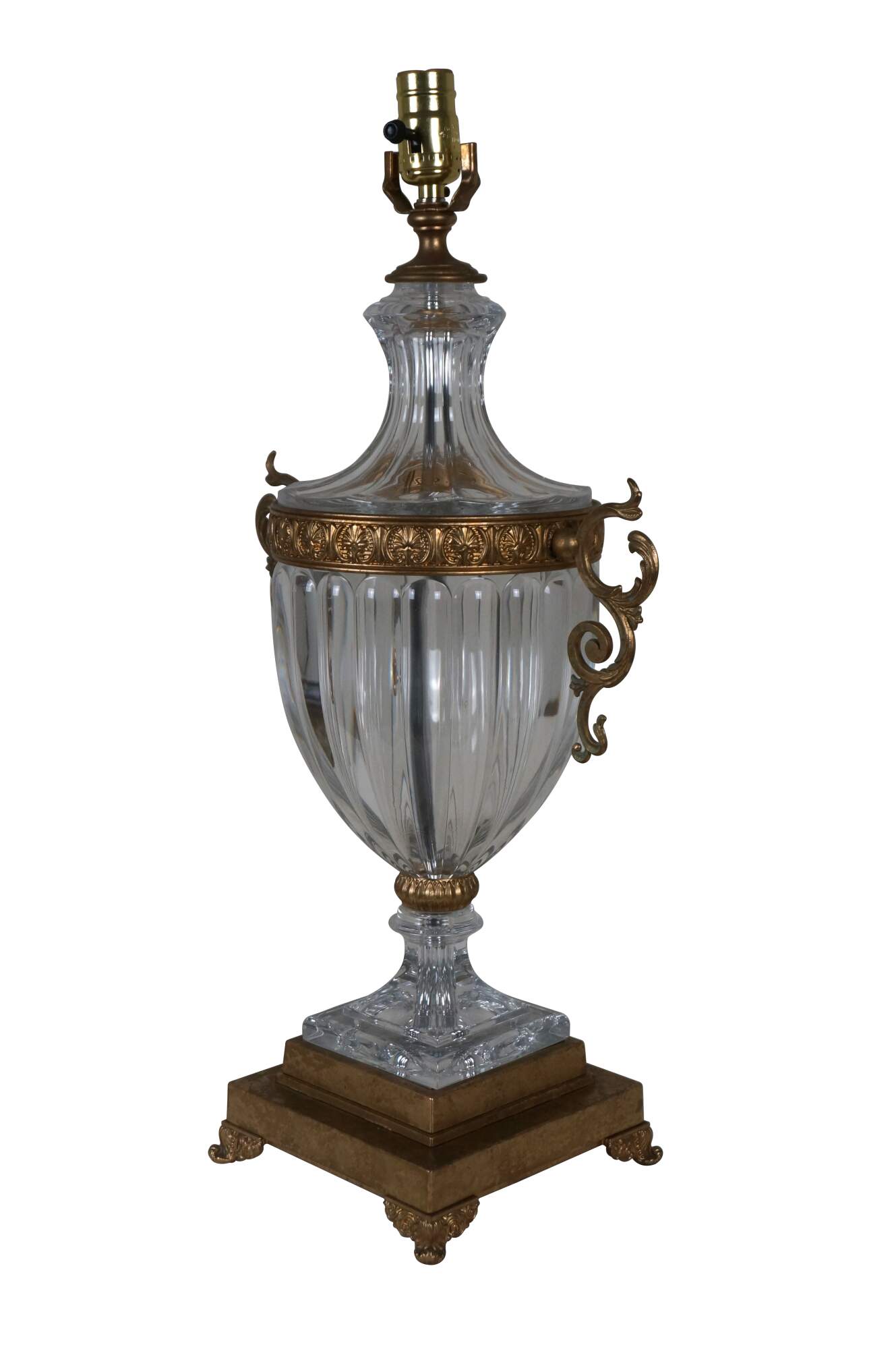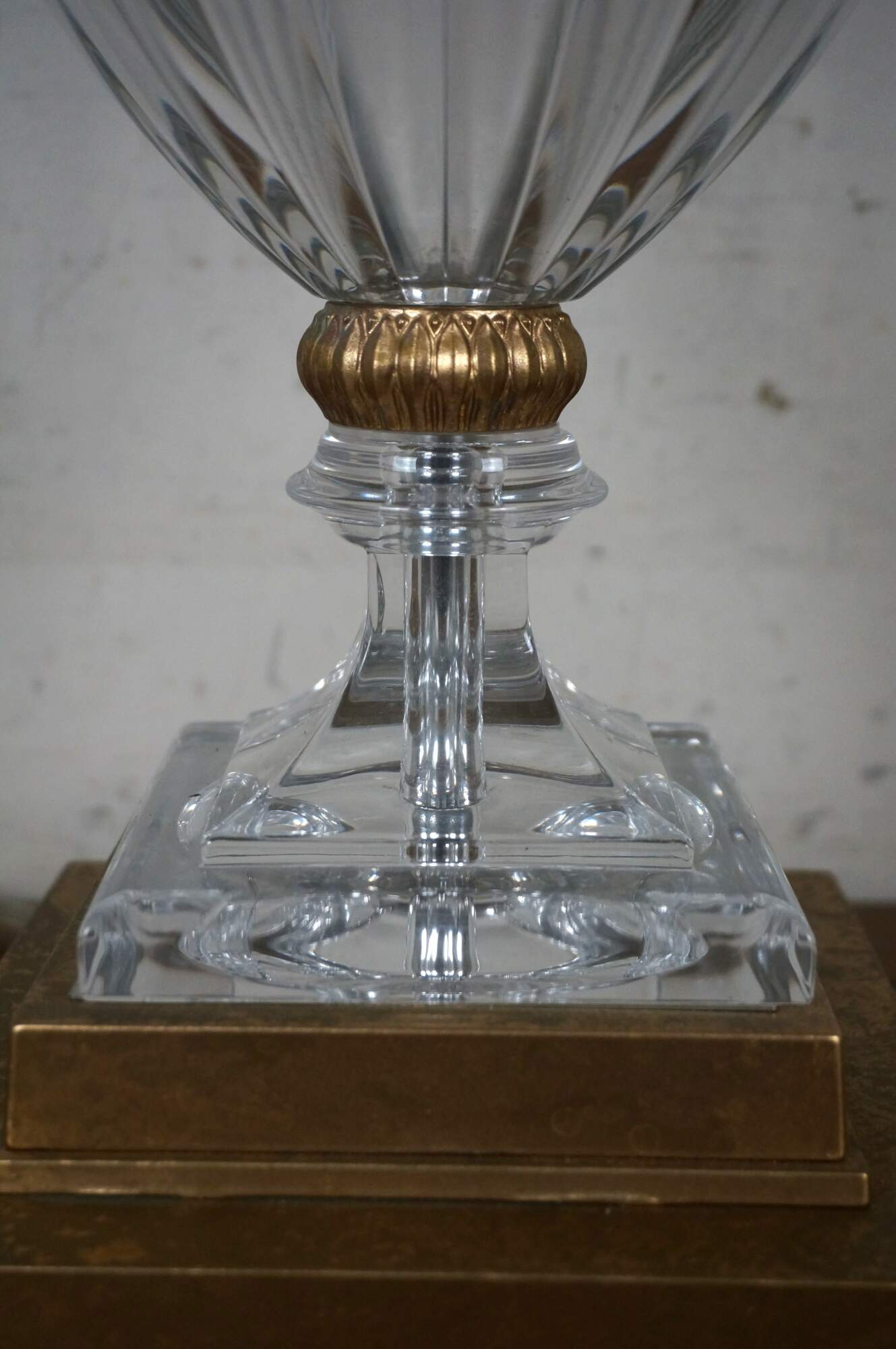 A large and impressive late 20th century fluted crystal trophy urn shaped table lamp featuring a square brass base with foliate feet, a scallop shell patterned band and scrolling foliate handles.