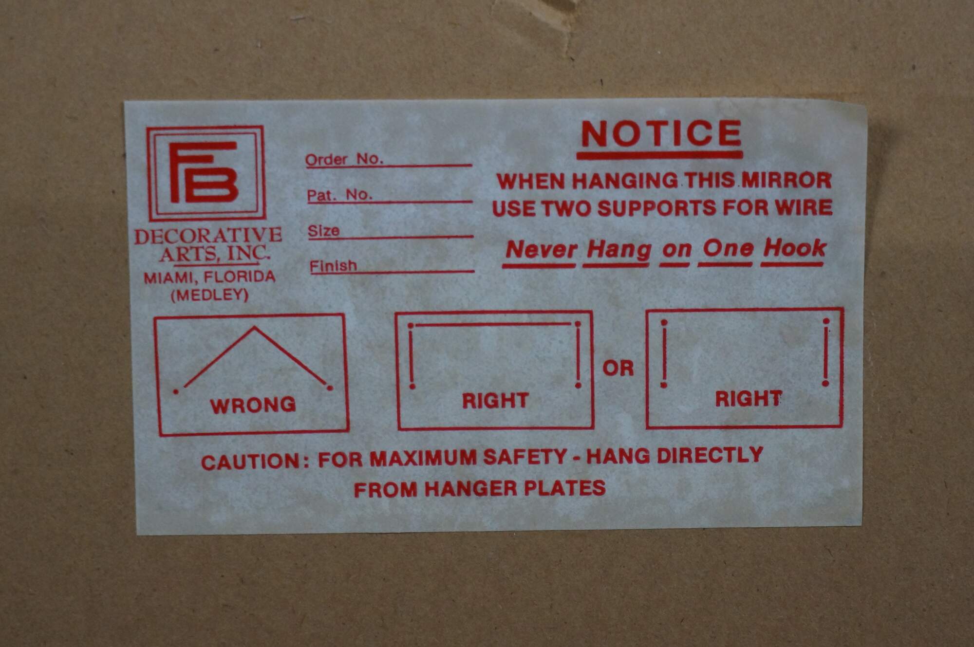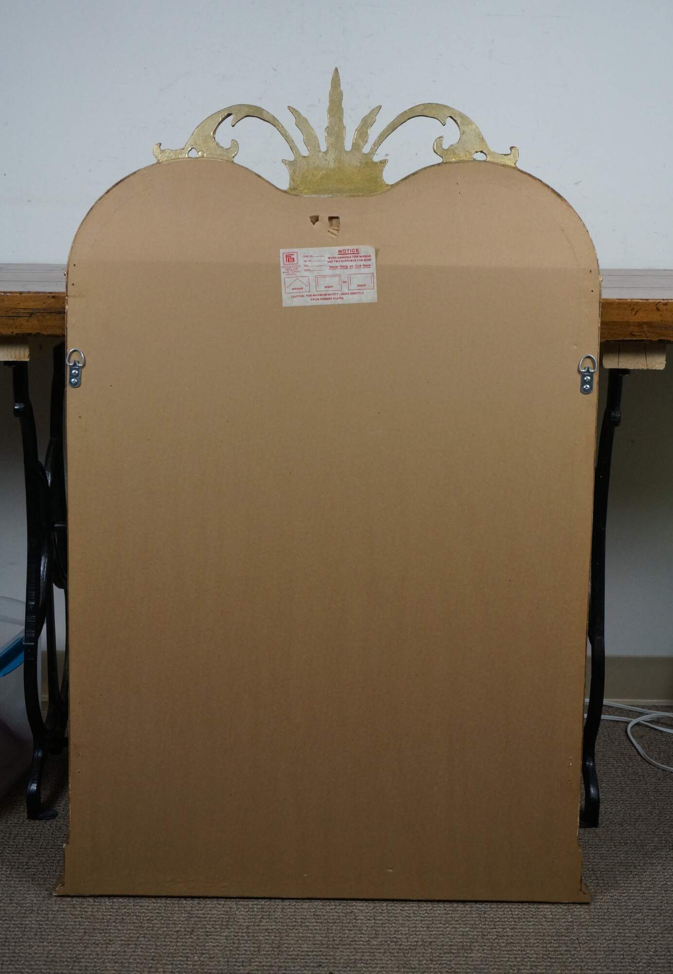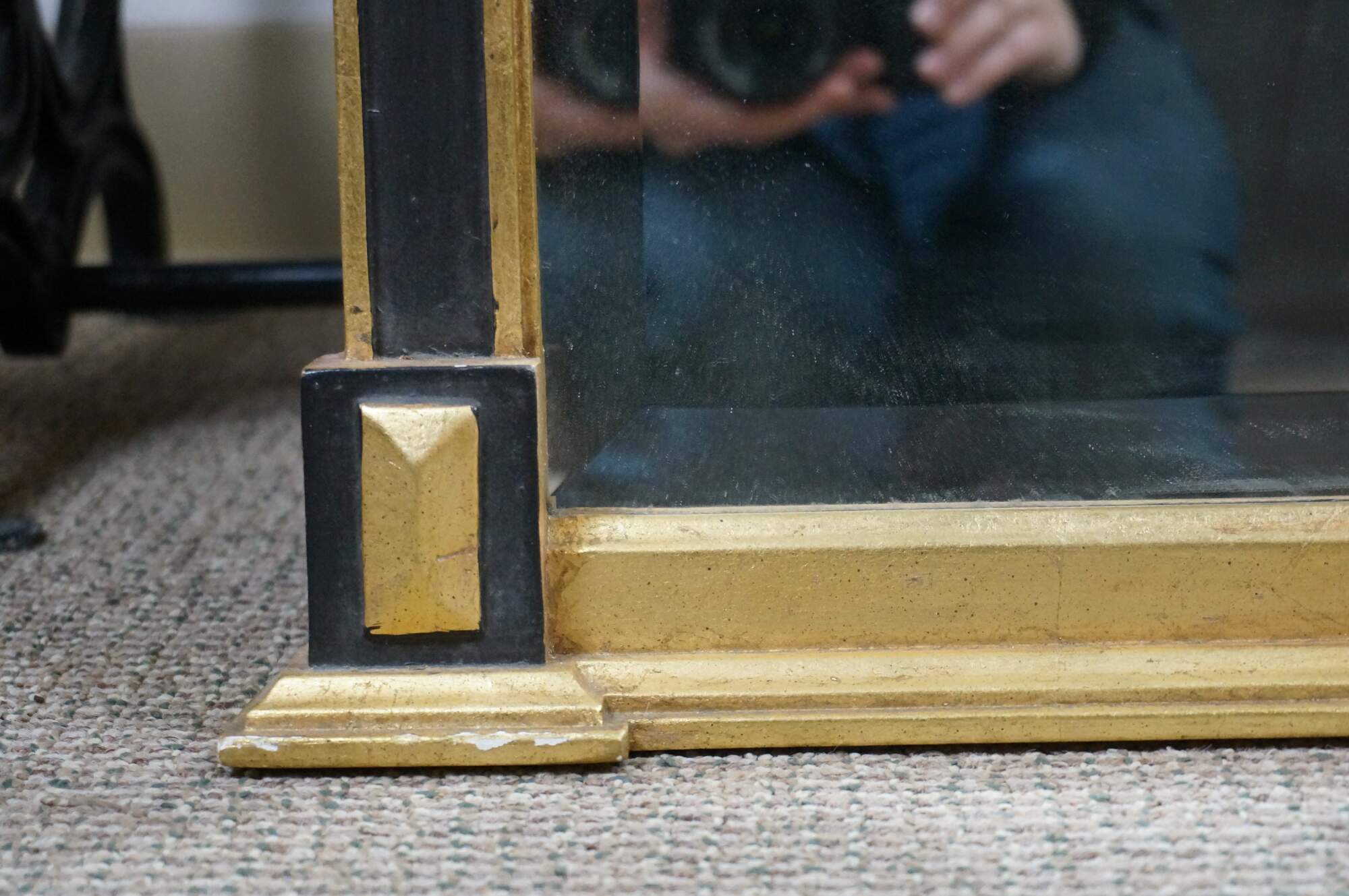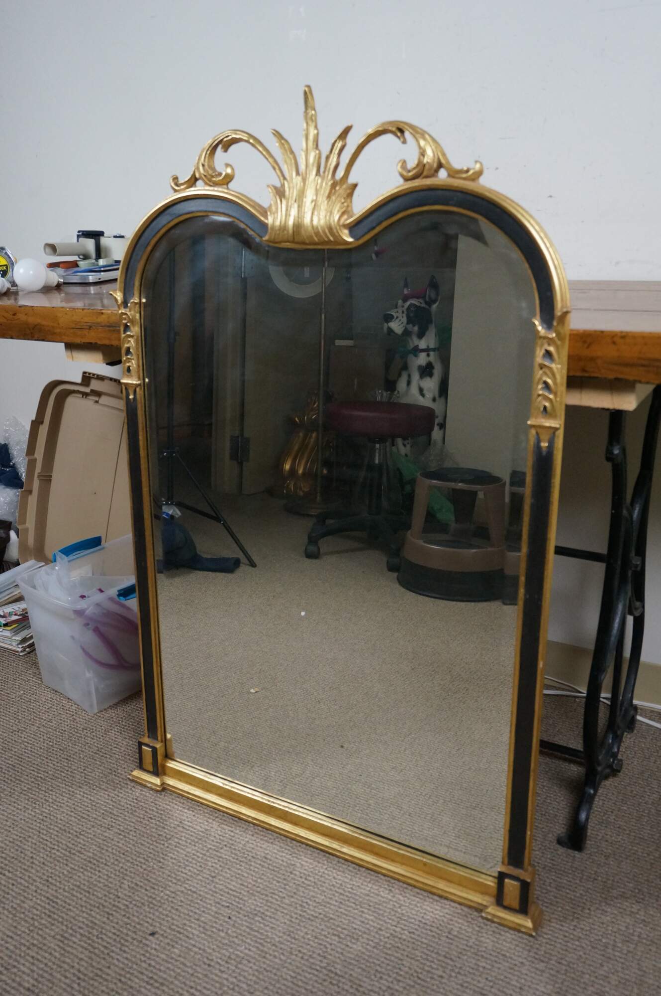 Late 20th century Empire / Hollywood Regency wall / vanity / mantel mirror by Friedman Brothers, Decorative Arts Inc; #1816-SB. Black and gold carved wood frame featuring a double arched top crowned with acanthus leaves. Beveled glass.