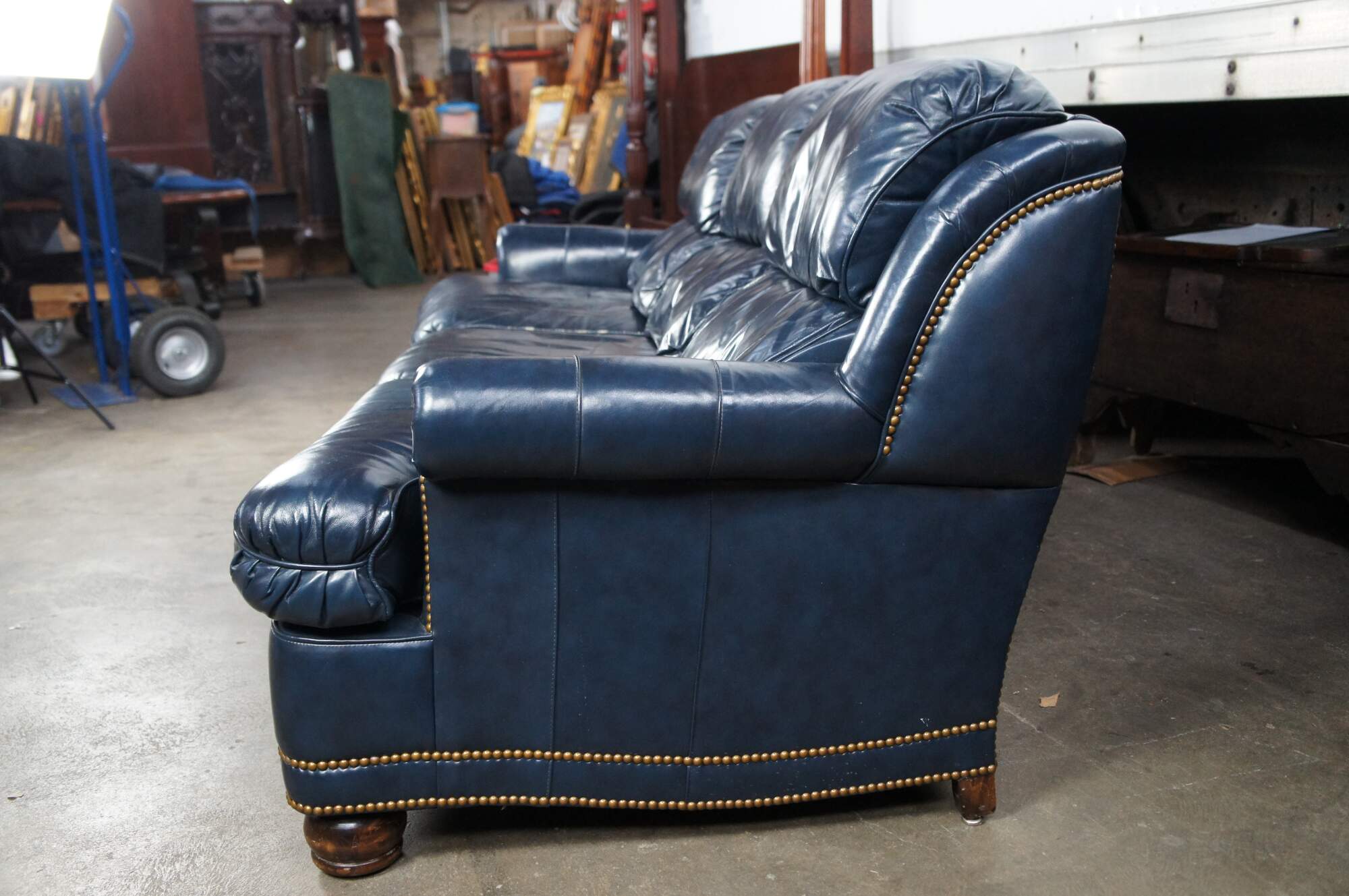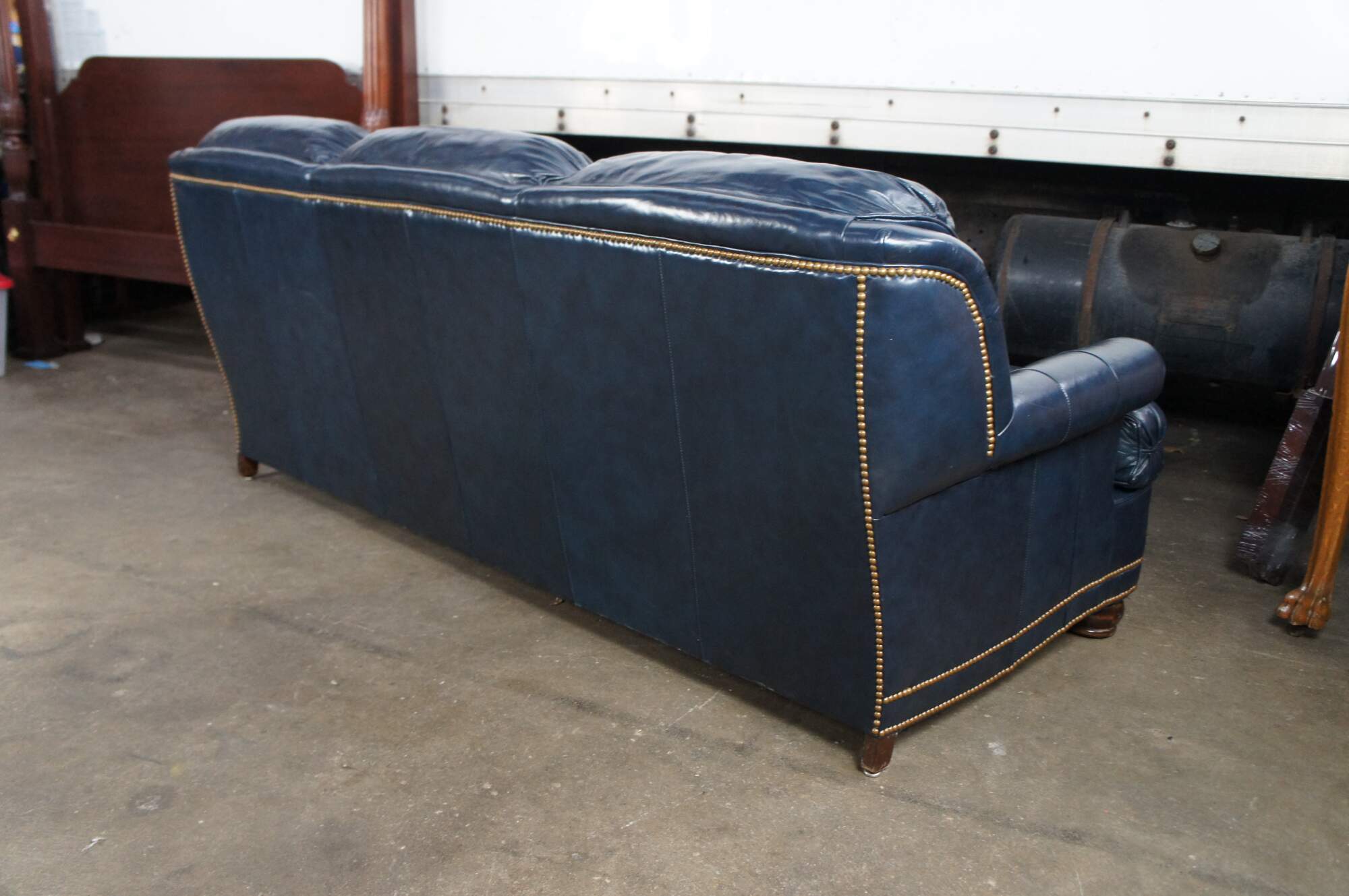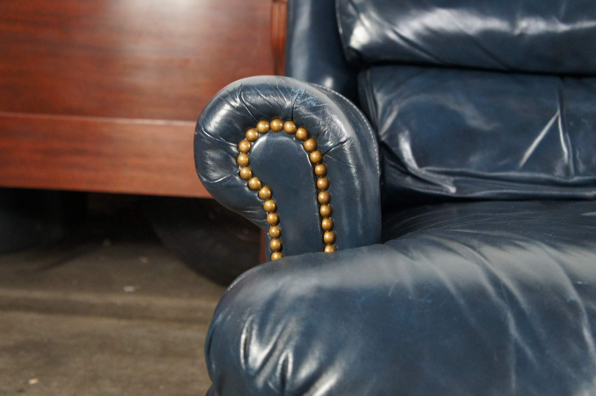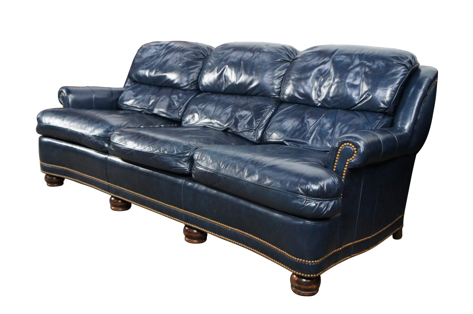 Early 21st Century Hancock & Moore Library Sofa. The Austin High Back Sofa features genuine Caress Dark Blue leather upholstery with rolled arms, brass nailhead trim and distressed walnut finished bun feet. #8138NB