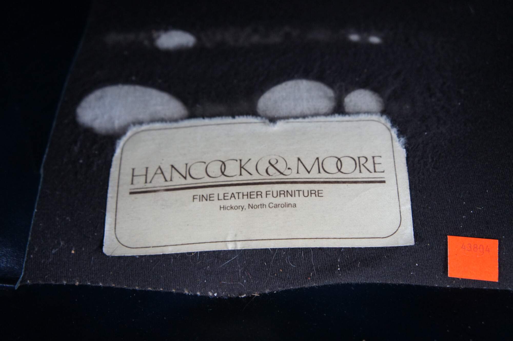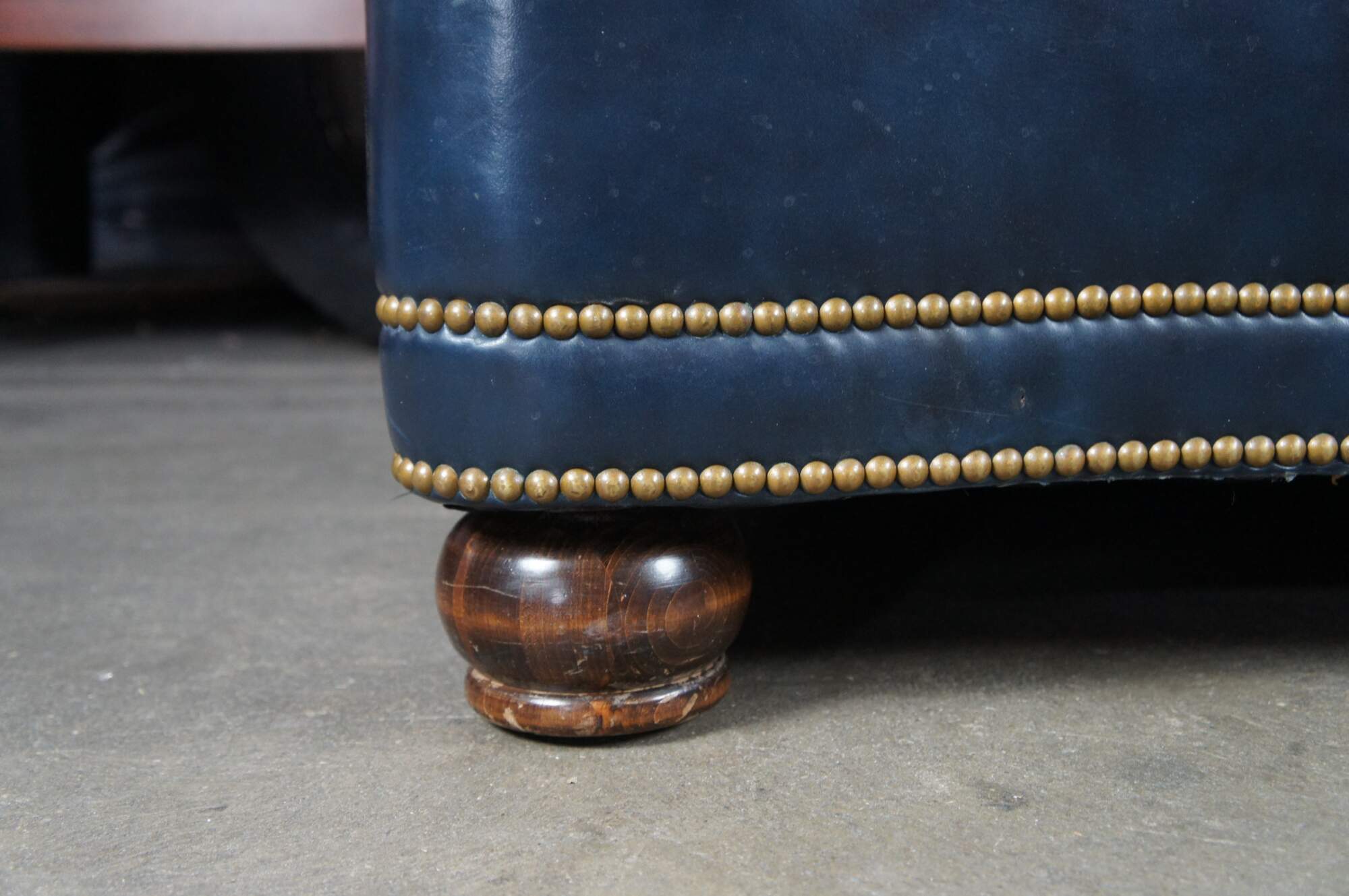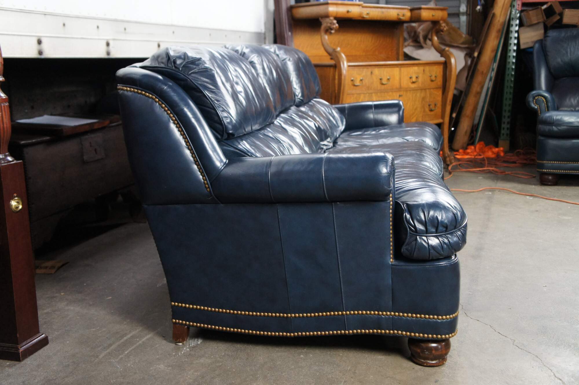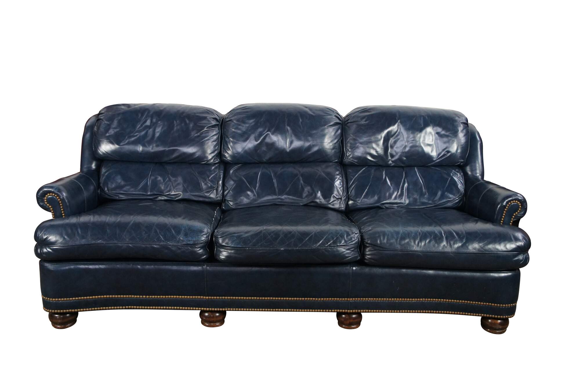 Early 21st Century Hancock & Moore Library Sofa. The Austin High Back Sofa features genuine Caress Dark Blue leather upholstery with rolled arms, brass nailhead trim and distressed walnut finished bun feet. #8138NB