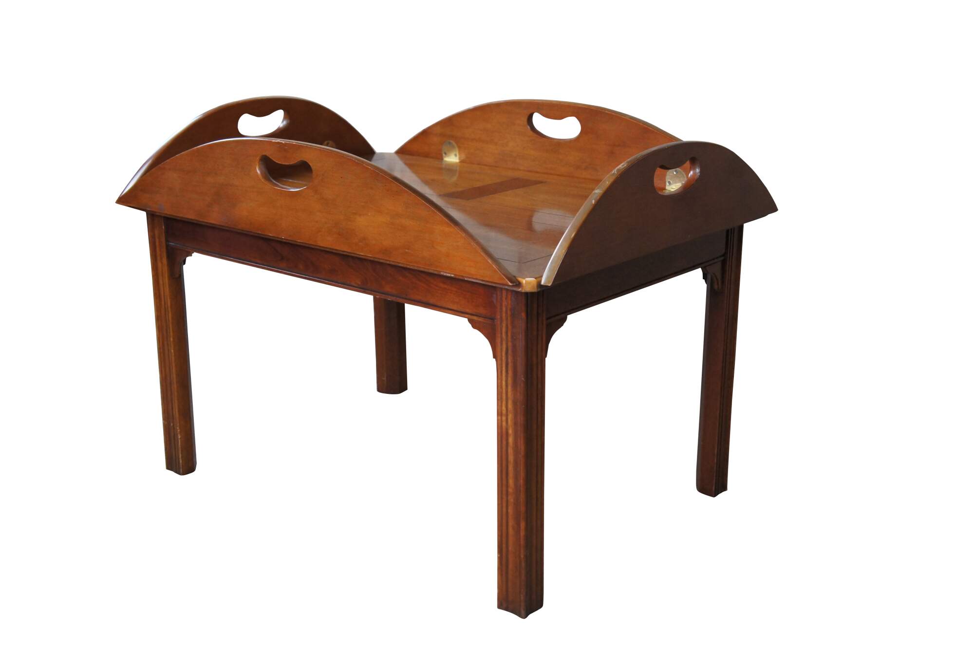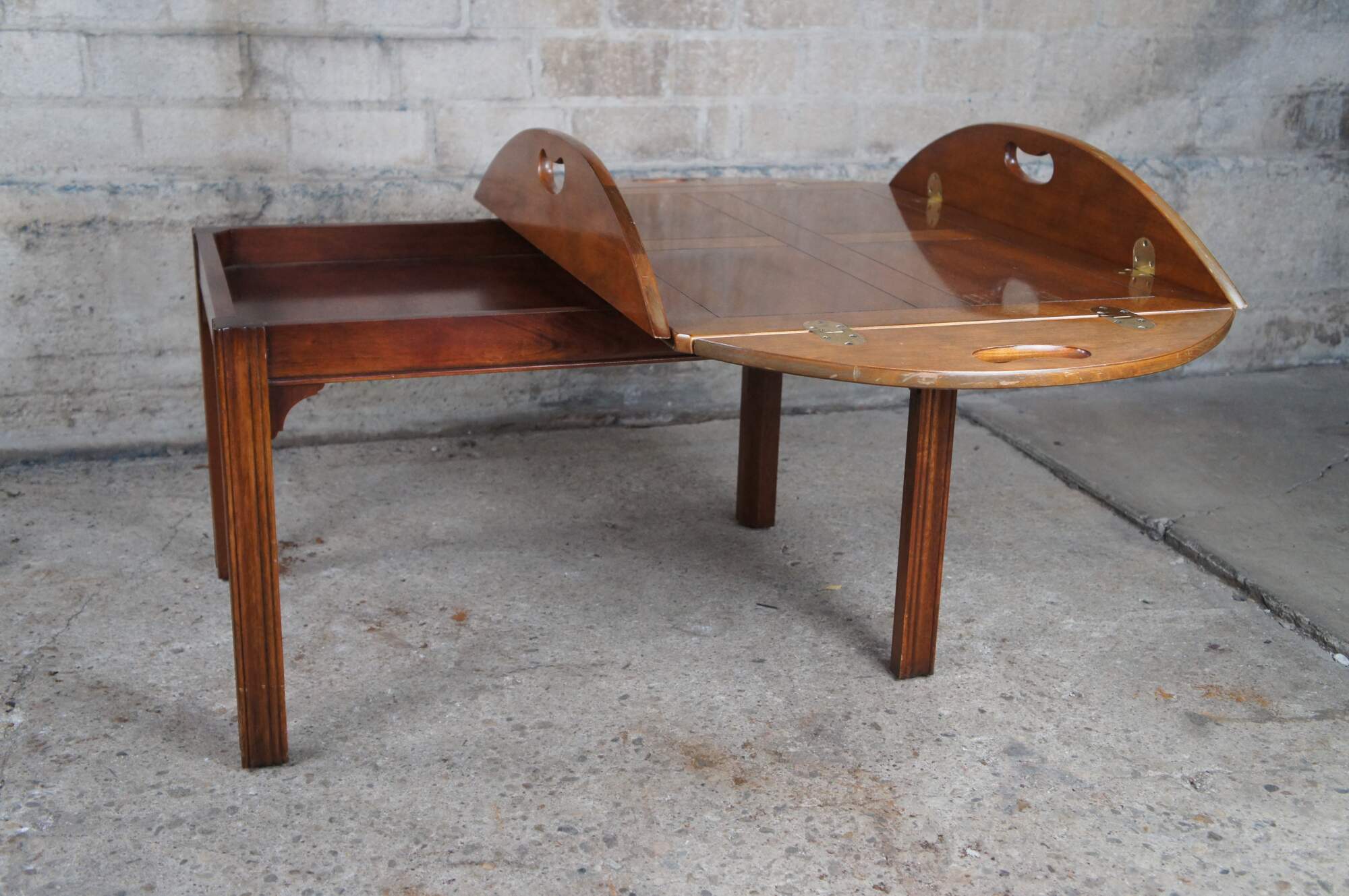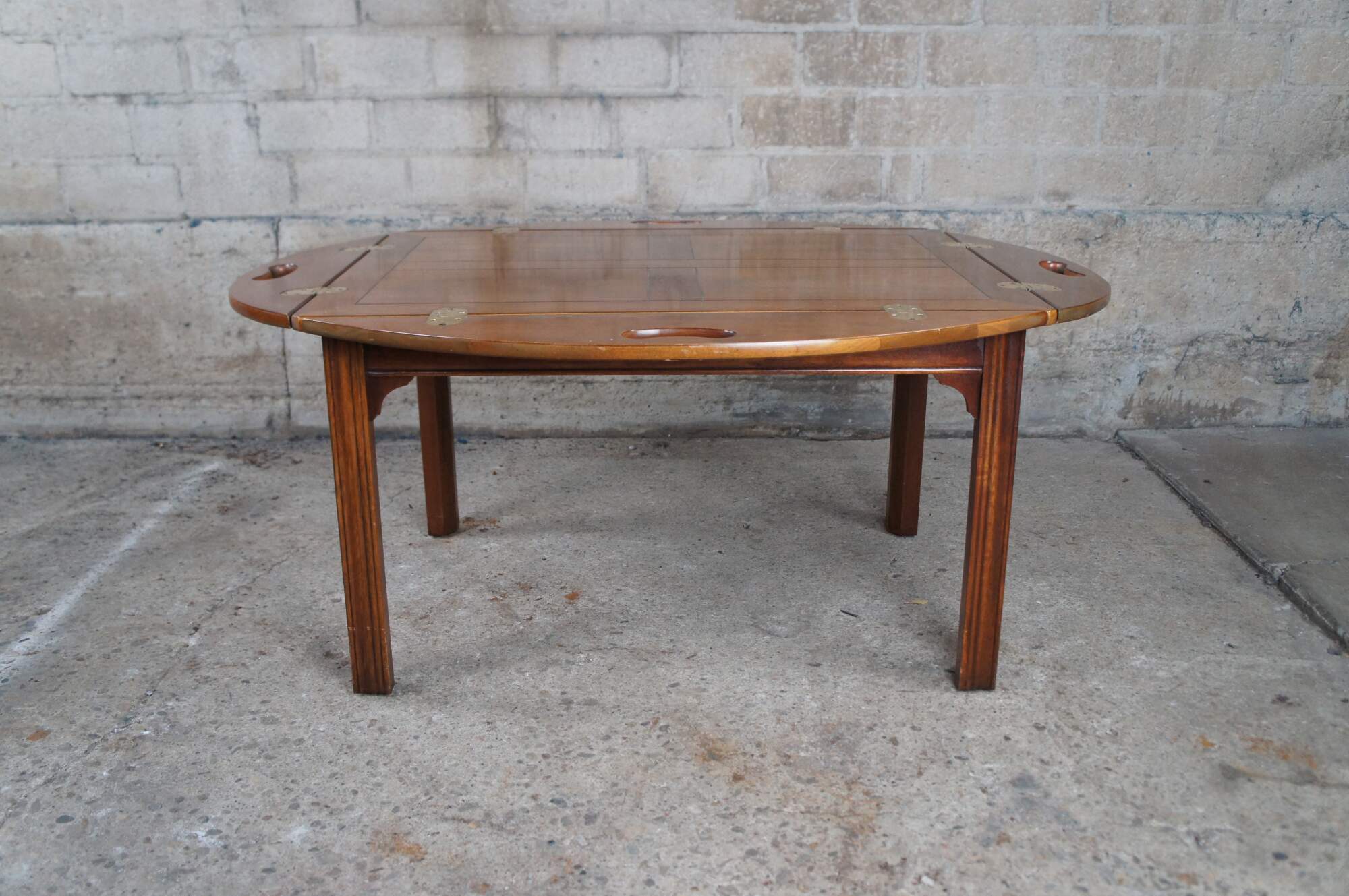 Baker Furniture English Chippendale Campaign Stye Butlers Tray Coffee Table, Circa 1980s. Features an oval form made from mahogany with brass hinges allowing the top to flip up and be carried as a tray separate for the base for serving purposes. The base is square with an inset top allowing for small things like a magazine to be stored beneath the top when in place. The base is supported by square legs, chamfered along the back with fluting on the front sides. A contoured spandrel connects the leg and table rail. Marked along the bottom with Bakers silver metal plate.