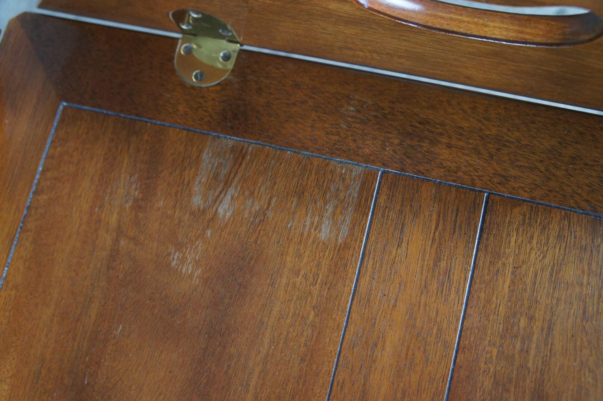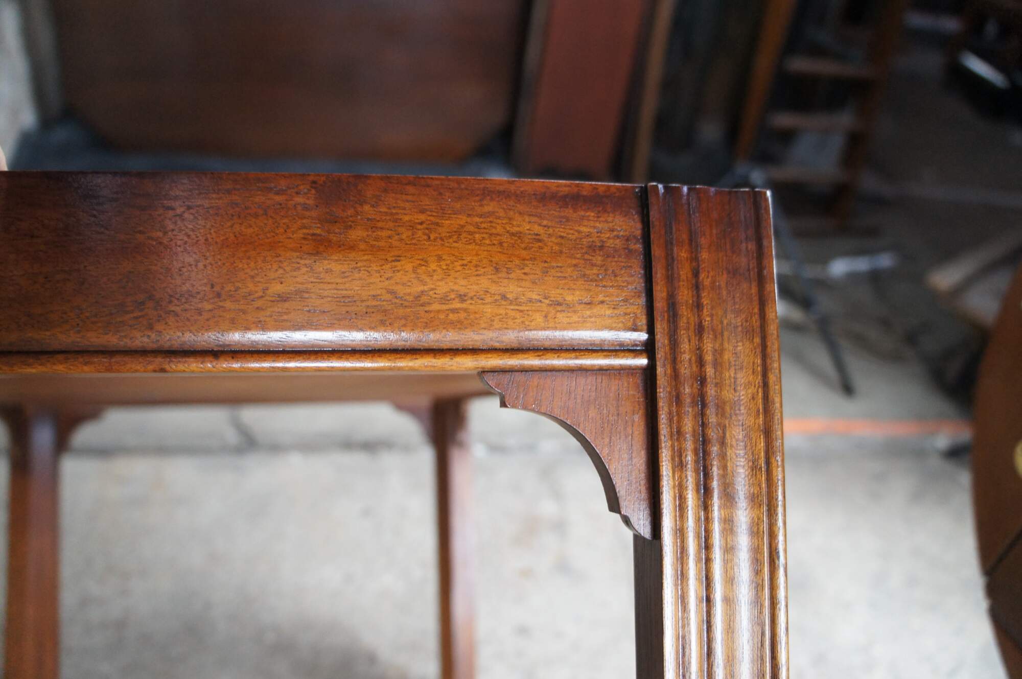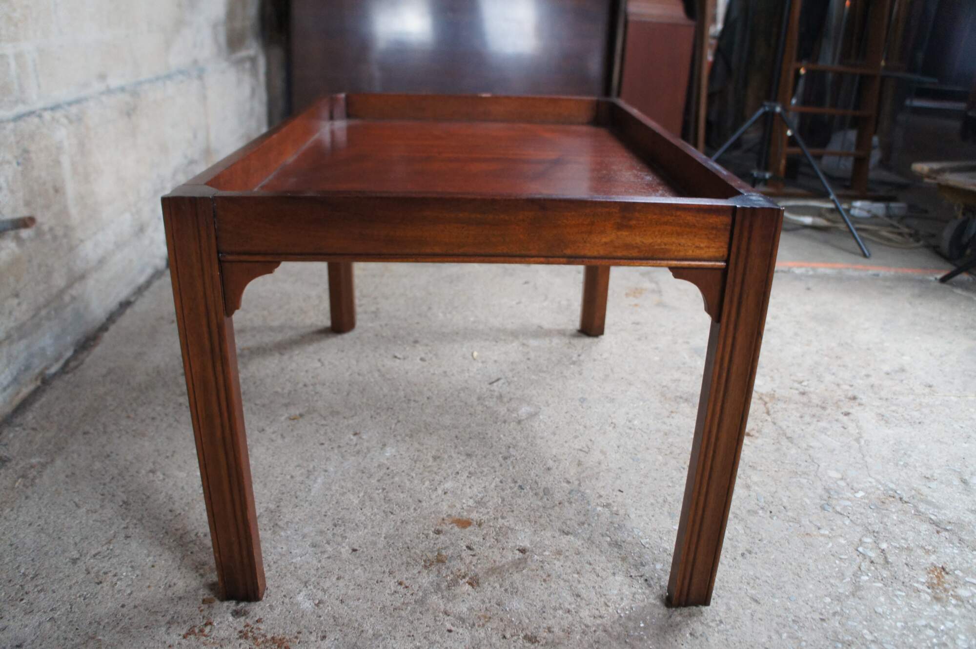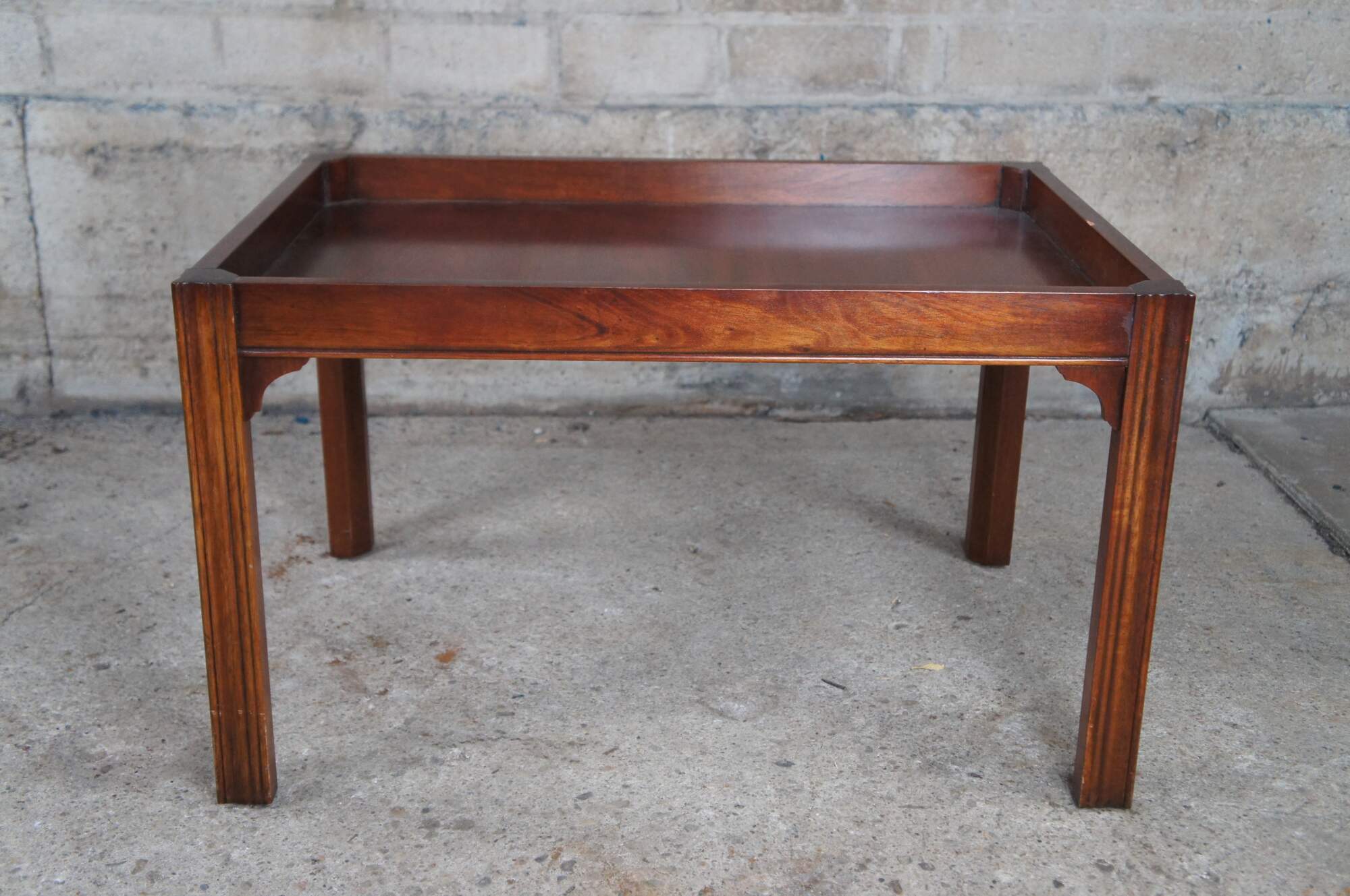 Baker Furniture English Chippendale Campaign Stye Butlers Tray Coffee Table, Circa 1980s. Features an oval form made from mahogany with brass hinges allowing the top to flip up and be carried as a tray separate for the base for serving purposes. The base is square with an inset top allowing for small things like a magazine to be stored beneath the top when in place. The base is supported by square legs, chamfered along the back with fluting on the front sides. A contoured spandrel connects the leg and table rail. Marked along the bottom with Bakers silver metal plate.