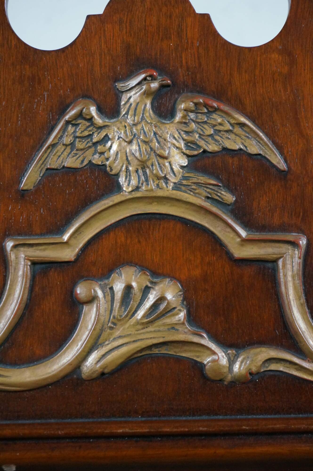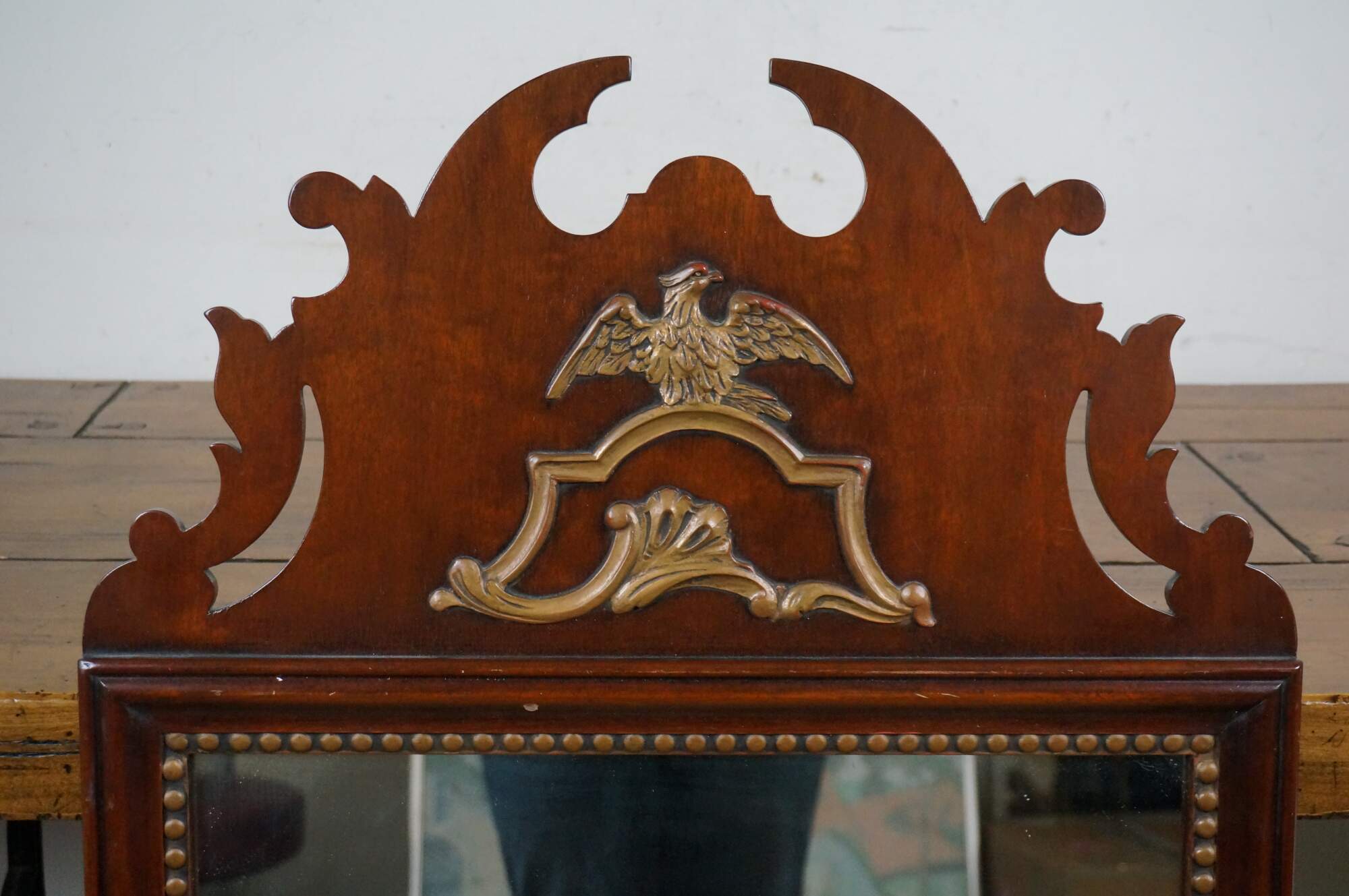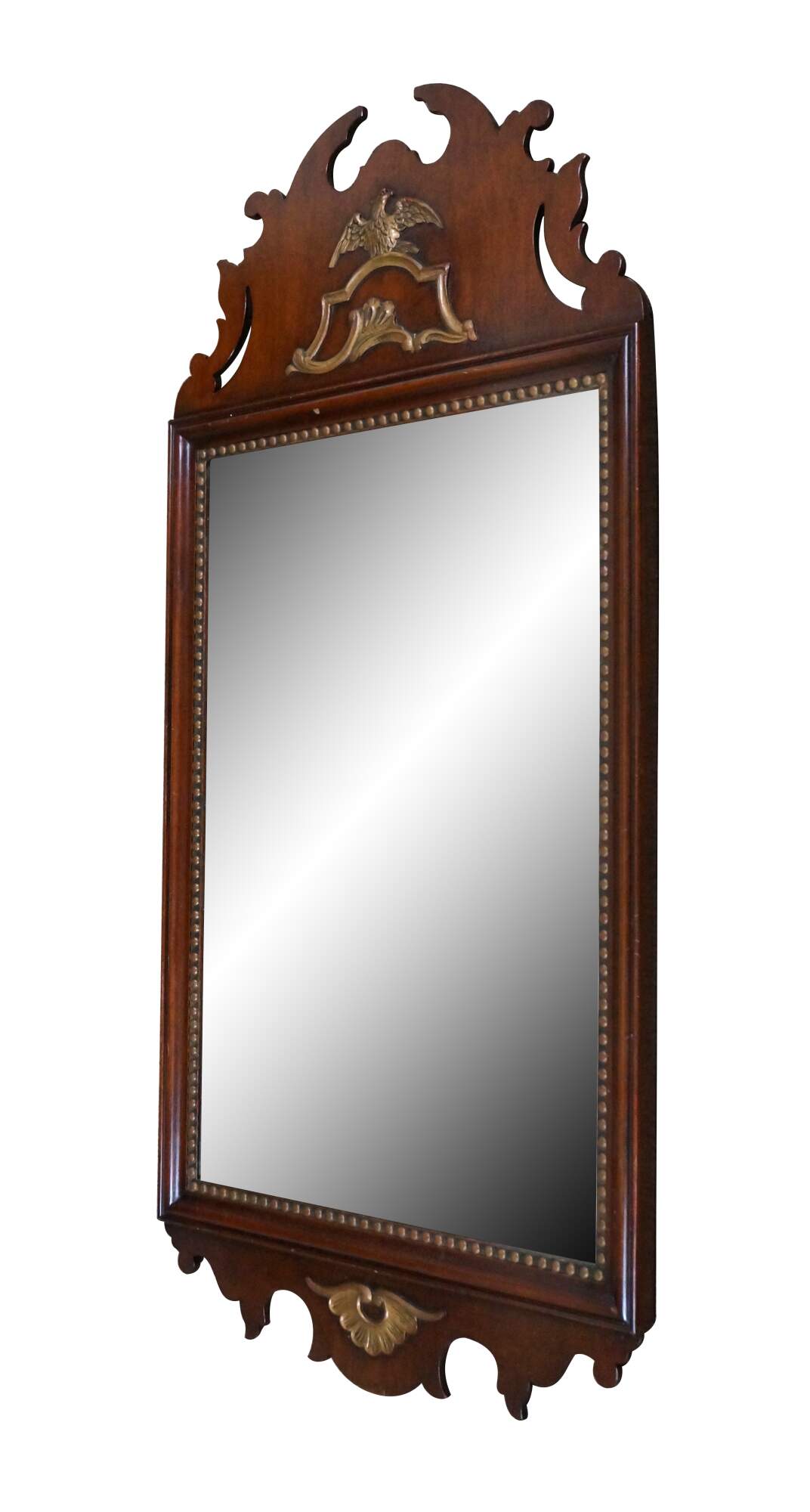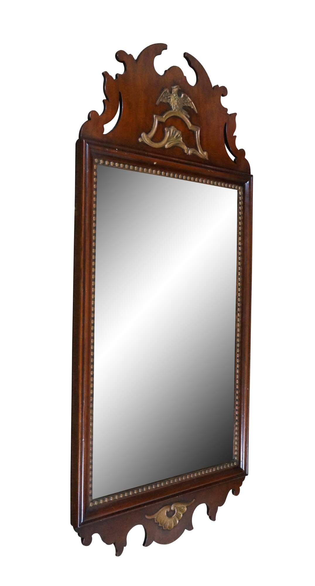 Vintage Kindel Oxford chippendale / Federal style wall mirror. Mahogany frame with elaborate cut-out crest, accented with a gilt scallop shell at the bottom and a Federal style eagle over leaves at the top, as well as gilt beaded trim around the glass. #166-62.