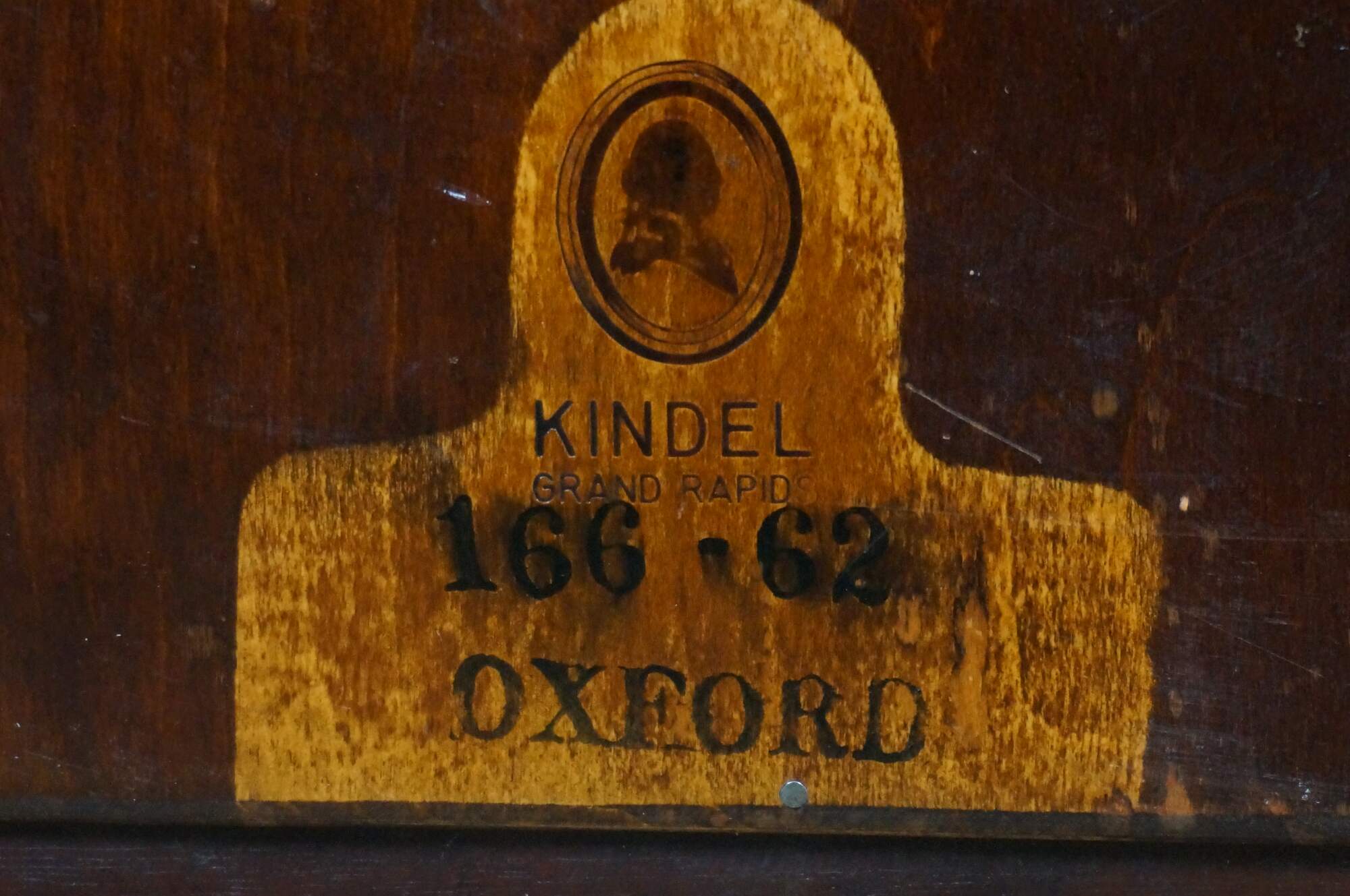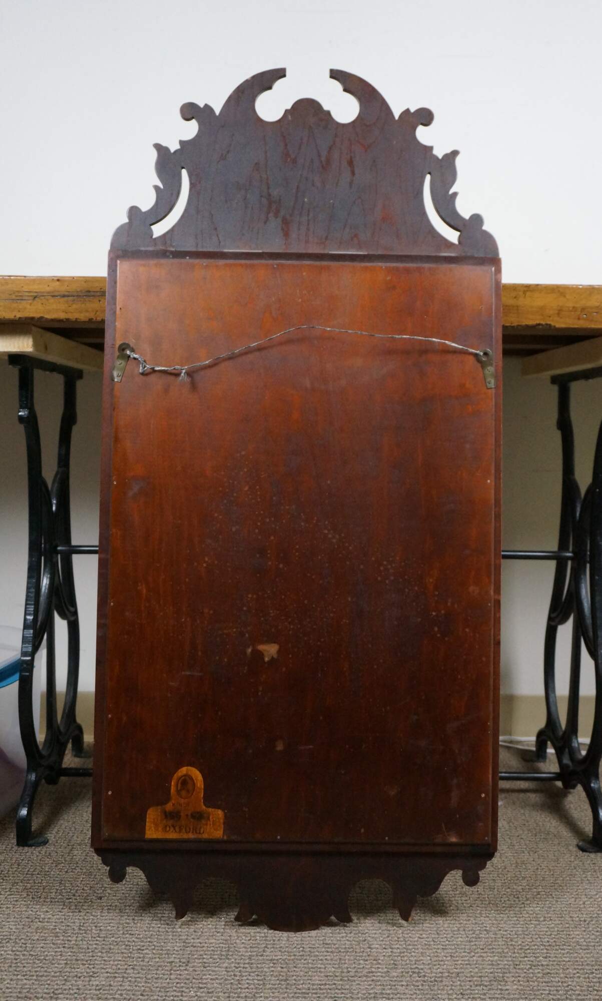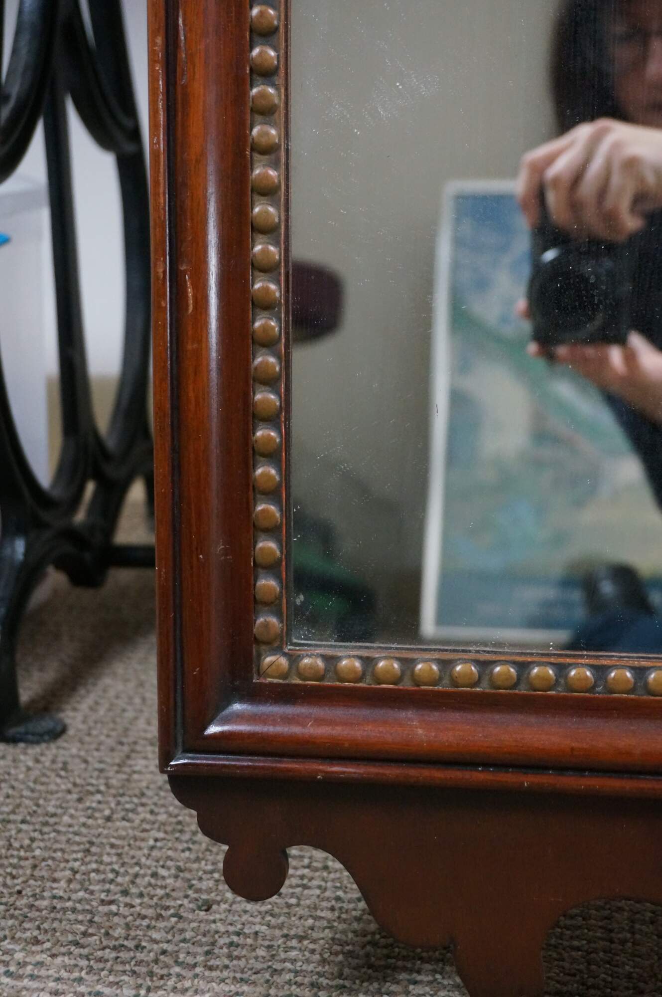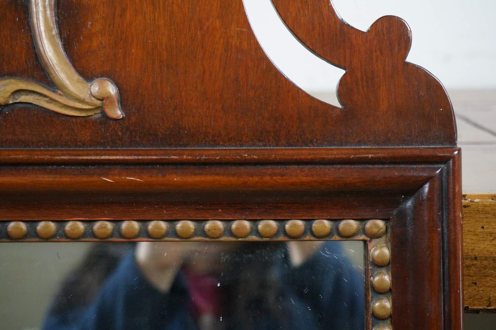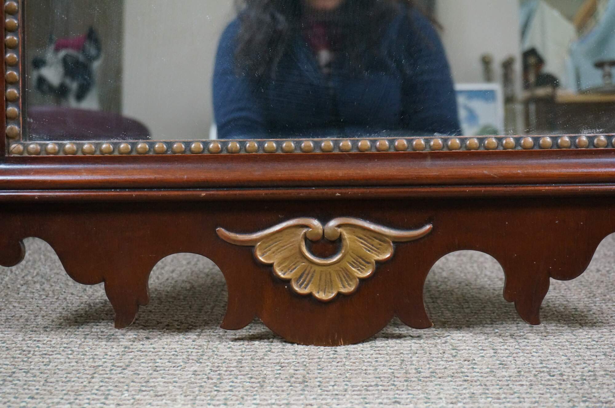 Vintage Kindel Oxford chippendale / Federal style wall mirror. Mahogany frame with elaborate cut-out crest, accented with a gilt scallop shell at the bottom and a Federal style eagle over leaves at the top, as well as gilt beaded trim around the glass. #166-62.