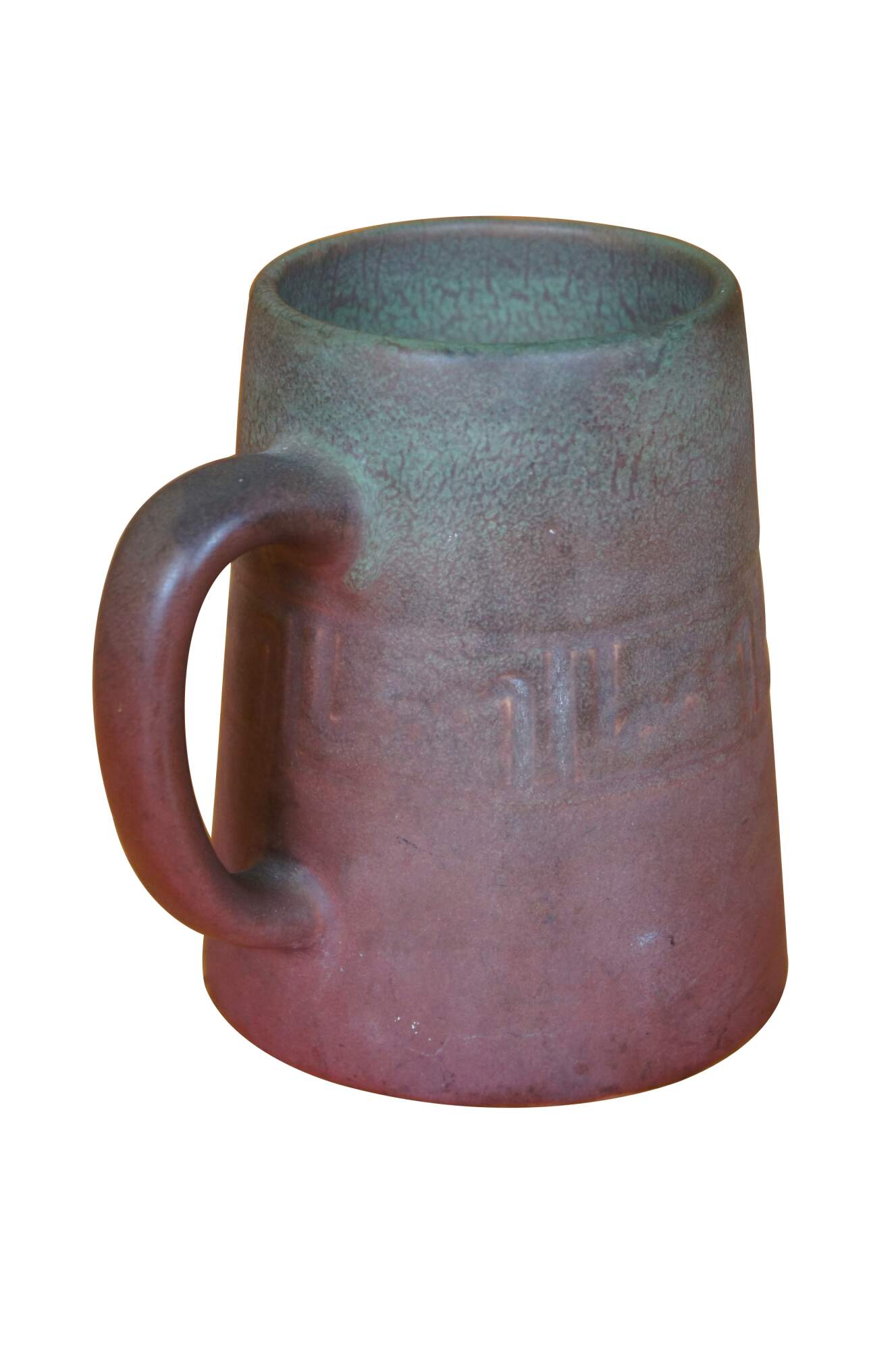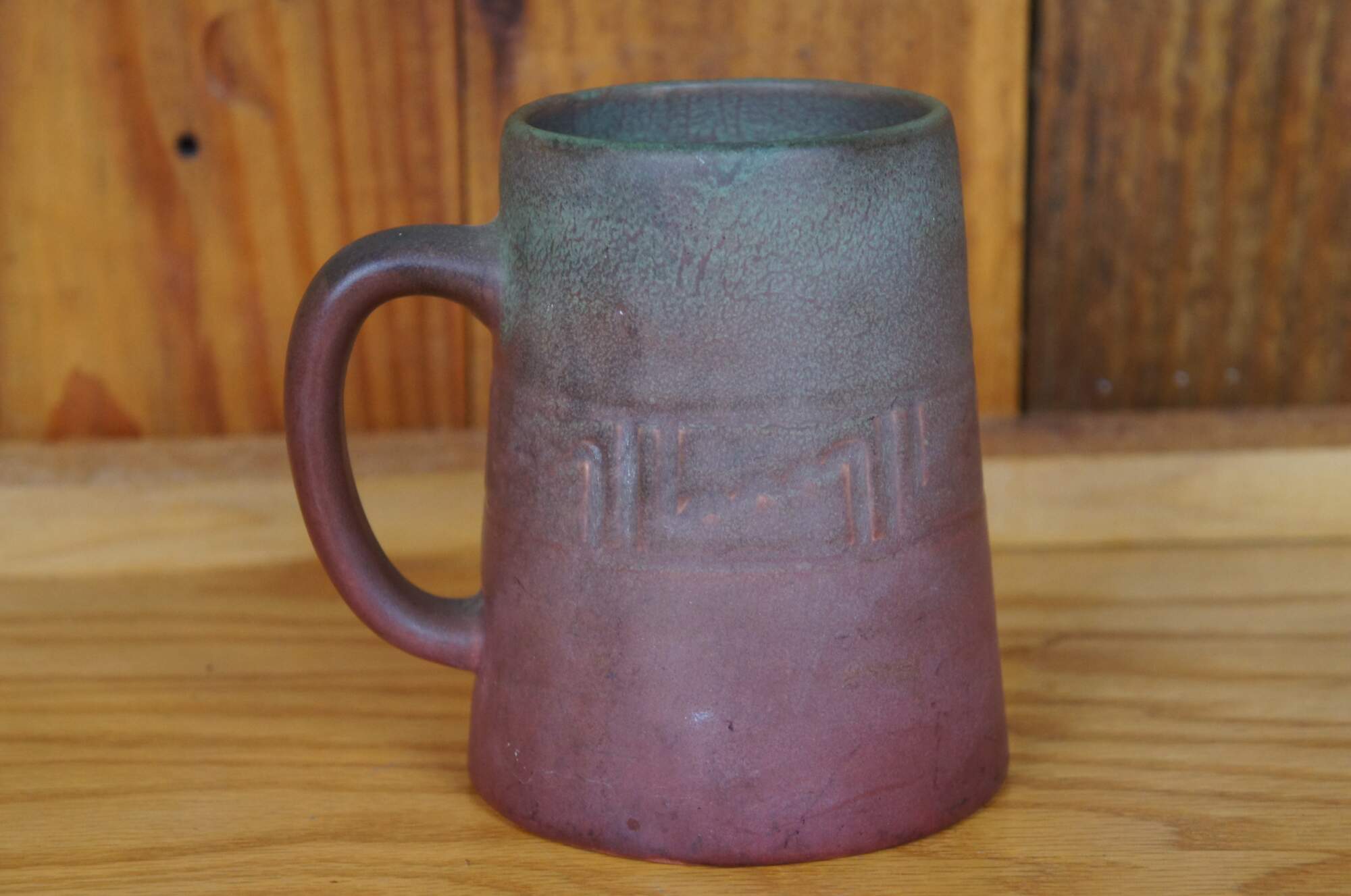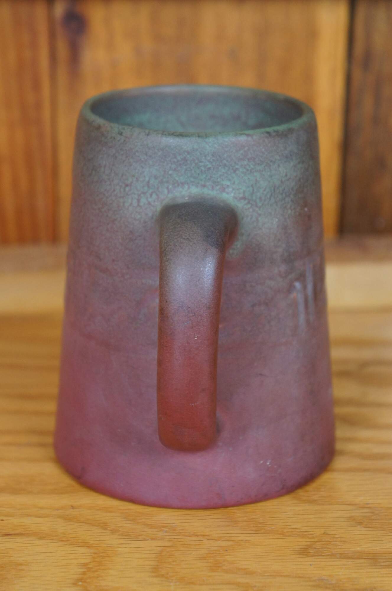 Antique Rookwood arts & crafts / art nouveau vellum glaze mug / stein featuring a mottled purple and blue undertone matte glaze cup with handle. Circa VII 1905, shape 587, size C.