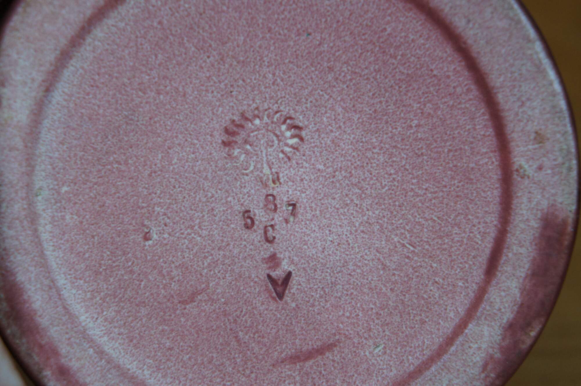 The letter “V” was impressed in the base to denote vellum glaze, a transparent matte glaze introduced in 1904 which enjoys enduring popularity.