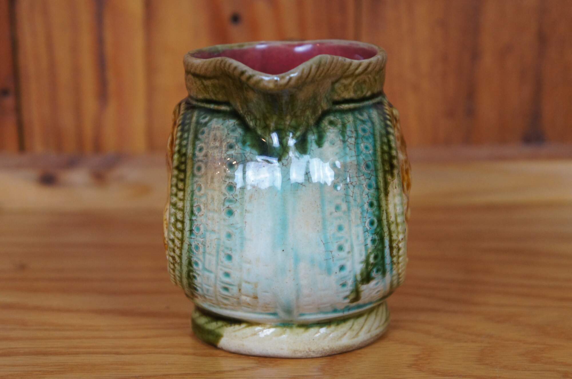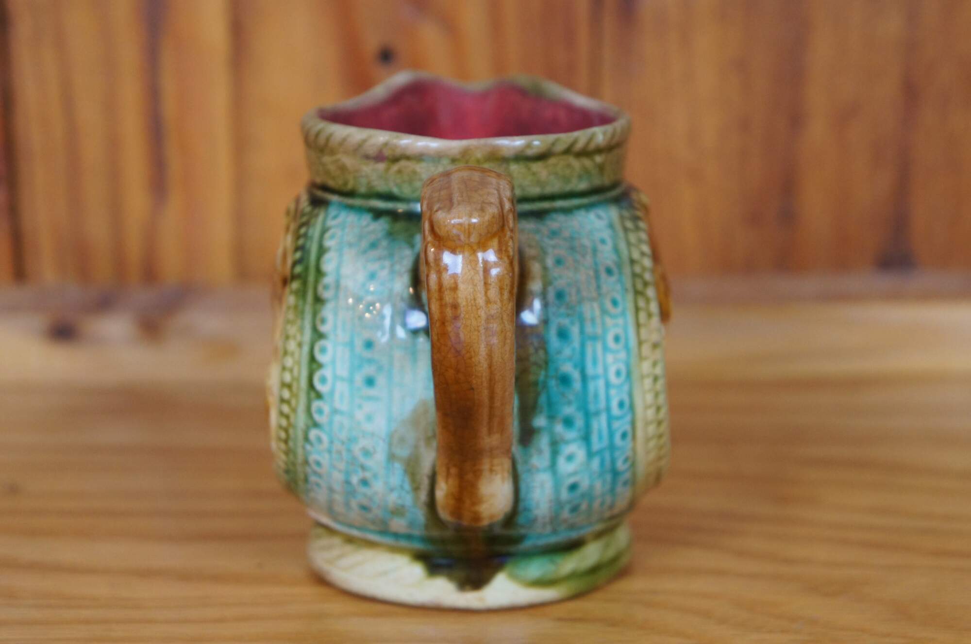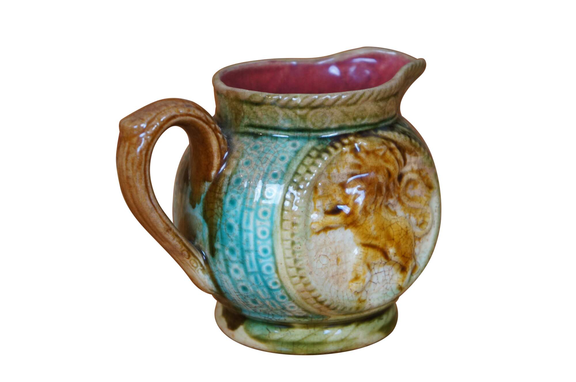 Antique Frie Onnaing Majolica pitcher featuring polychrome glaze with a heraldic lion on each side..