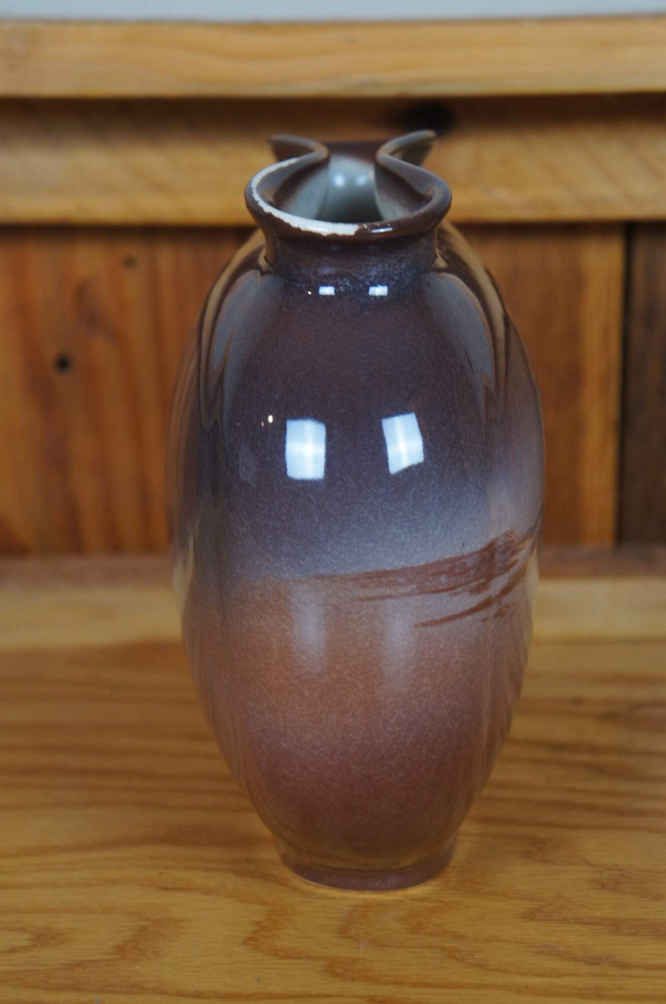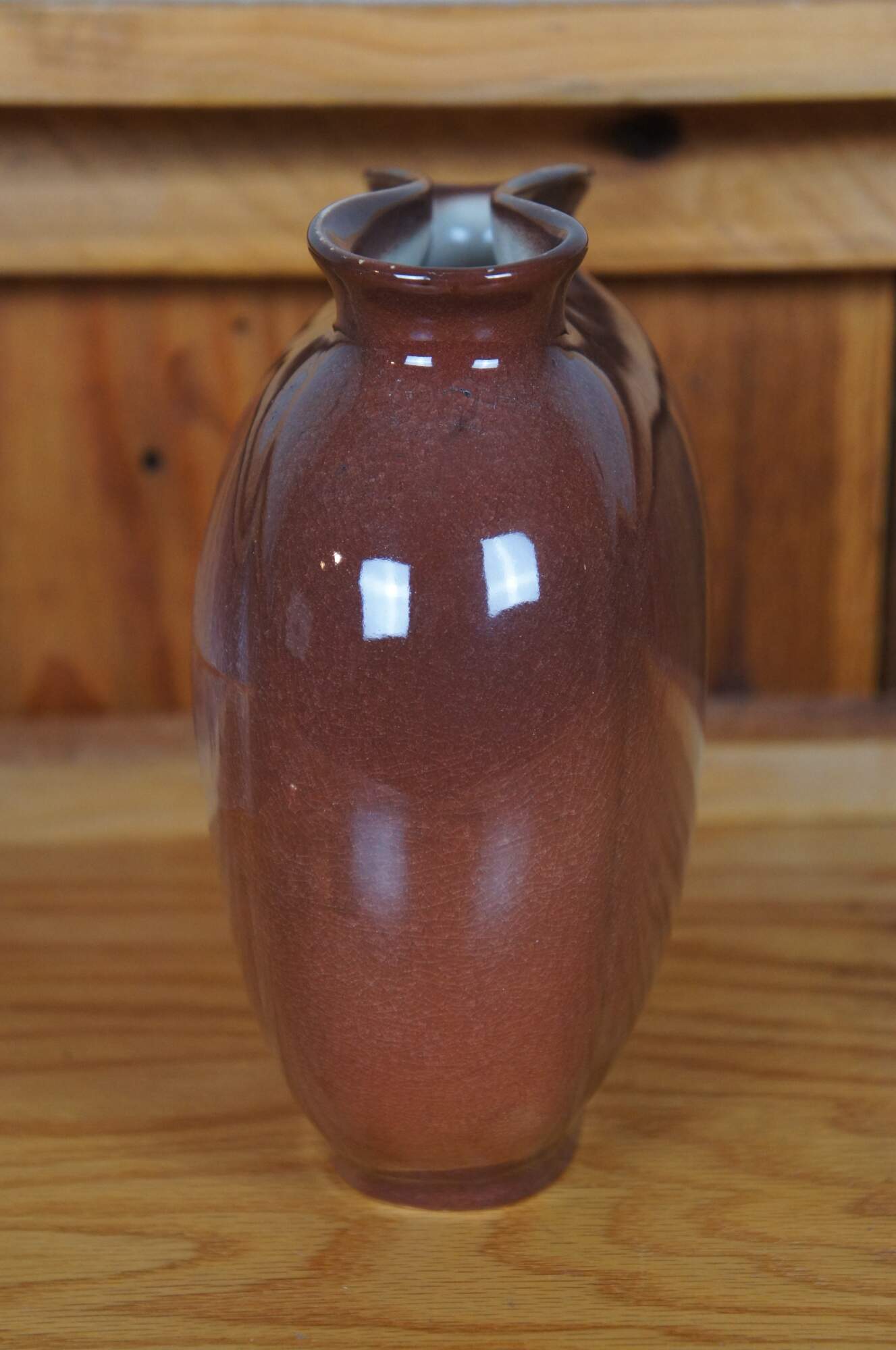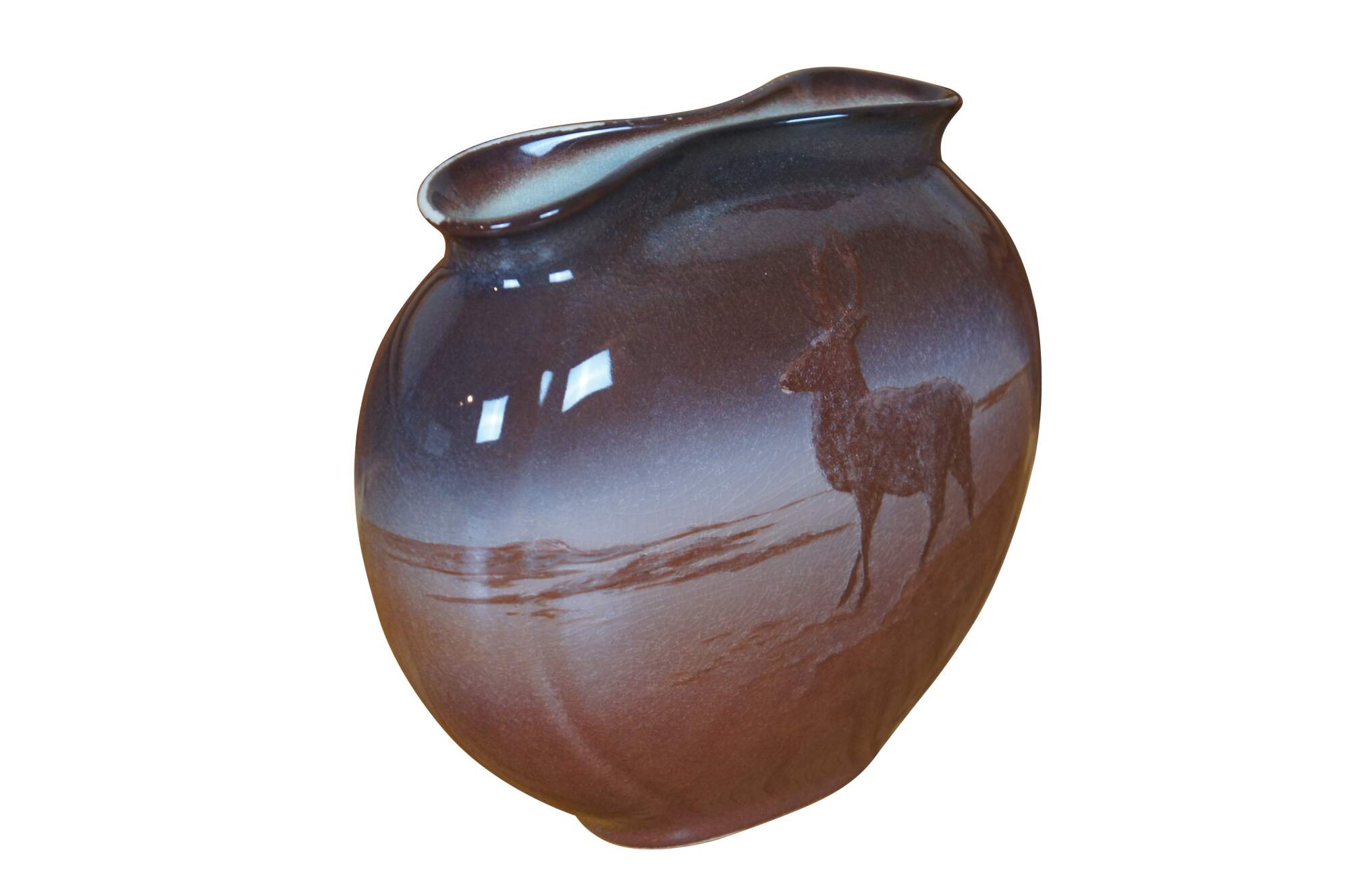 Antique Rookwood Kataro Shirayamadani mantel / pillow vase featuring a scenic Native American hunt design with moose / elk / stag / deer against a desert landscape. Shape code 707, Size A, signed in Japanese by artist.
