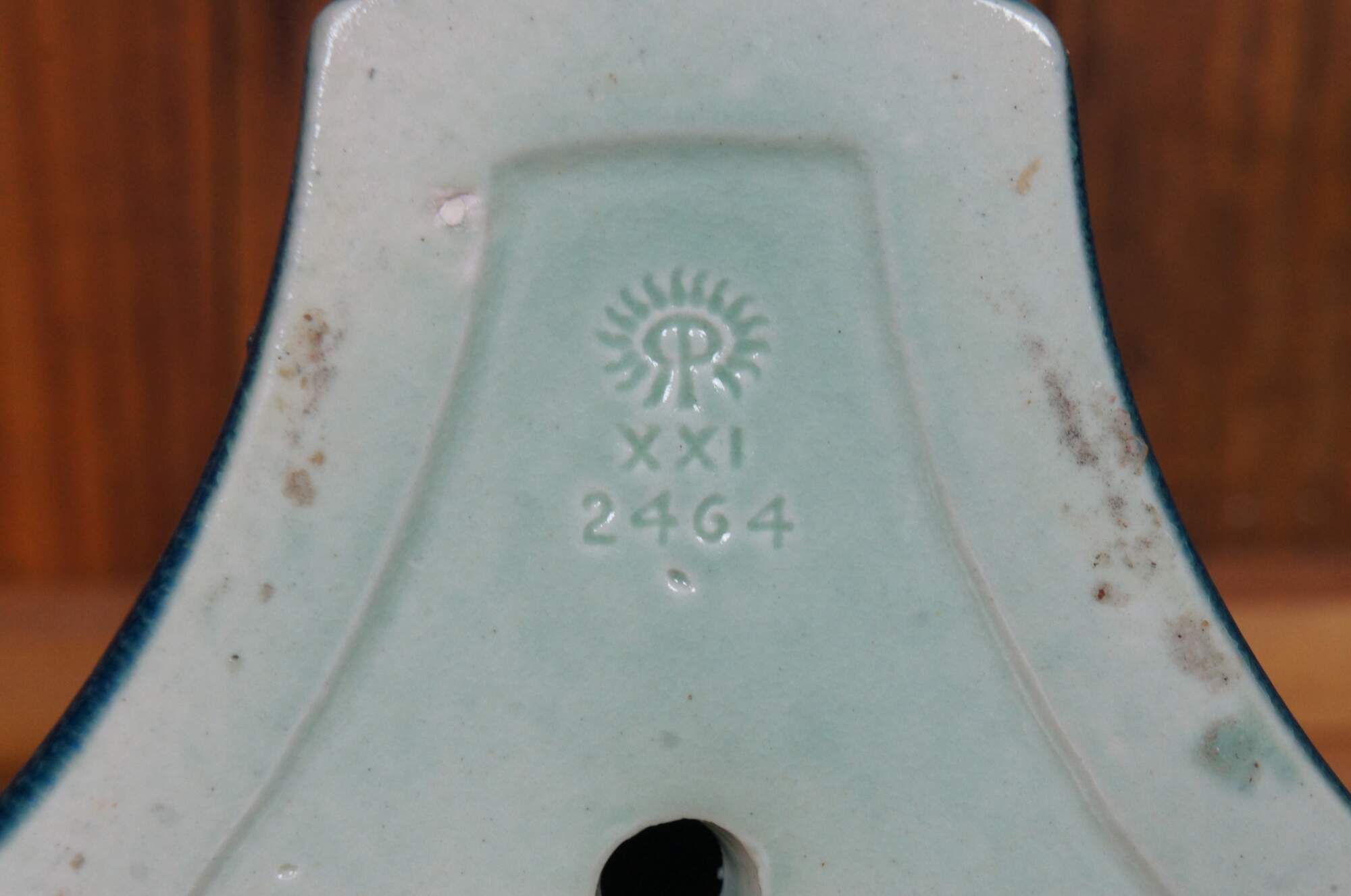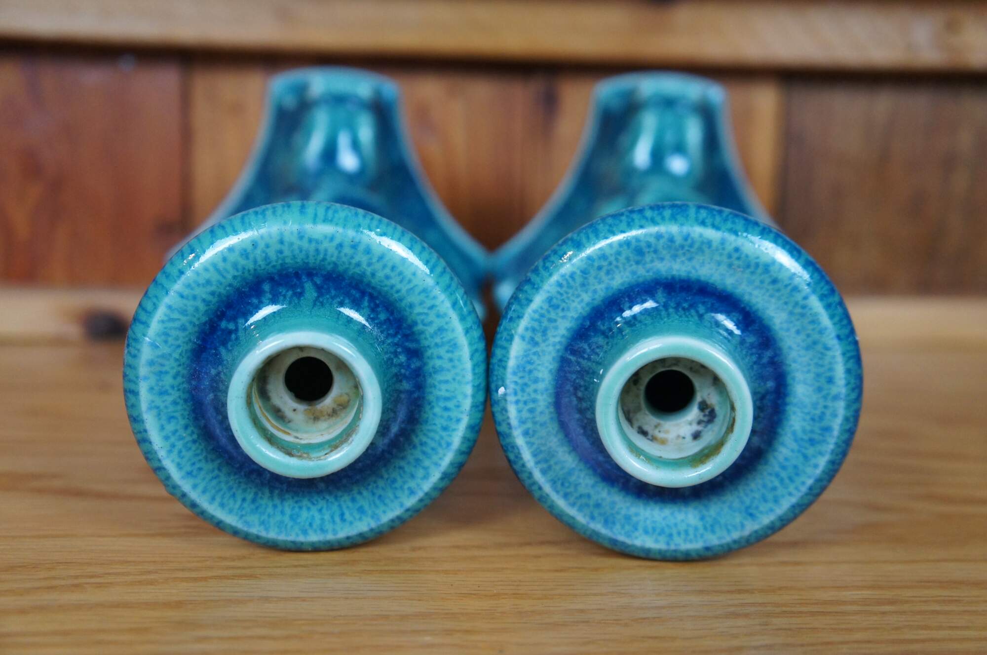 Antique Rookwood candlesticks or candle holders featuring a barley twisted design and triangular base with delphins / dolphins in a sharpe blue / turquouse glaze. Circa 1921. Shape 2464.