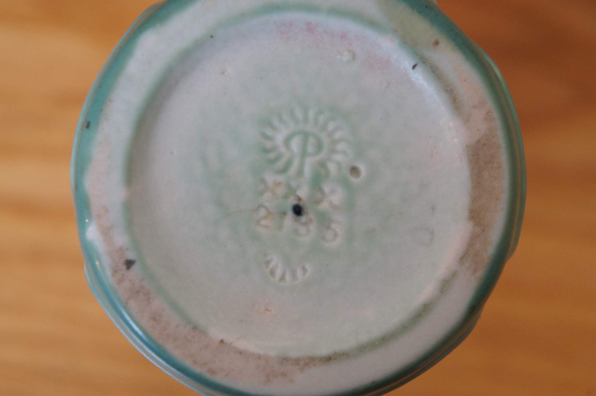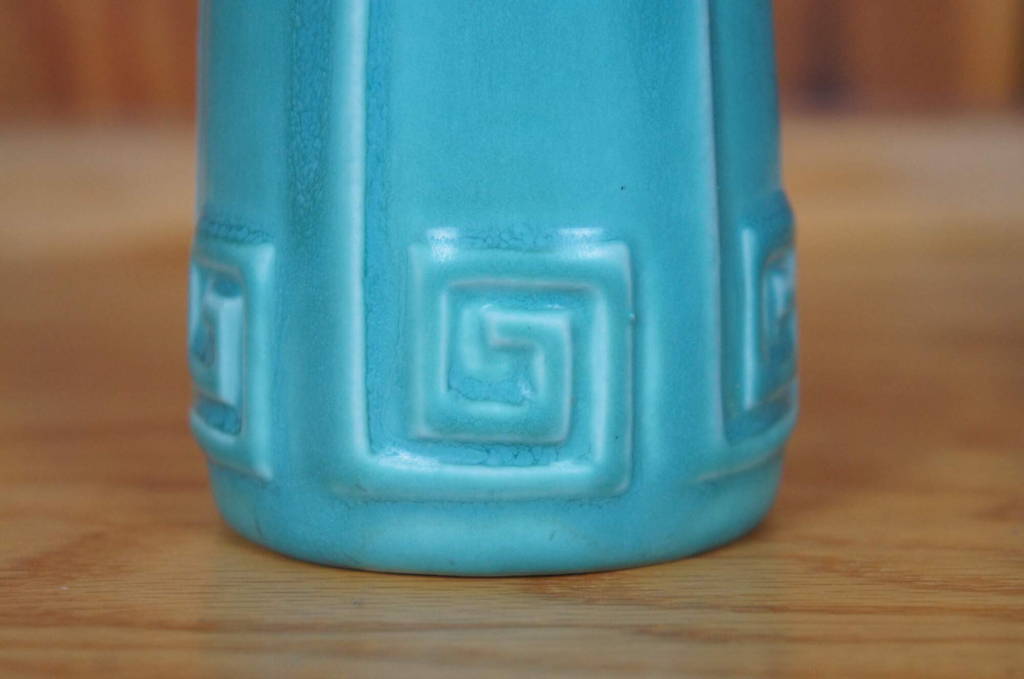 Antique Rookwood bud vase featuring Art Deco styling with geometric Greek Key design in teal / turquoise glaze. Circa 1930 XXX. Shape 2135. Makred with the special 50 year anniversary marking consisiting of a semicircular set of hash marks.