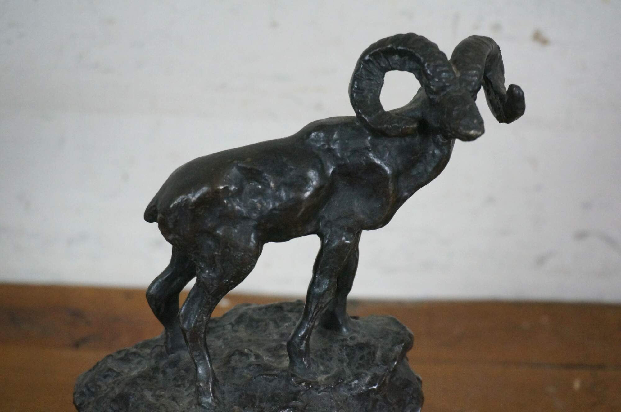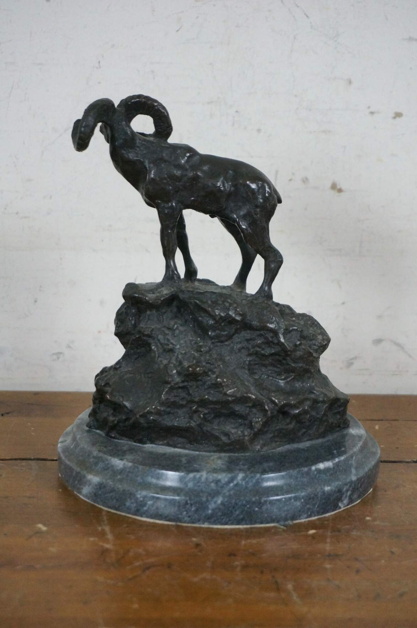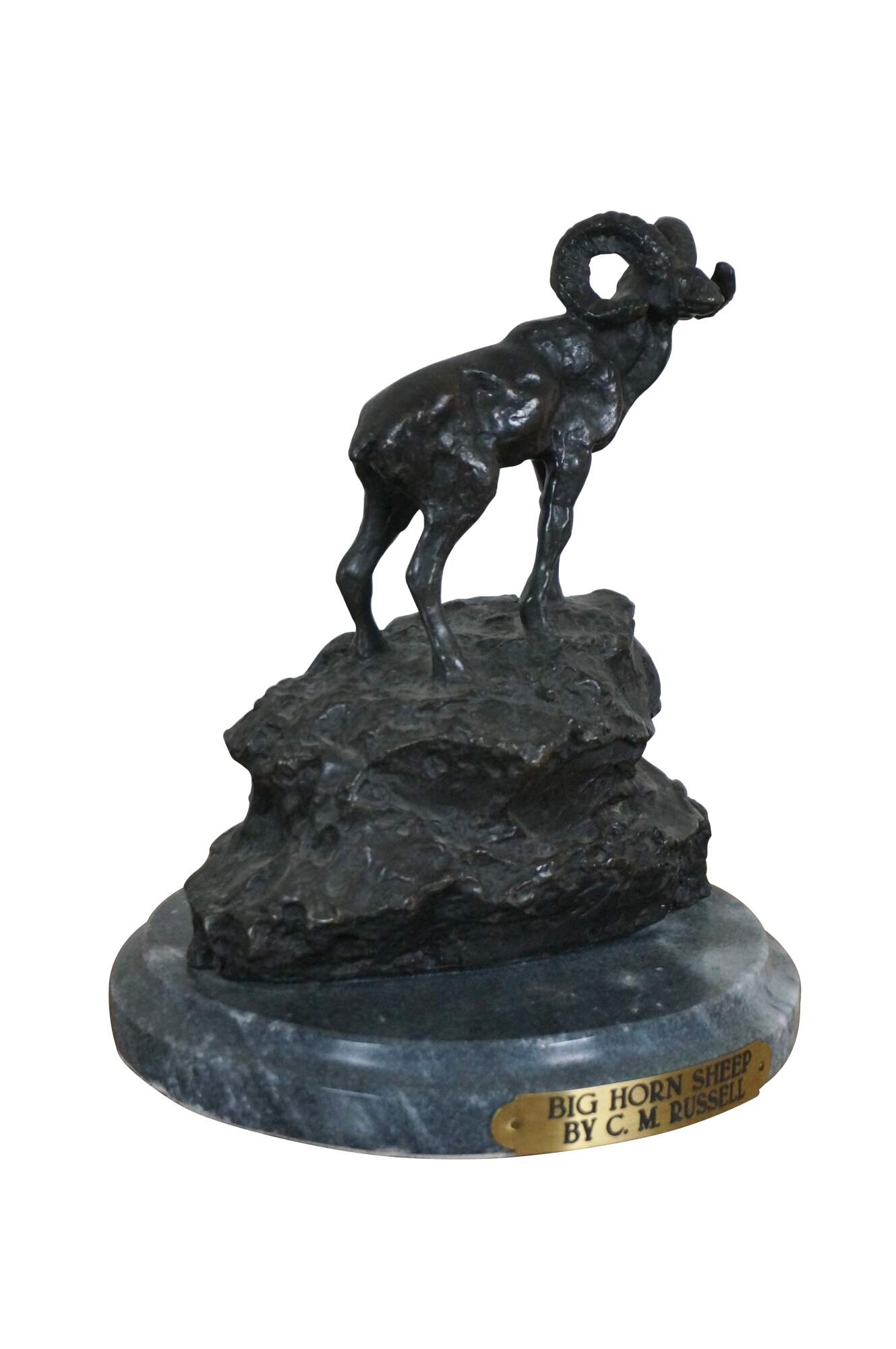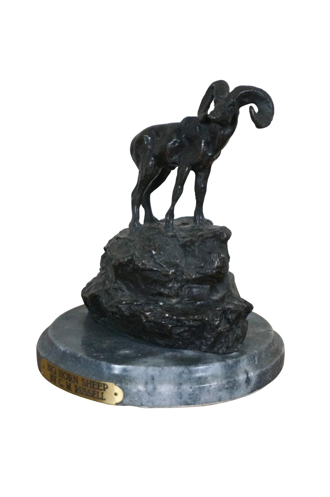 20th century bronze sculpture / figurine after "Big Horn Sheep" by C.M. Russell. Depicts a muscular big horn sheep standing proudly on a boulder. Marked CMR on one side. Gray marble base with felt bottom and brass name plate.