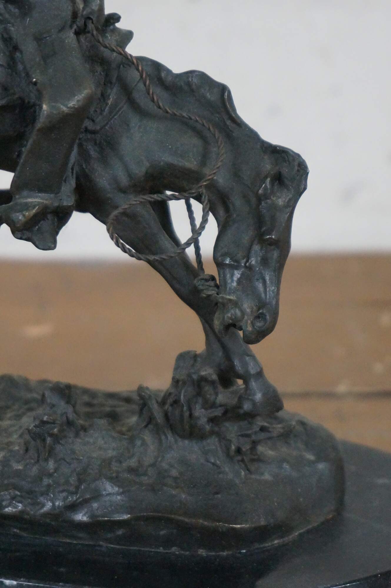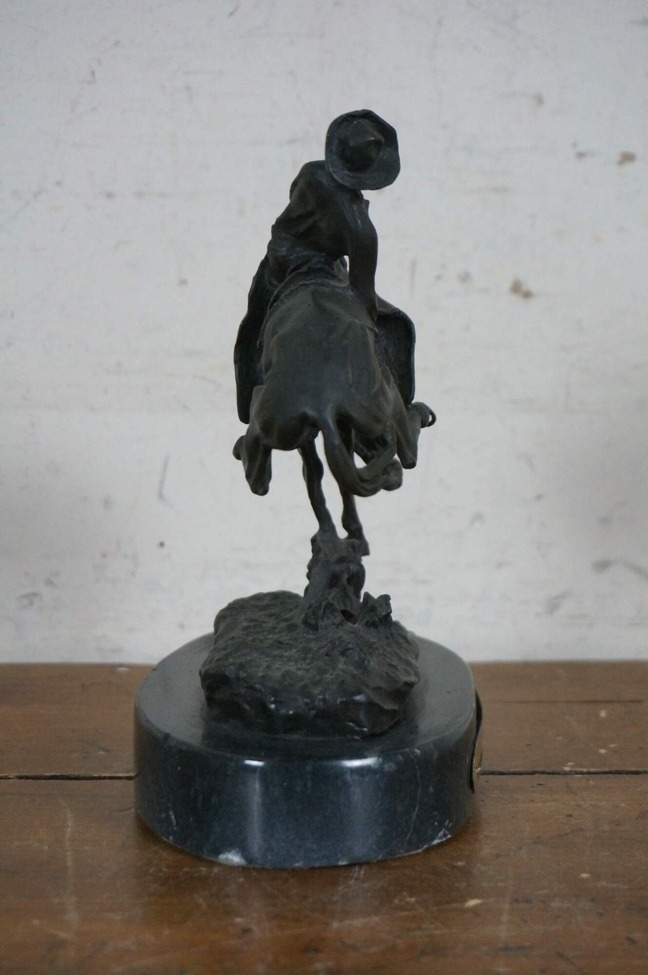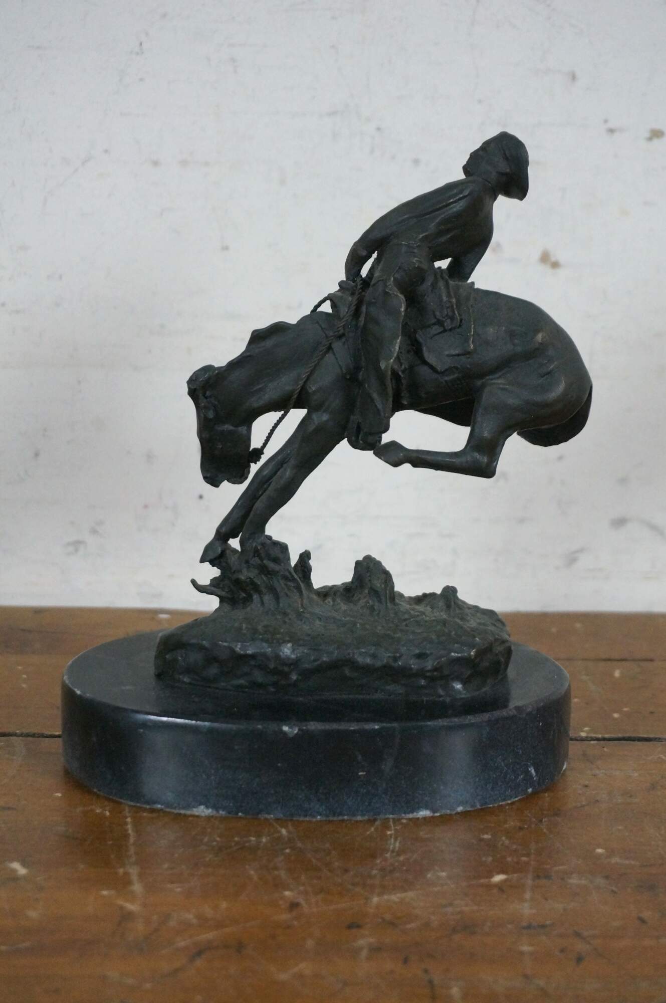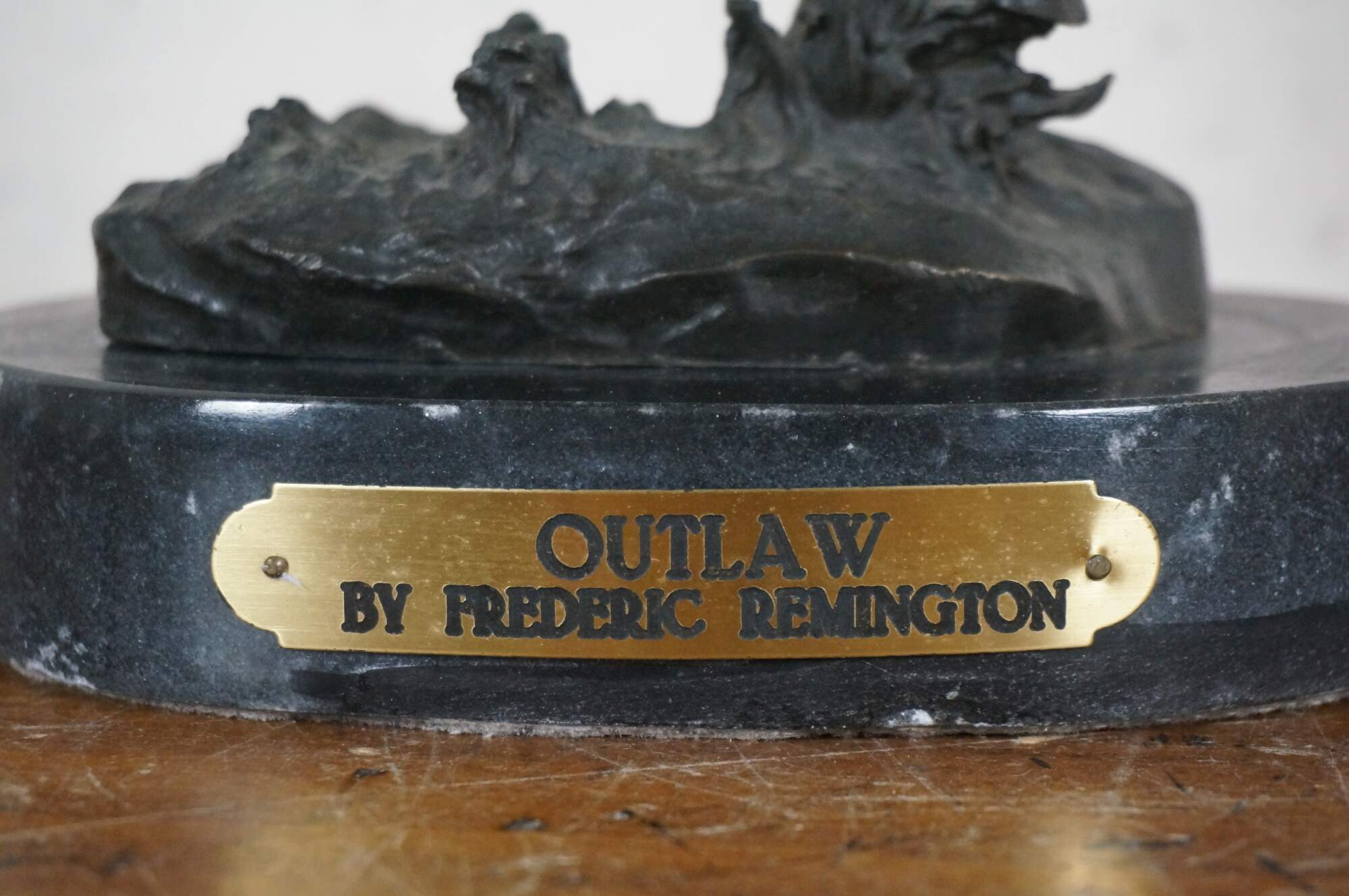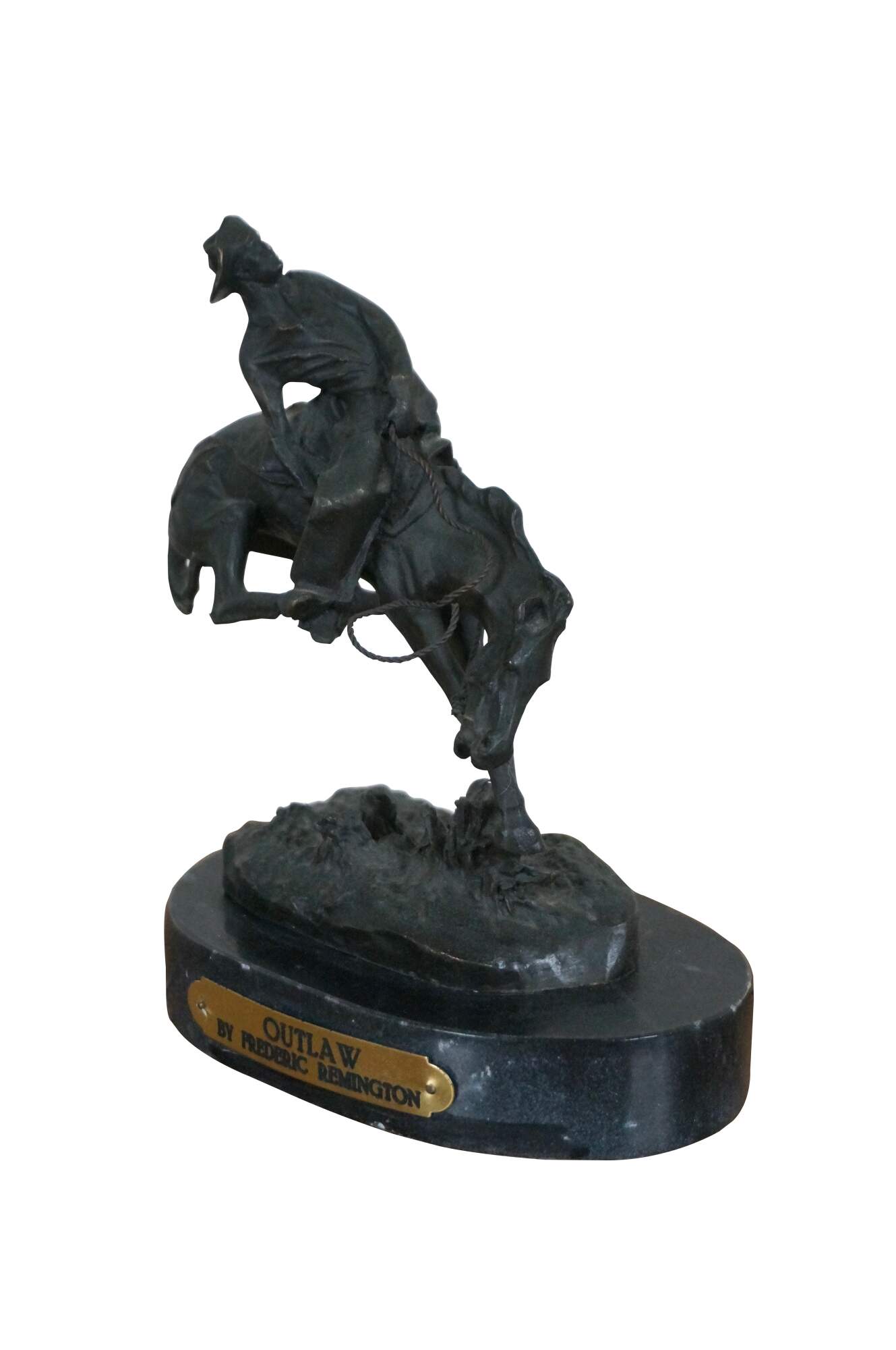 20th century bronze Western equestrian figurine / sculpture after "Outlaw" by Frederic Remington. Depicts a cowboy riding a bucking horse. Marked ASB on one side. Gray marble base with felt bottom and brass name plate.