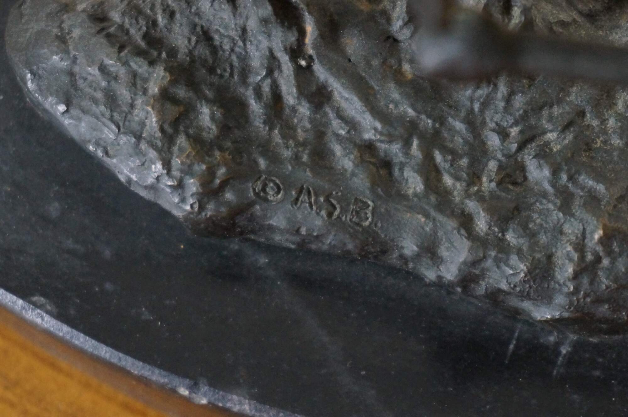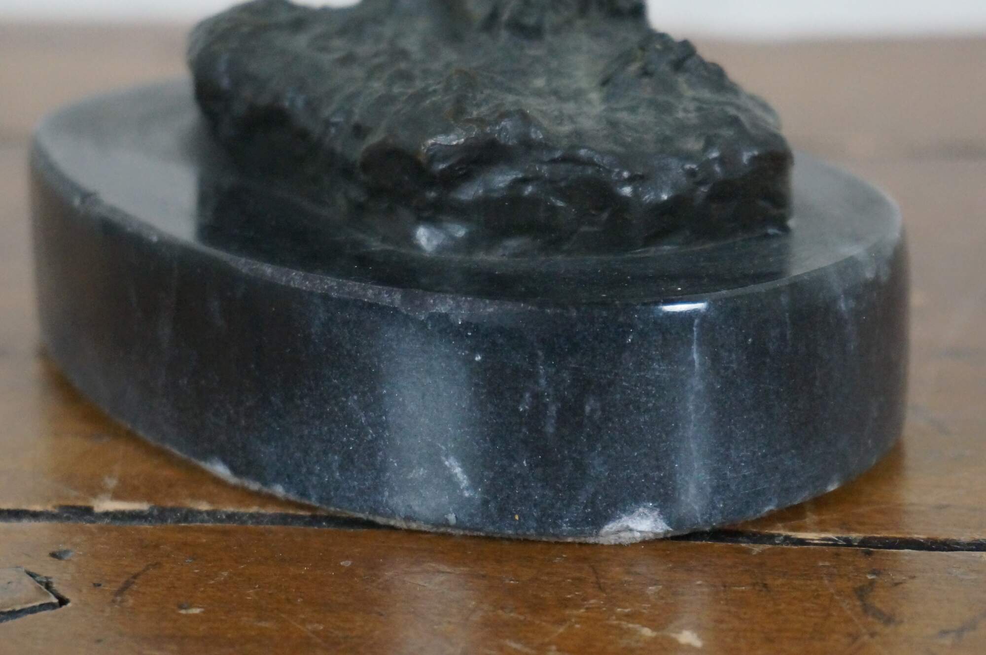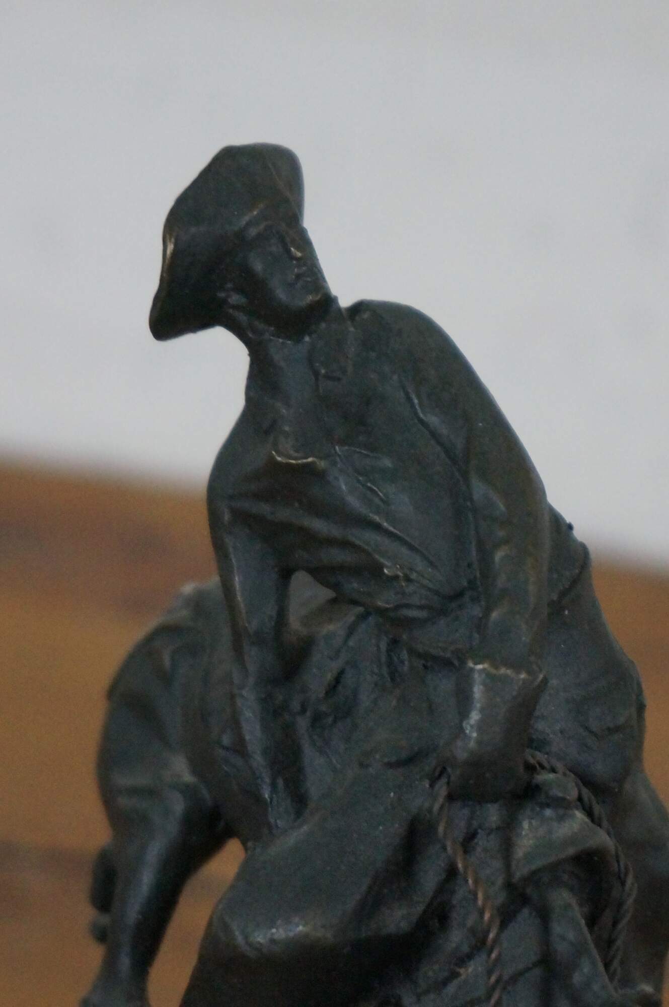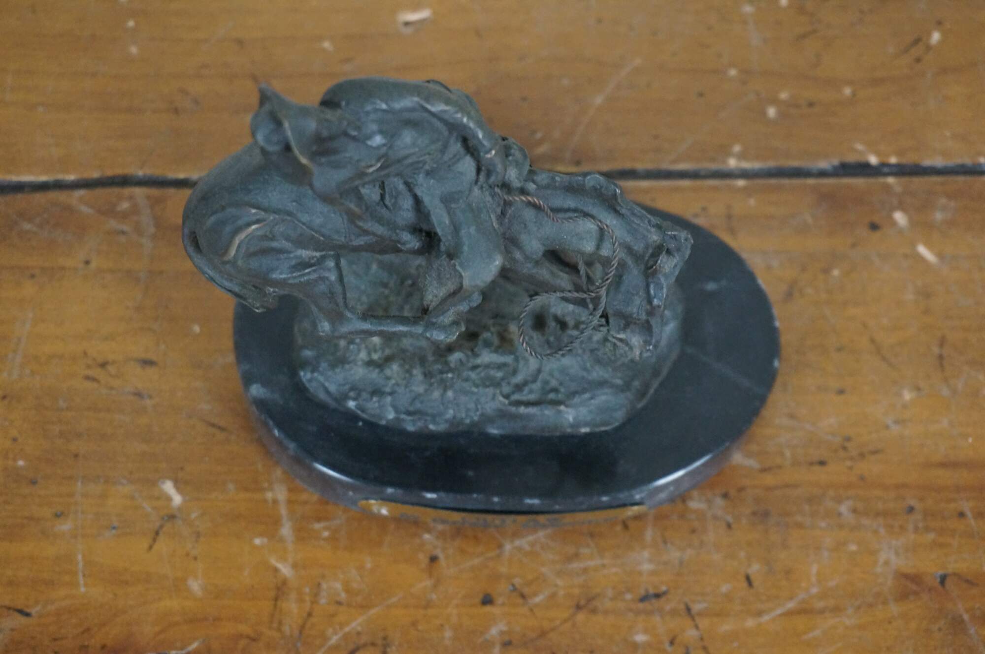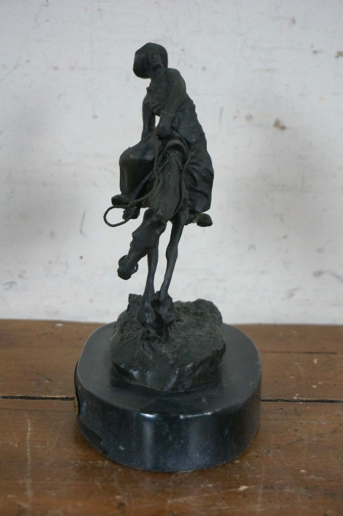 20th century bronze Western equestrian figurine / sculpture after "Outlaw" by Frederic Remington. Depicts a cowboy riding a bucking horse. Marked ASB on one side. Gray marble base with felt bottom and brass name plate.