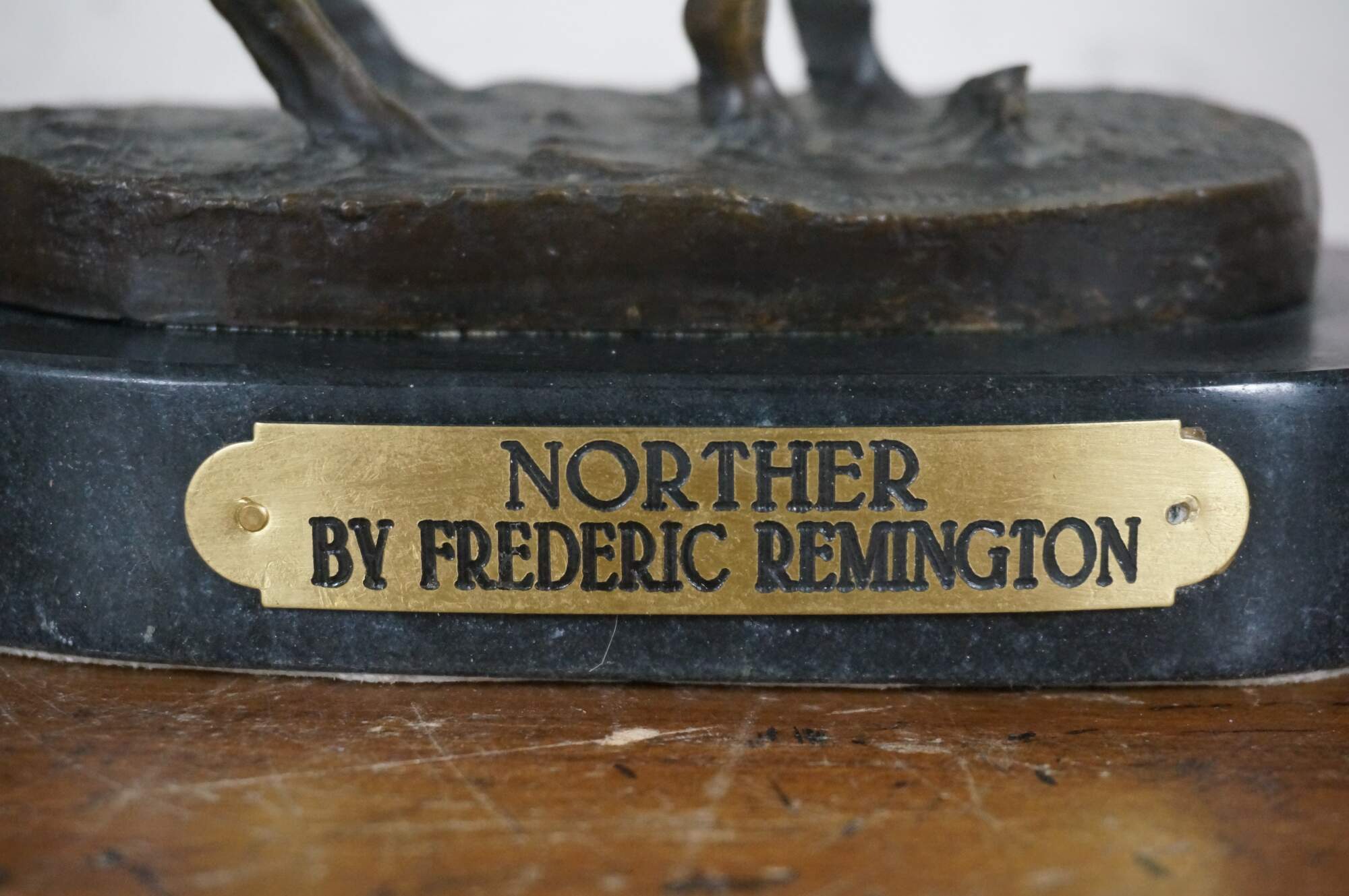 20th century bronze equestrian sculpture / figurine after "The Norther" by Frederic Remington. Depicts a well bundled up cowboy on a cold looking horse. Marked Frederic Remington near hoof. Gray marble base with felt bottom and brass name plaque.