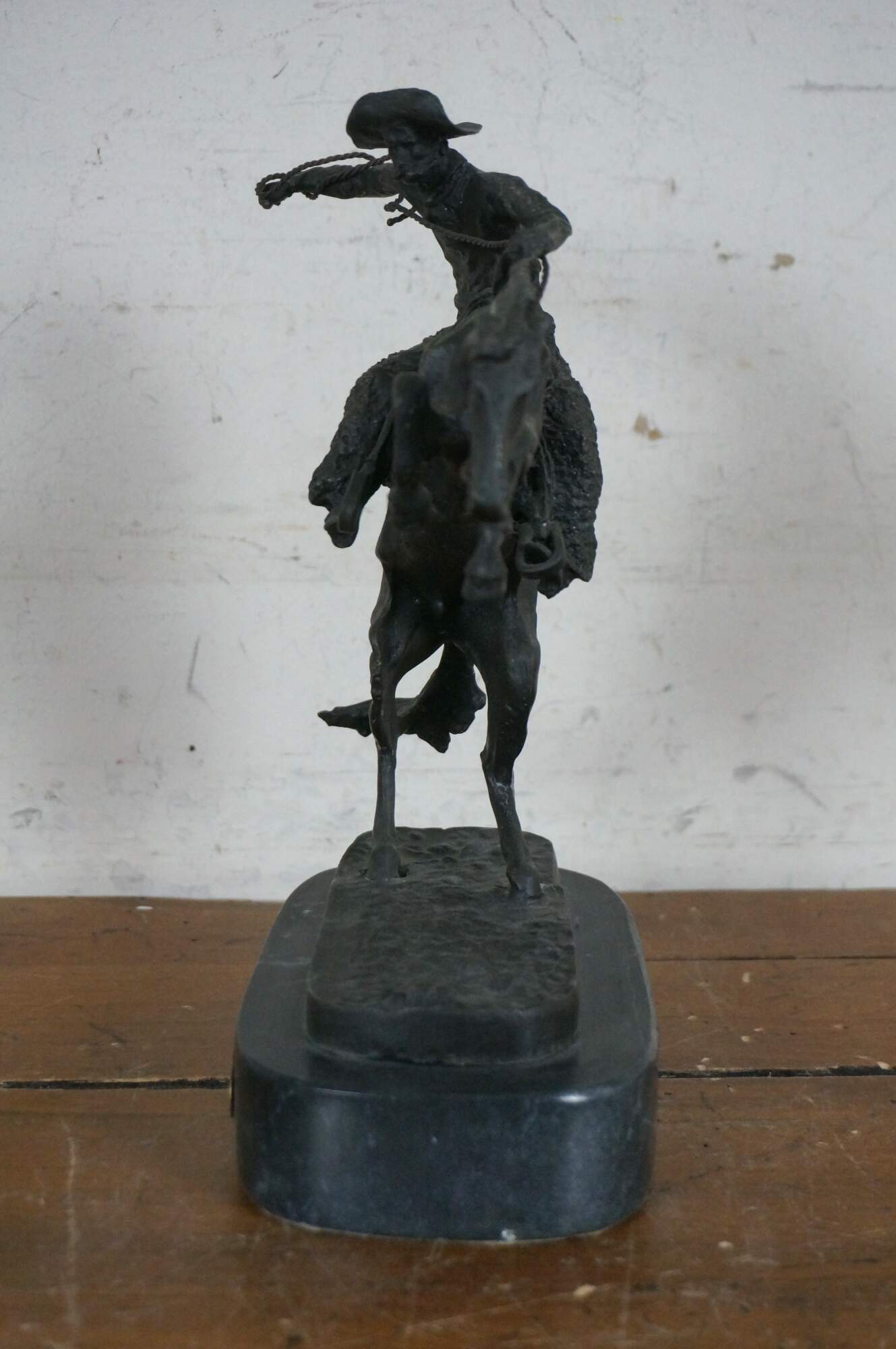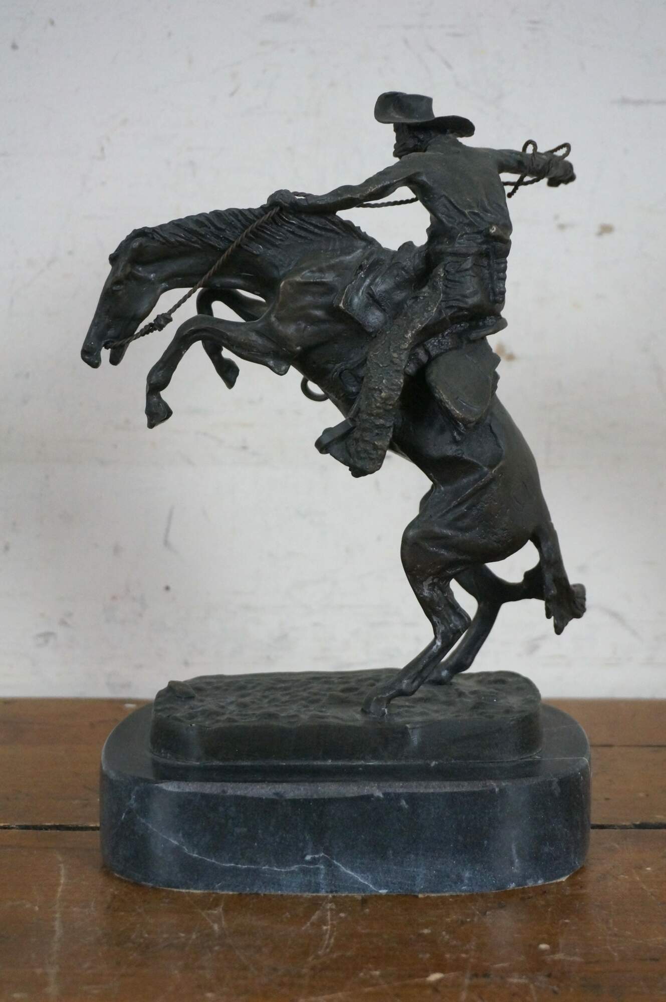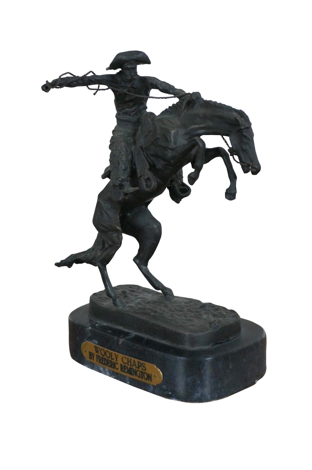 20th century bronze figurine after "Wooly Chaps" aka "Bronco Buster" by Frederic Remington. Depicts a cowboy with large mustache and the titular wooly / furry chaps, perched on a rearing horse. Marked Frederic Remington near hoof. Gray marble base with felt bottom and brass name plaque.