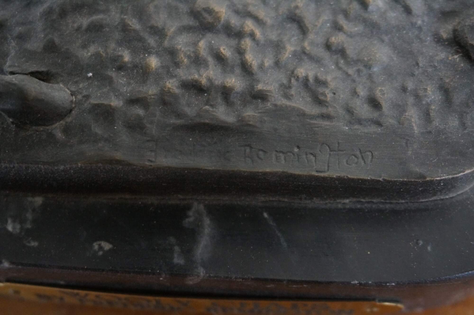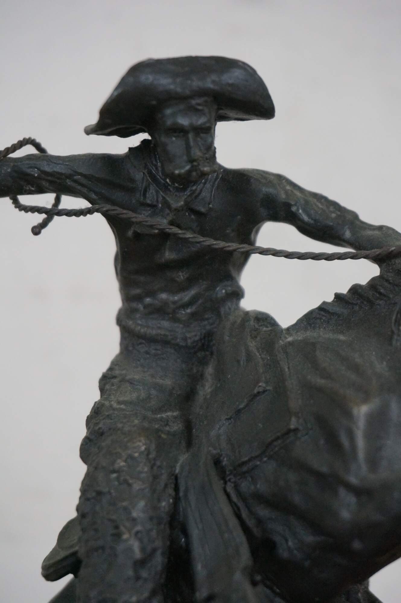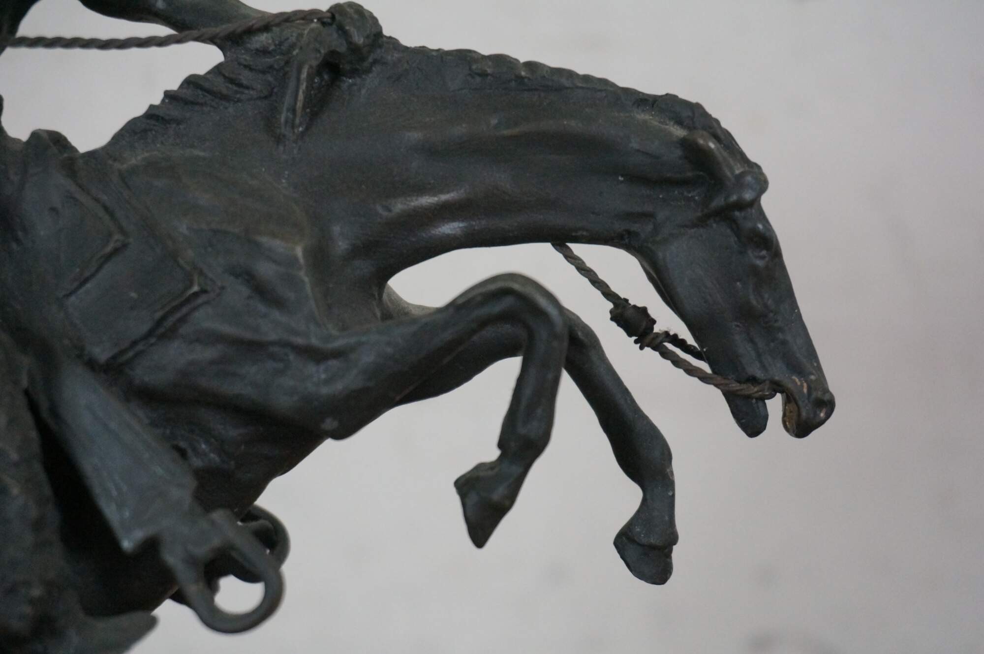 20th century bronze figurine after "Wooly Chaps" aka "Bronco Buster" by Frederic Remington. Depicts a cowboy with large mustache and the titular wooly / furry chaps, perched on a rearing horse. Marked Frederic Remington near hoof. Gray marble base with felt bottom and brass name plaque.