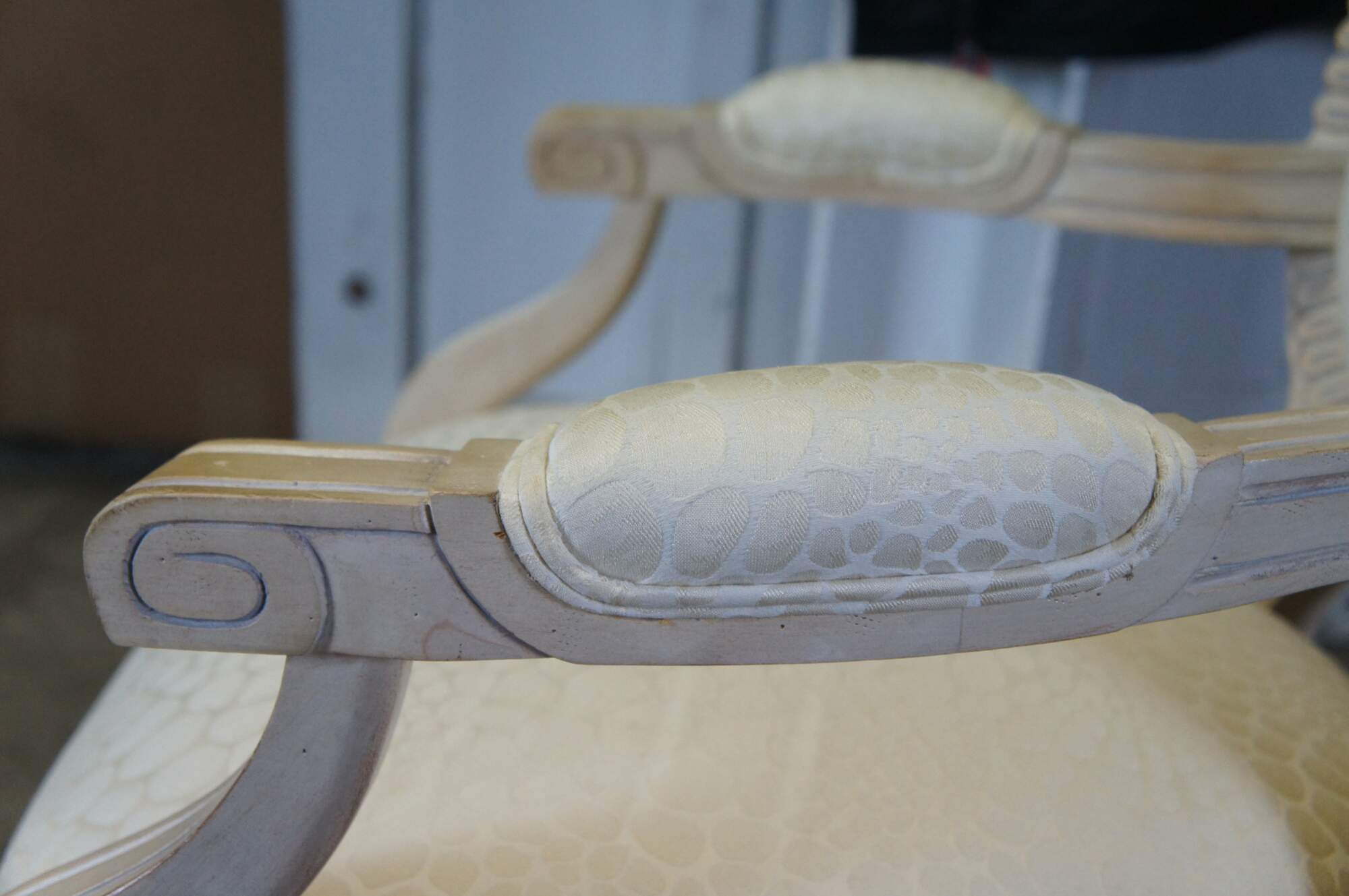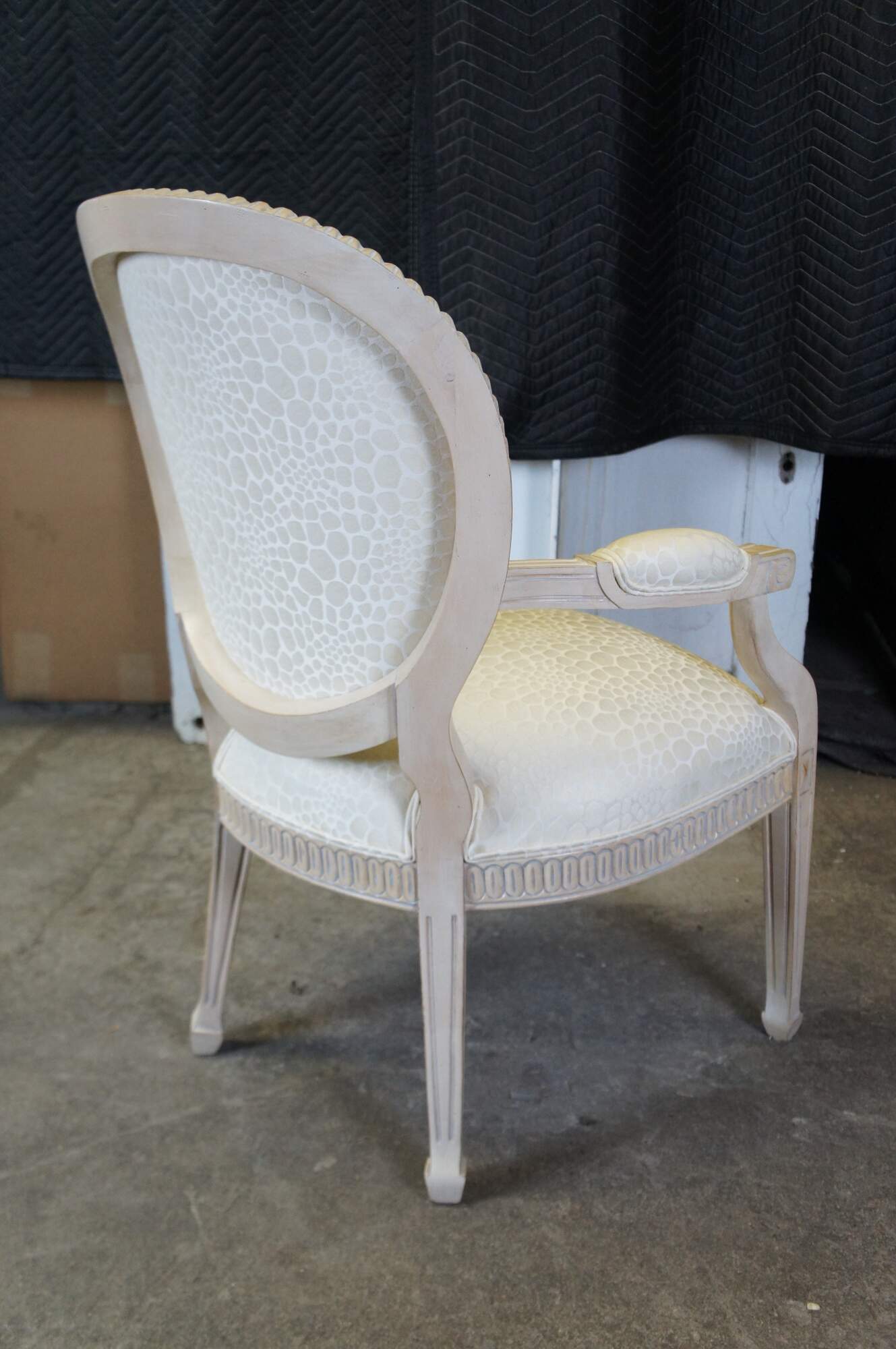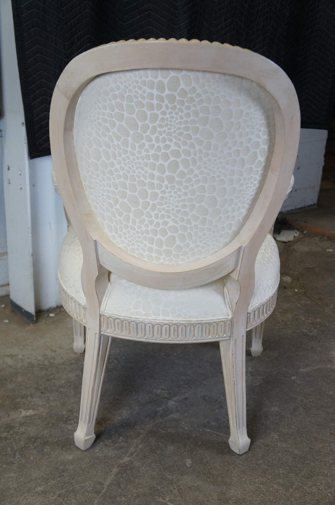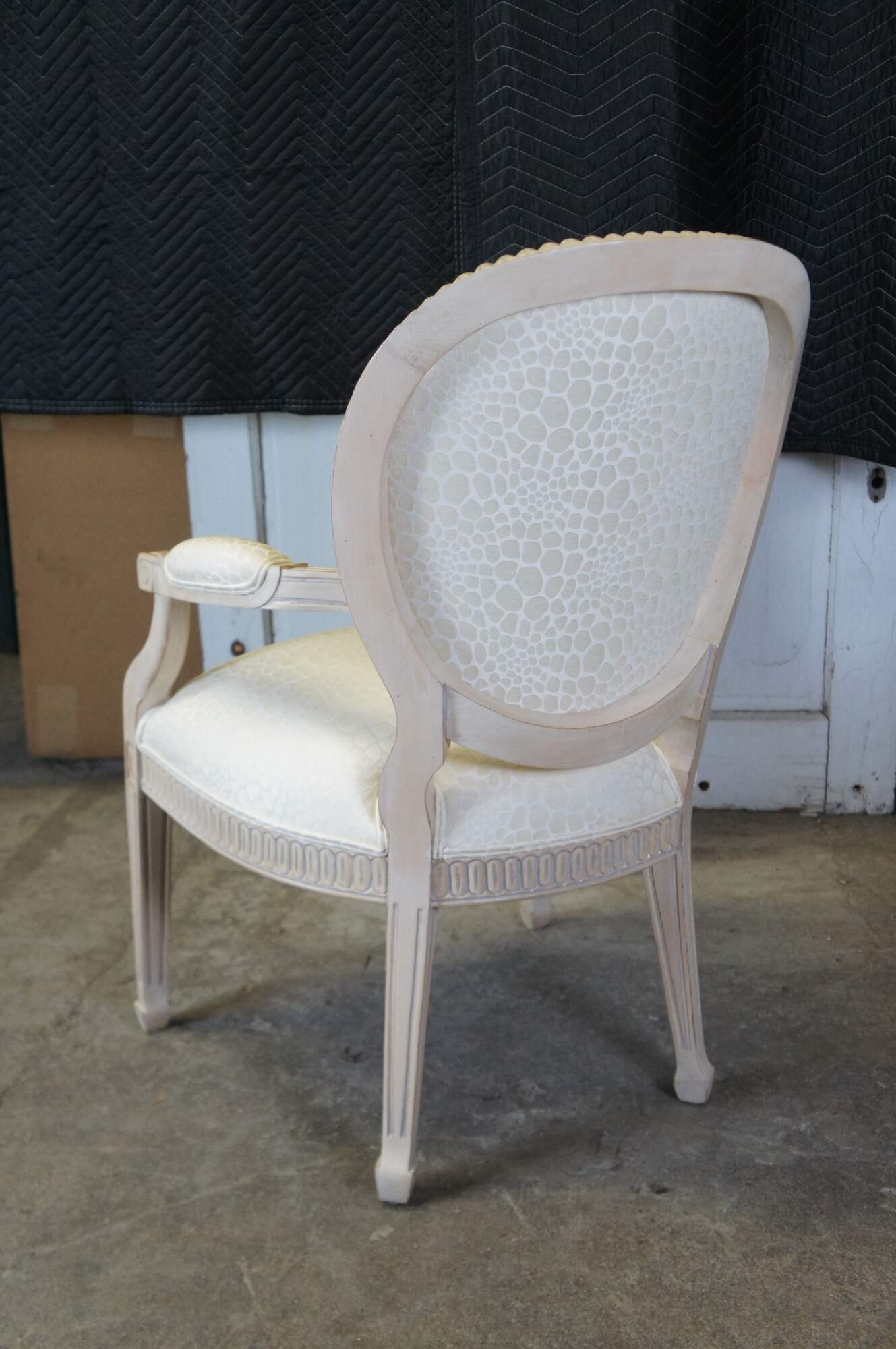 Six vintage Kreiss Peninsula dining armchairs. The Peninsula armchair is made of beechwood and crafted by California artisans in the French Louis XVI inspiration with a dramatic large round back, padded fauteuil arms, and fluted and tapered legs. Upholstered in a modern reptile / leopard pattern fabric.