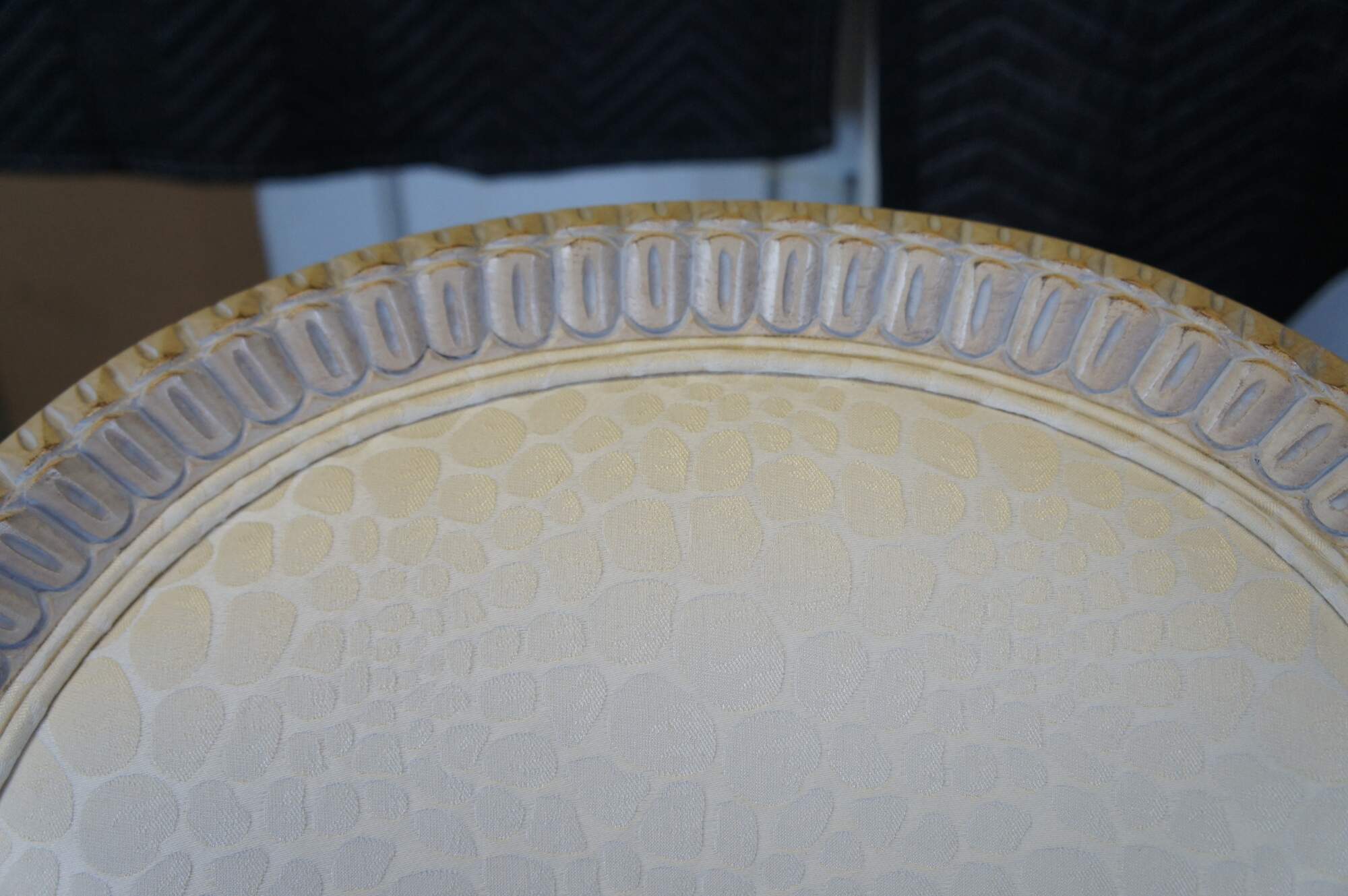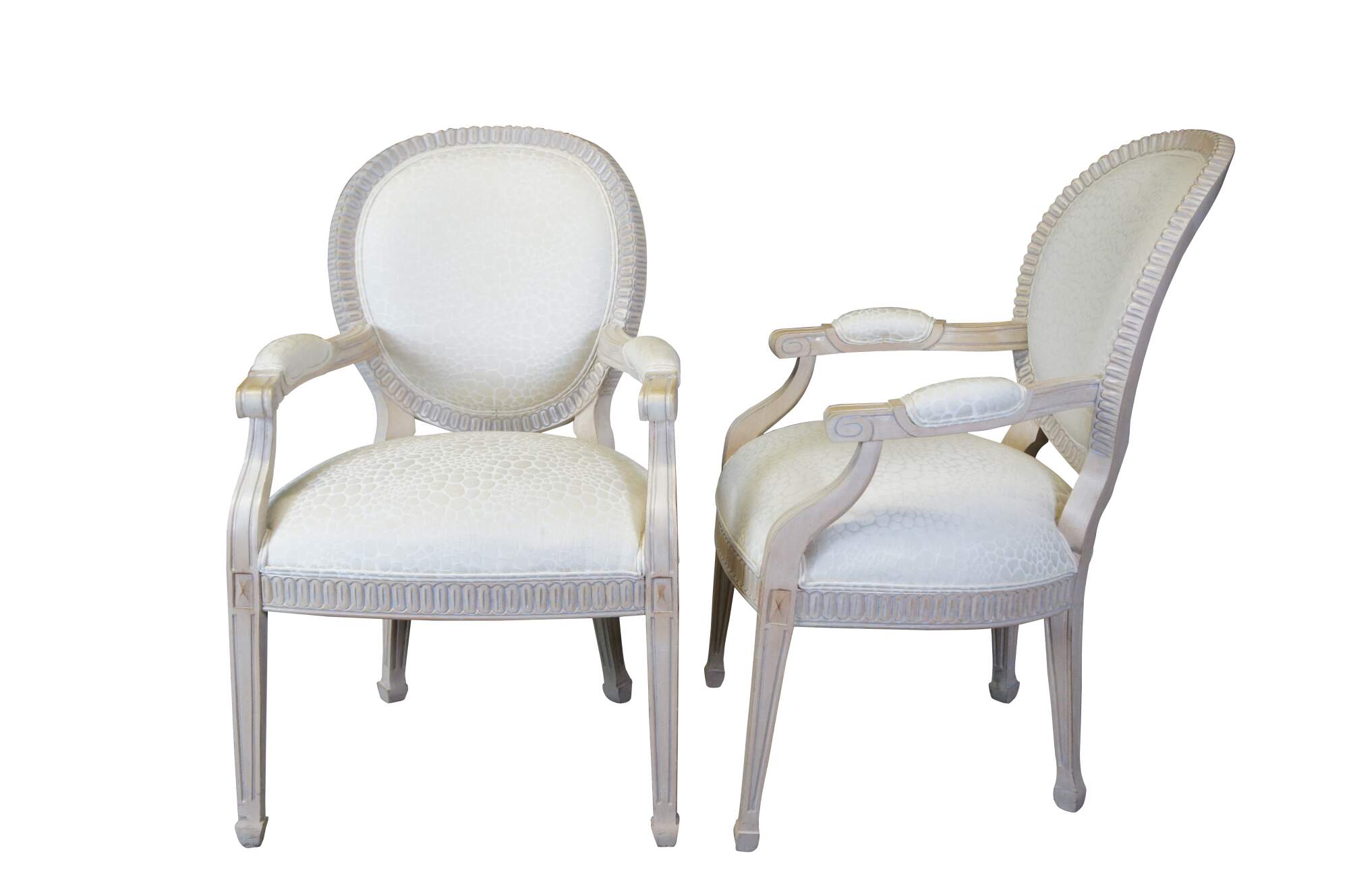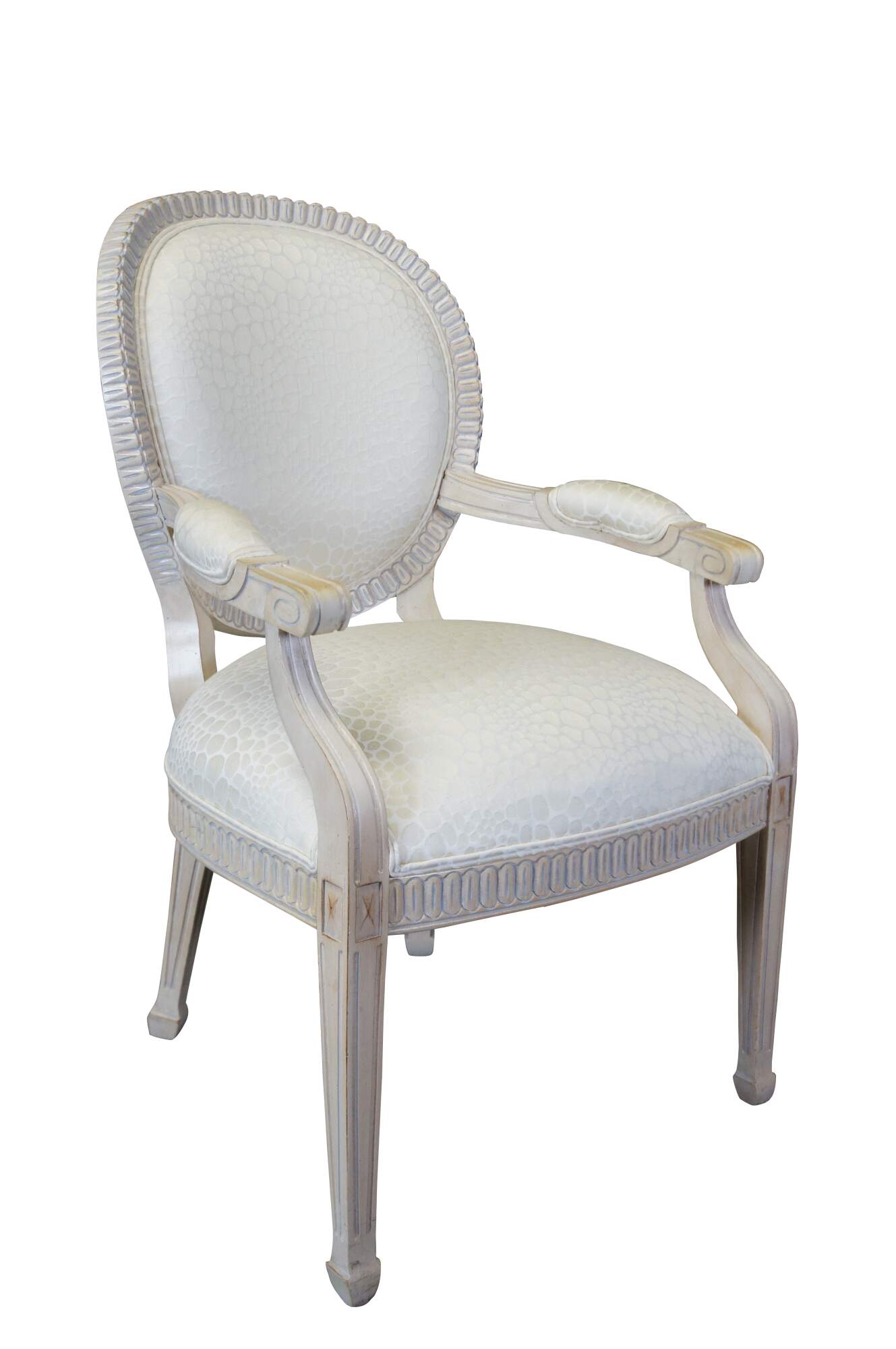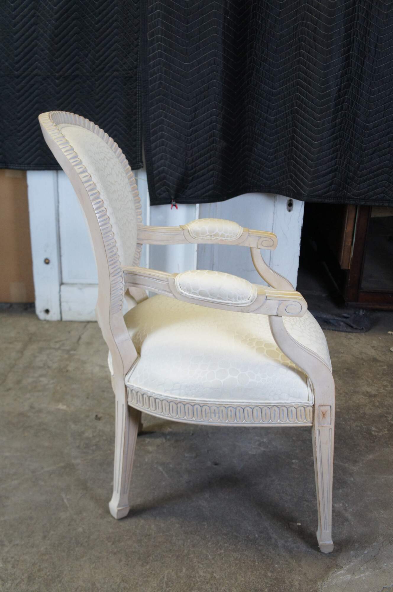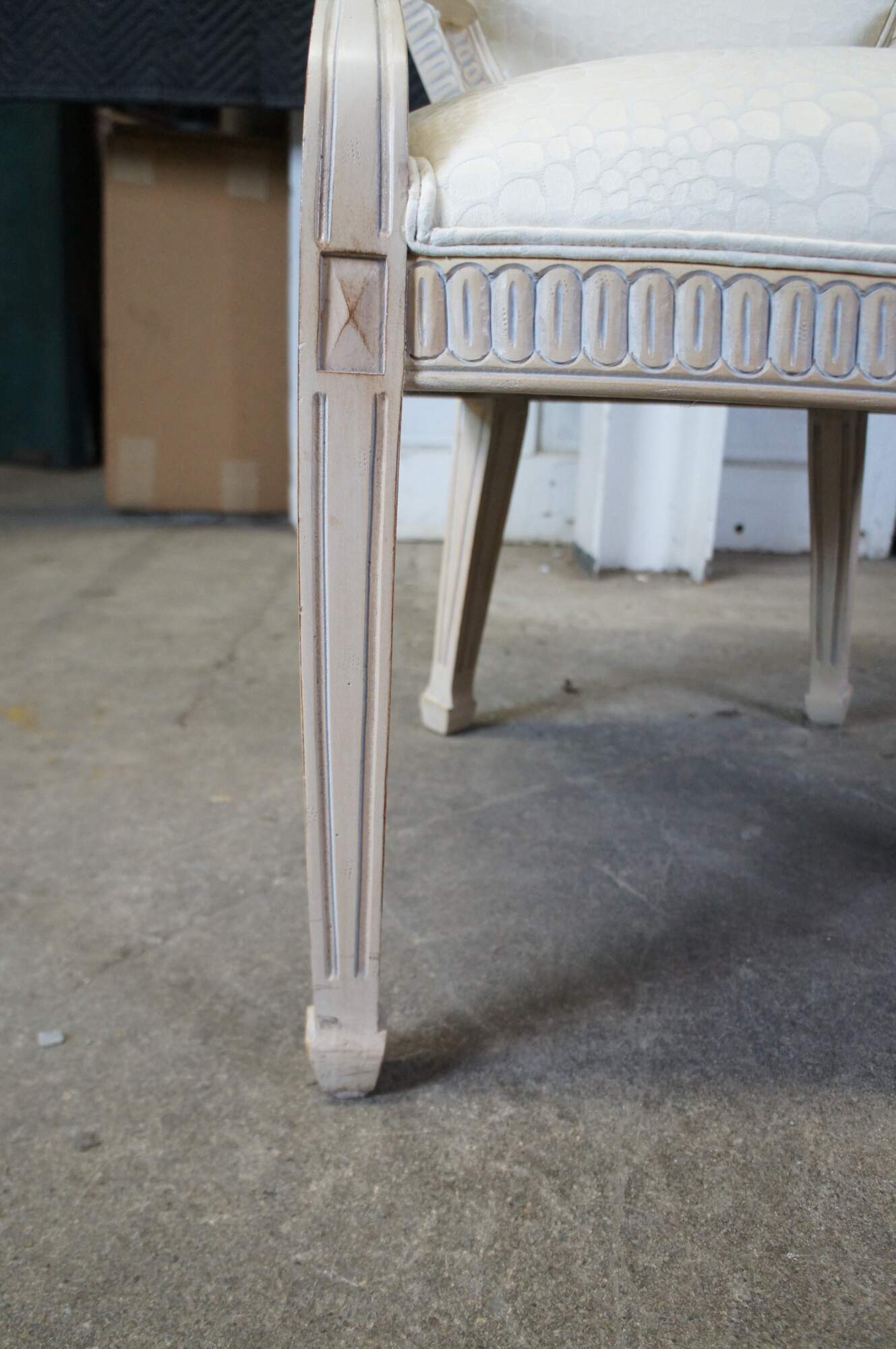 Six vintage Kreiss Peninsula dining armchairs. The Peninsula armchair is made of beechwood and crafted by California artisans in the French Louis XVI inspiration with a dramatic large round back, padded fauteuil arms, and fluted and tapered legs. Upholstered in a modern reptile / leopard pattern fabric.
