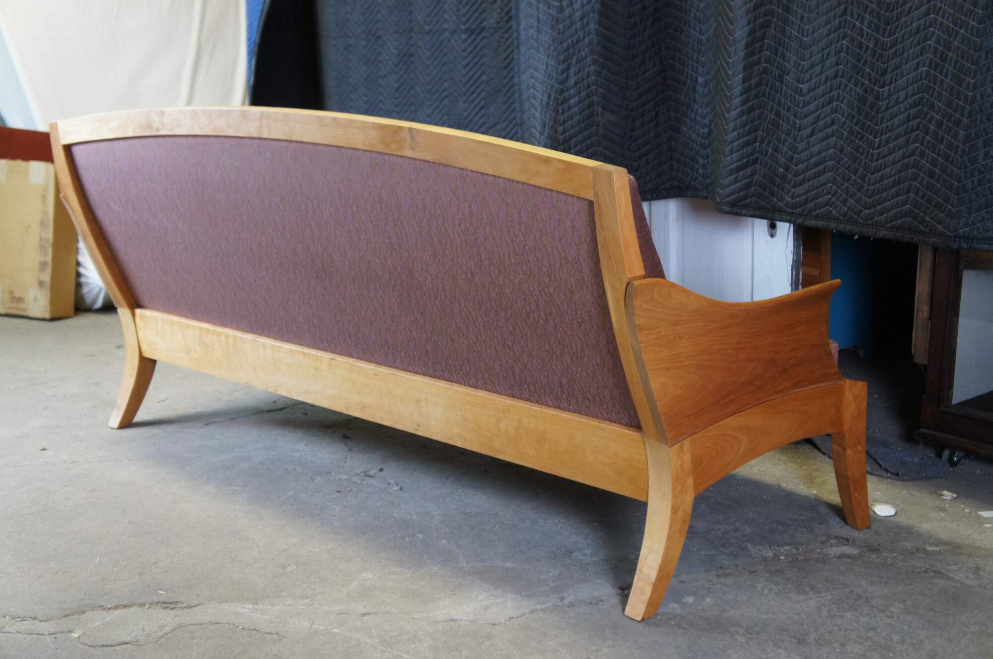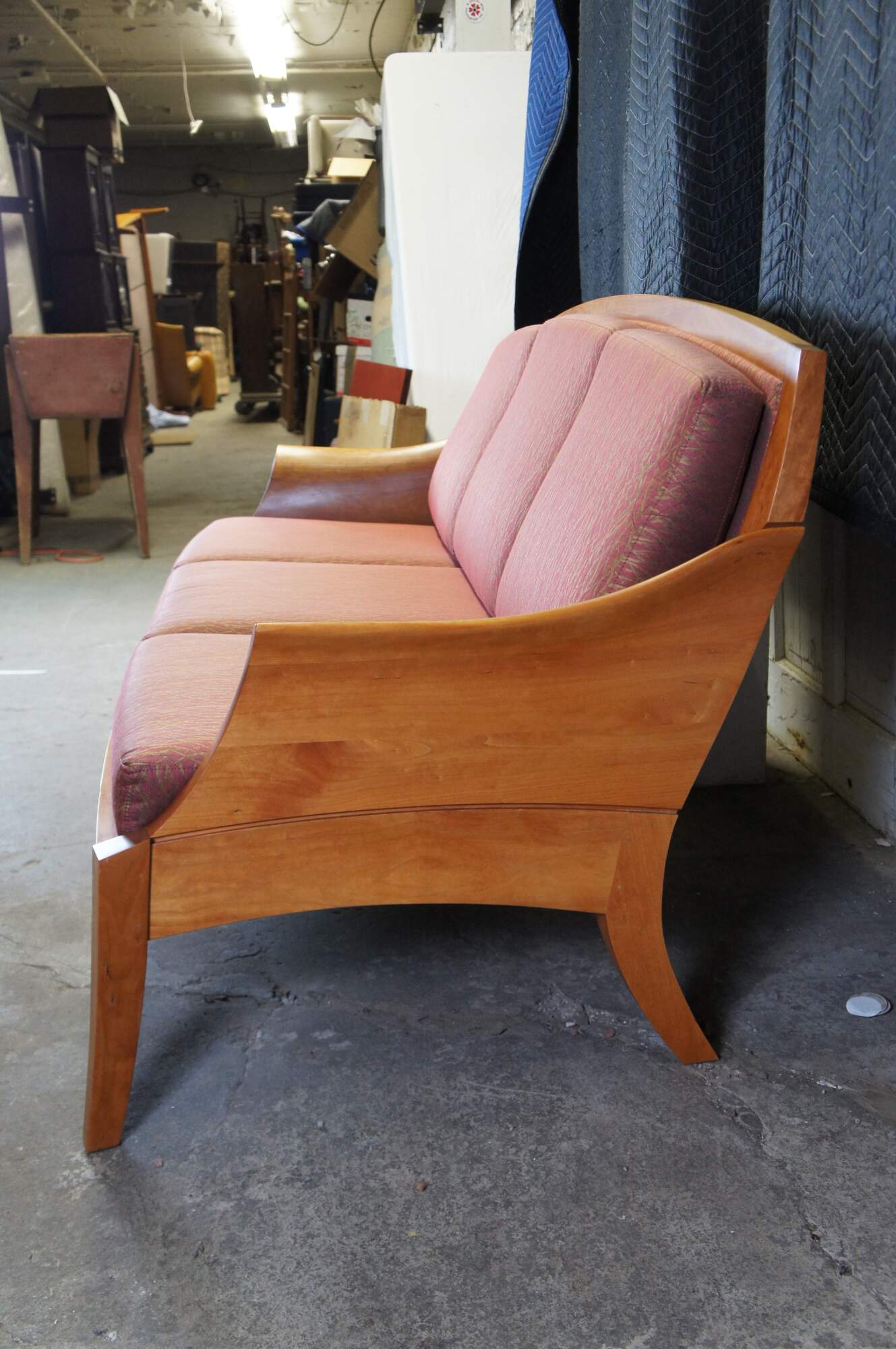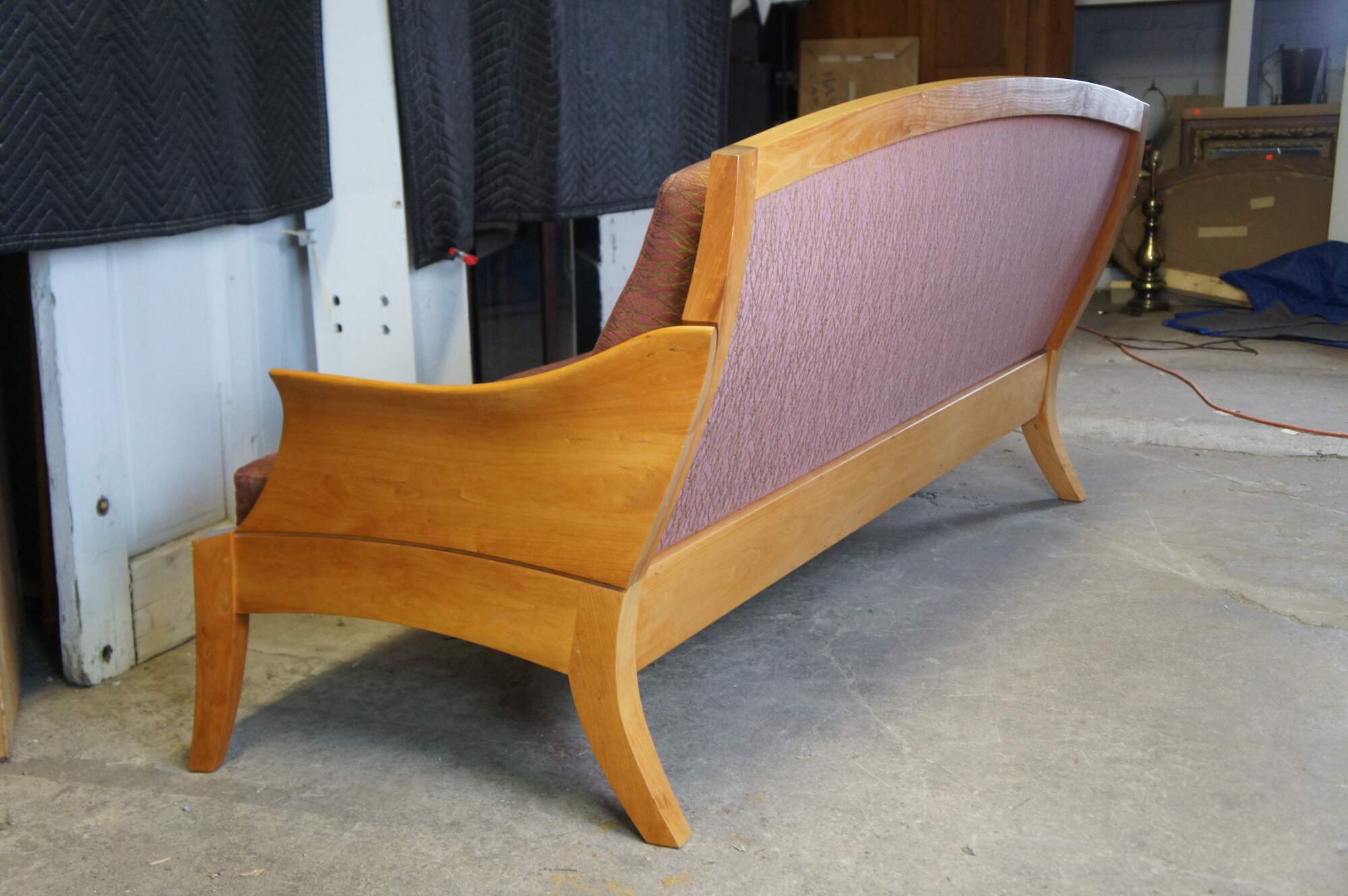 Vintage Thos Moser cherry Three Place Wing Sofa. With curved arms sculpted from grain matched solid wood, the Wing Three Place Sofa marries our handcraft and hallmark aesthetics with true comfort. Tracing its lineage back to an 18th-century Queen Anne chair, the sofa brings new relevance to old forms, coaxing solid cherry into freestanding art. The Wing Three Place Sofa is the satisfying result of artfully integrating both wood and upholstery to create a piece that both complements and defines the space it occupies. Made by Michael J Gaig circa 2007. Thomas Moser Cabinetmakers Auburn, Maine.