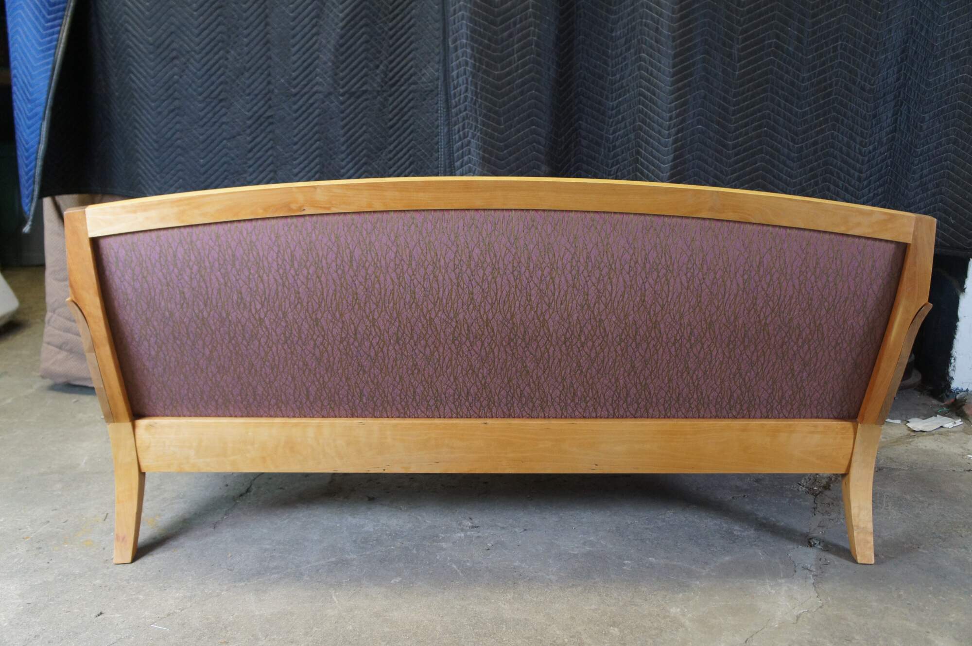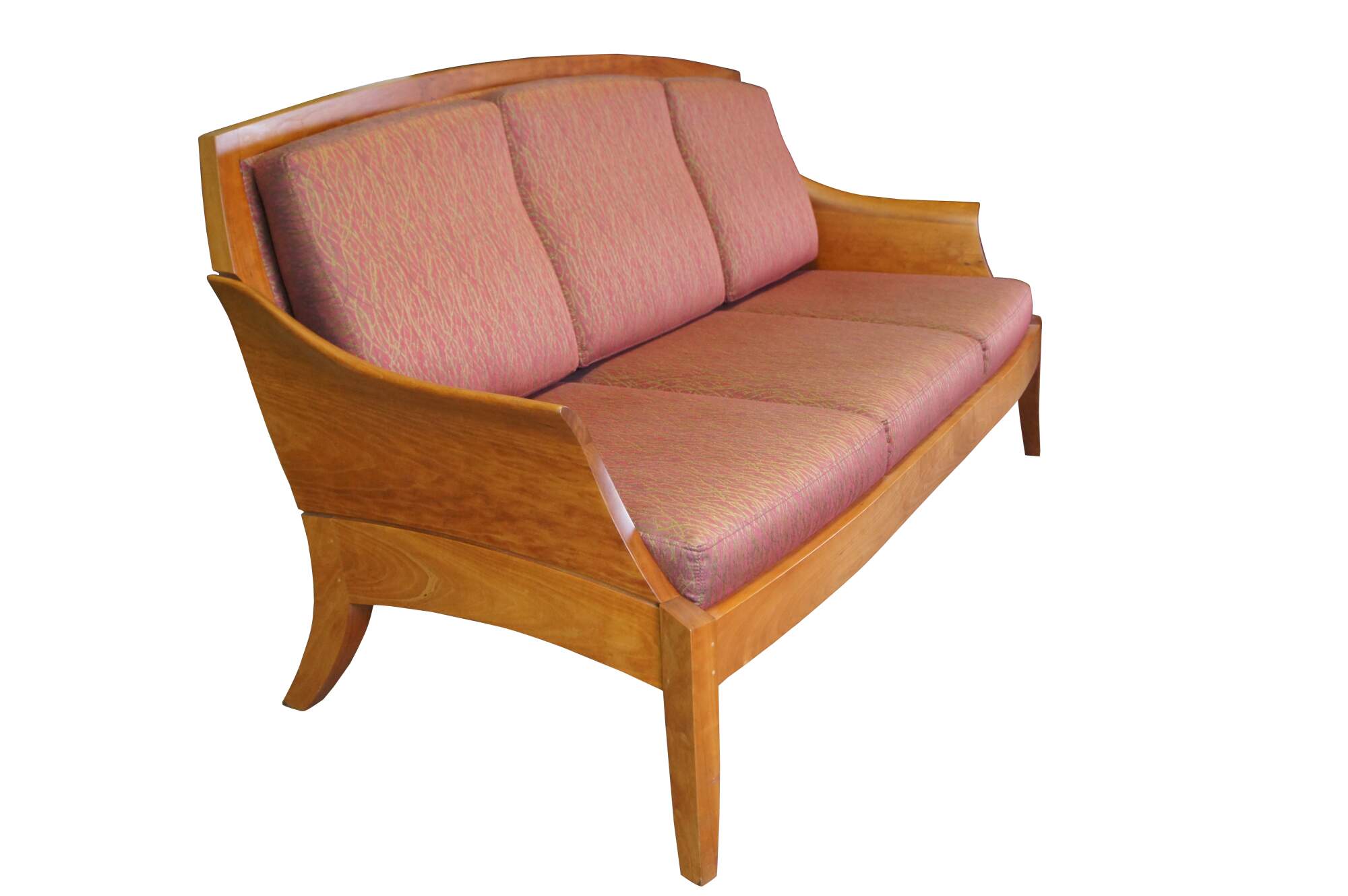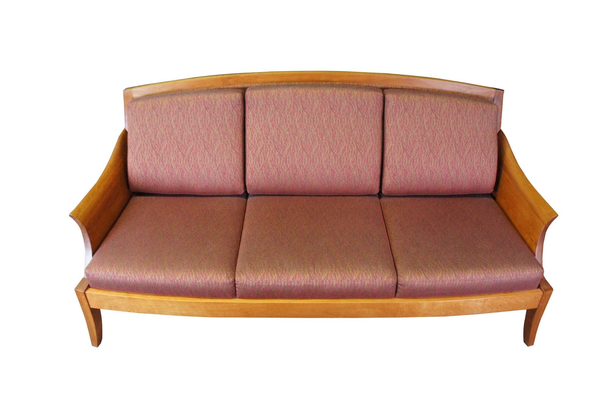 Vintage Thos Moser cherry Three Place Wing Sofa. With curved arms sculpted from grain matched solid wood, the Wing Three Place Sofa marries our handcraft and hallmark aesthetics with true comfort. Tracing its lineage back to an 18th-century Queen Anne chair, the sofa brings new relevance to old forms, coaxing solid cherry into freestanding art. The Wing Three Place Sofa is the satisfying result of artfully integrating both wood and upholstery to create a piece that both complements and defines the space it occupies. Made by Michael J Gaig circa 2007. Thomas Moser Cabinetmakers Auburn, Maine.