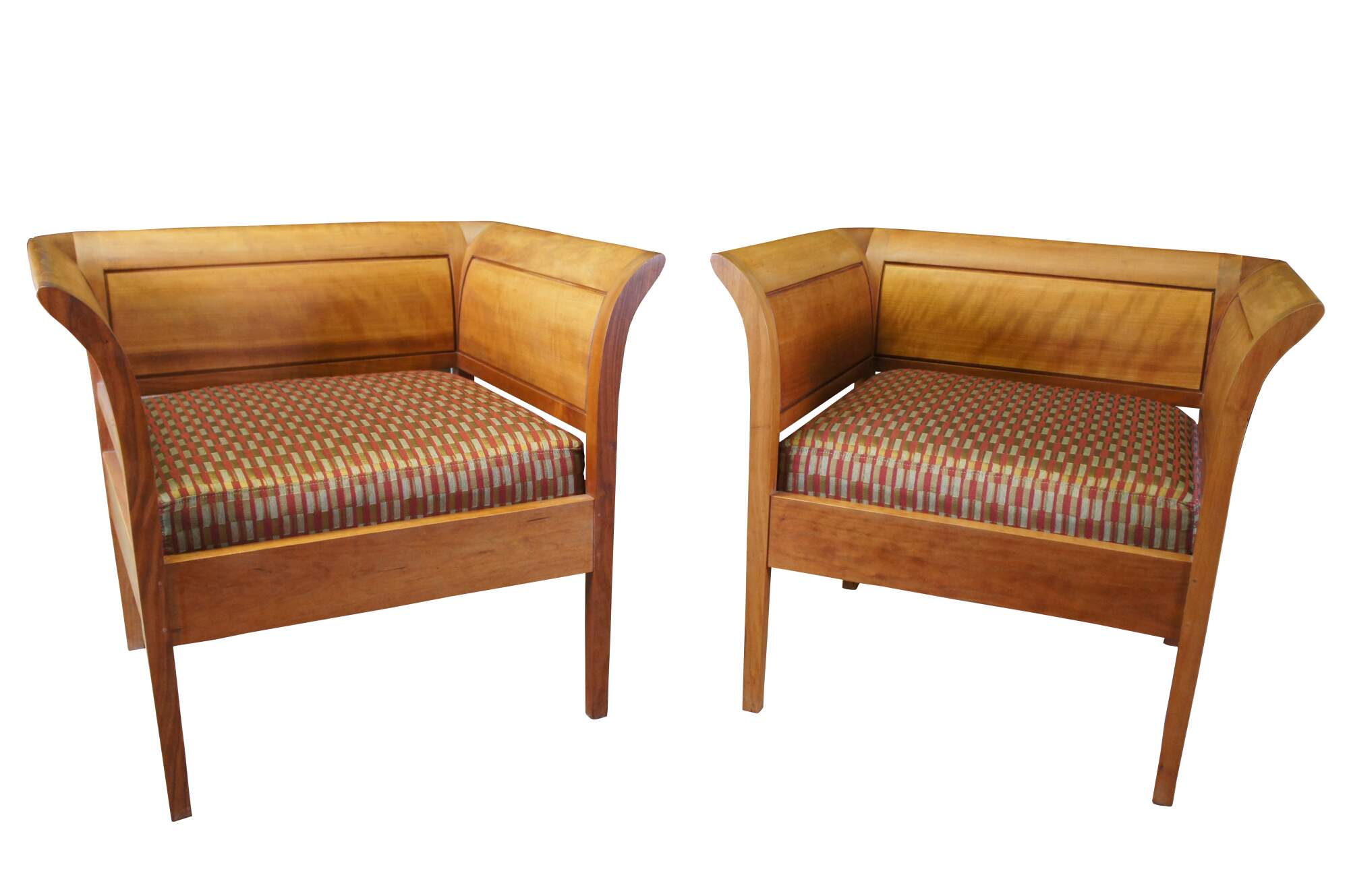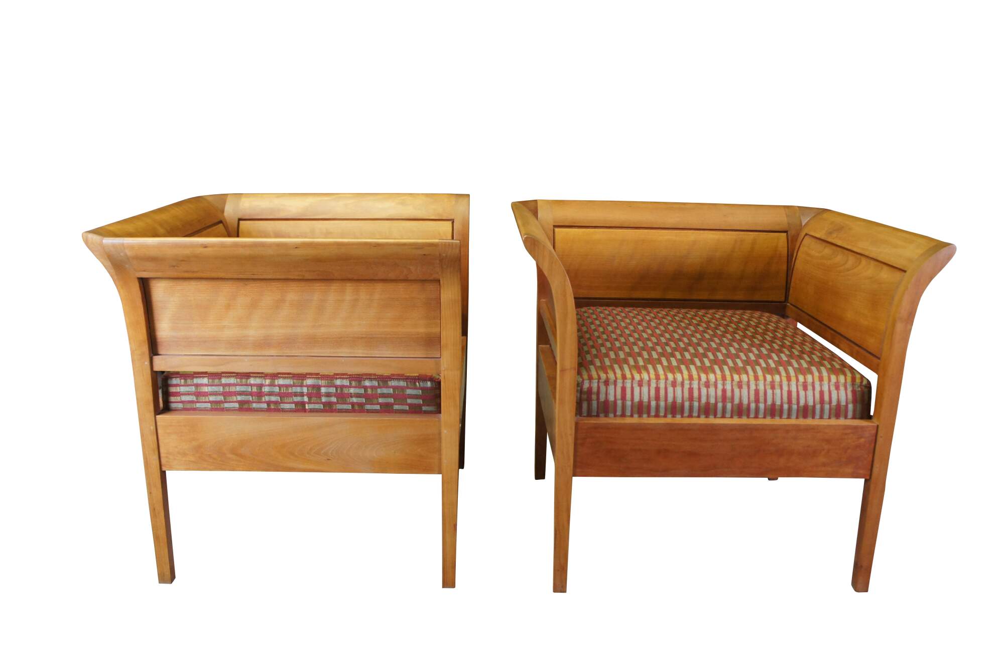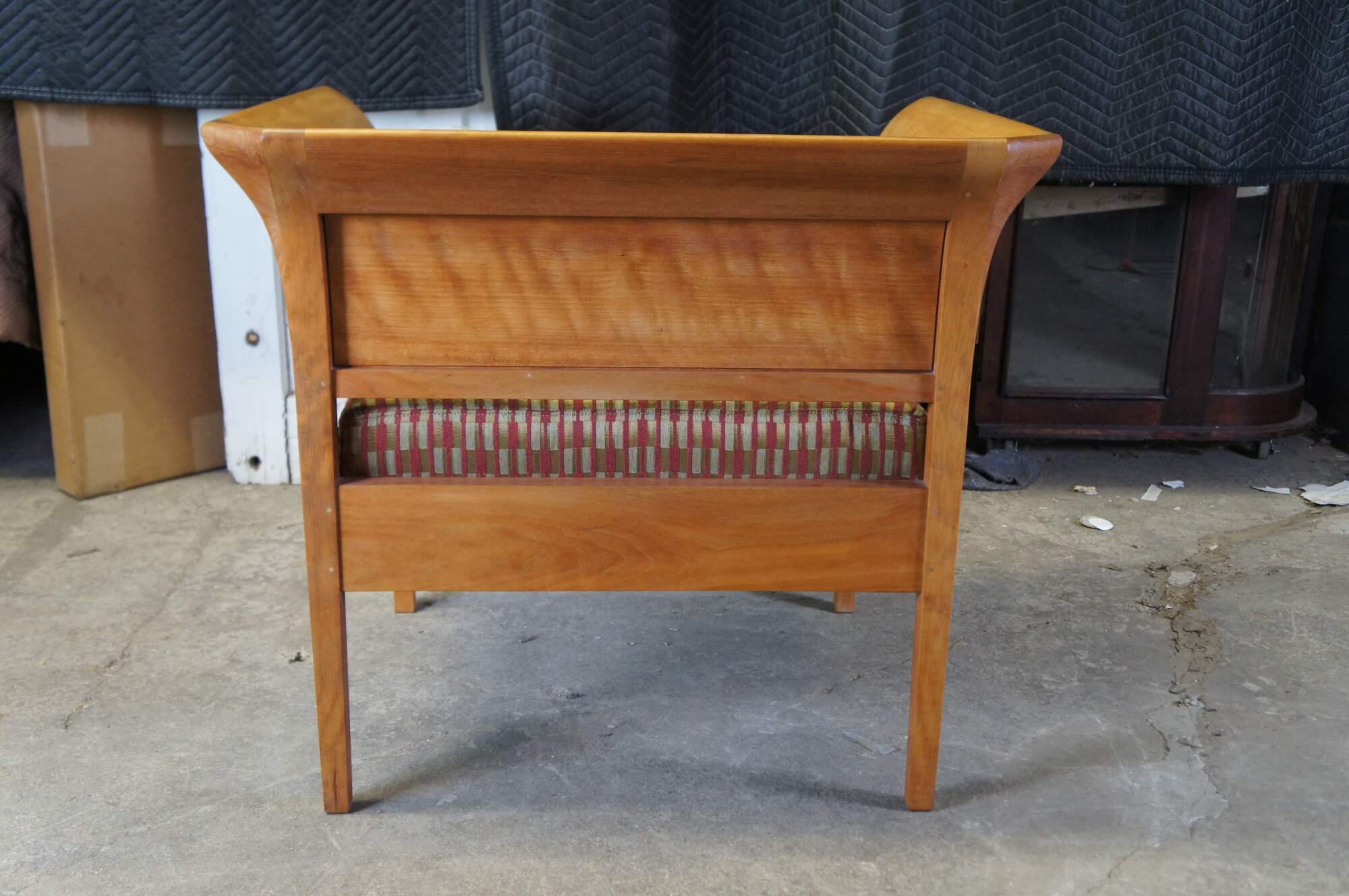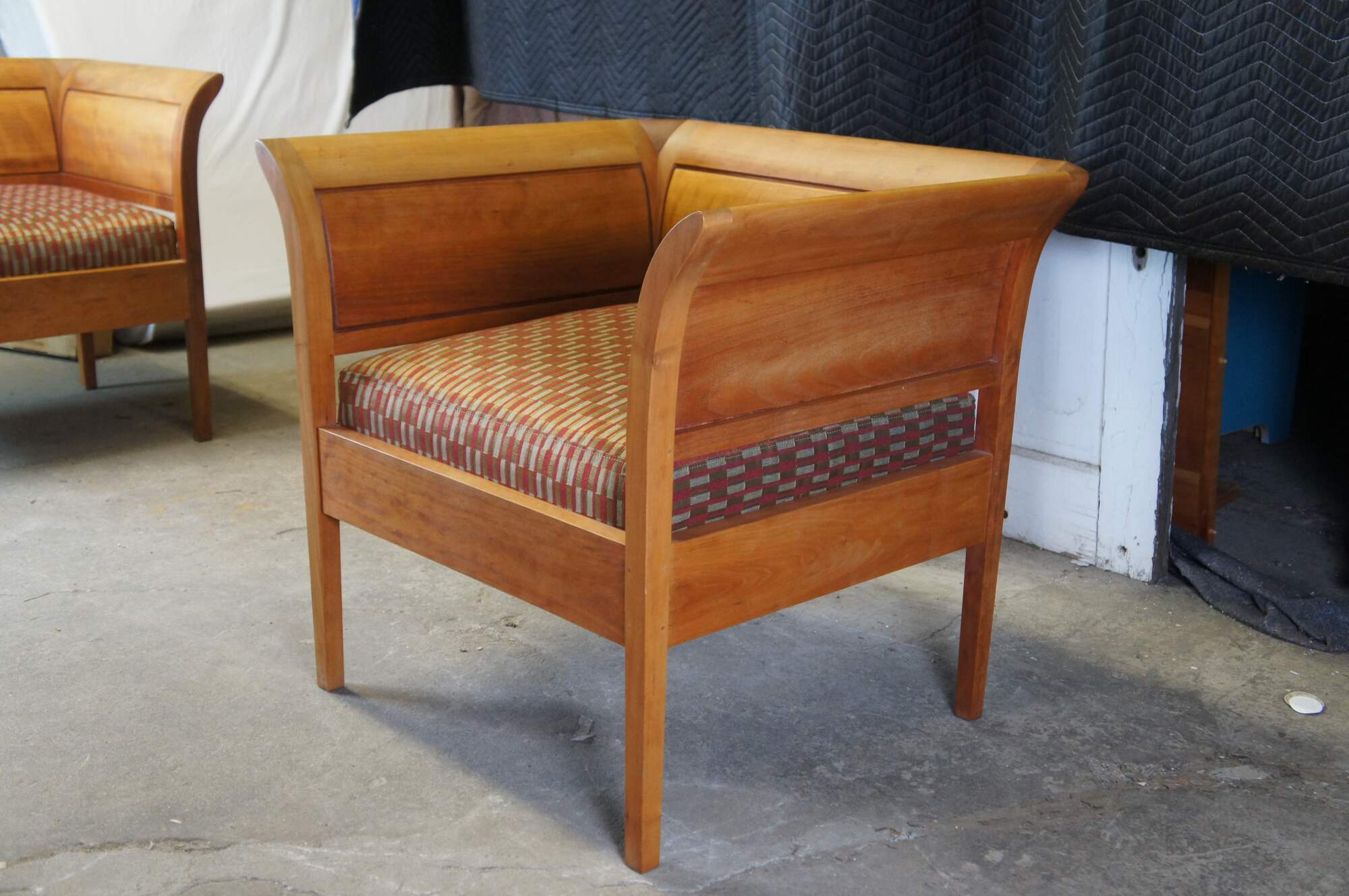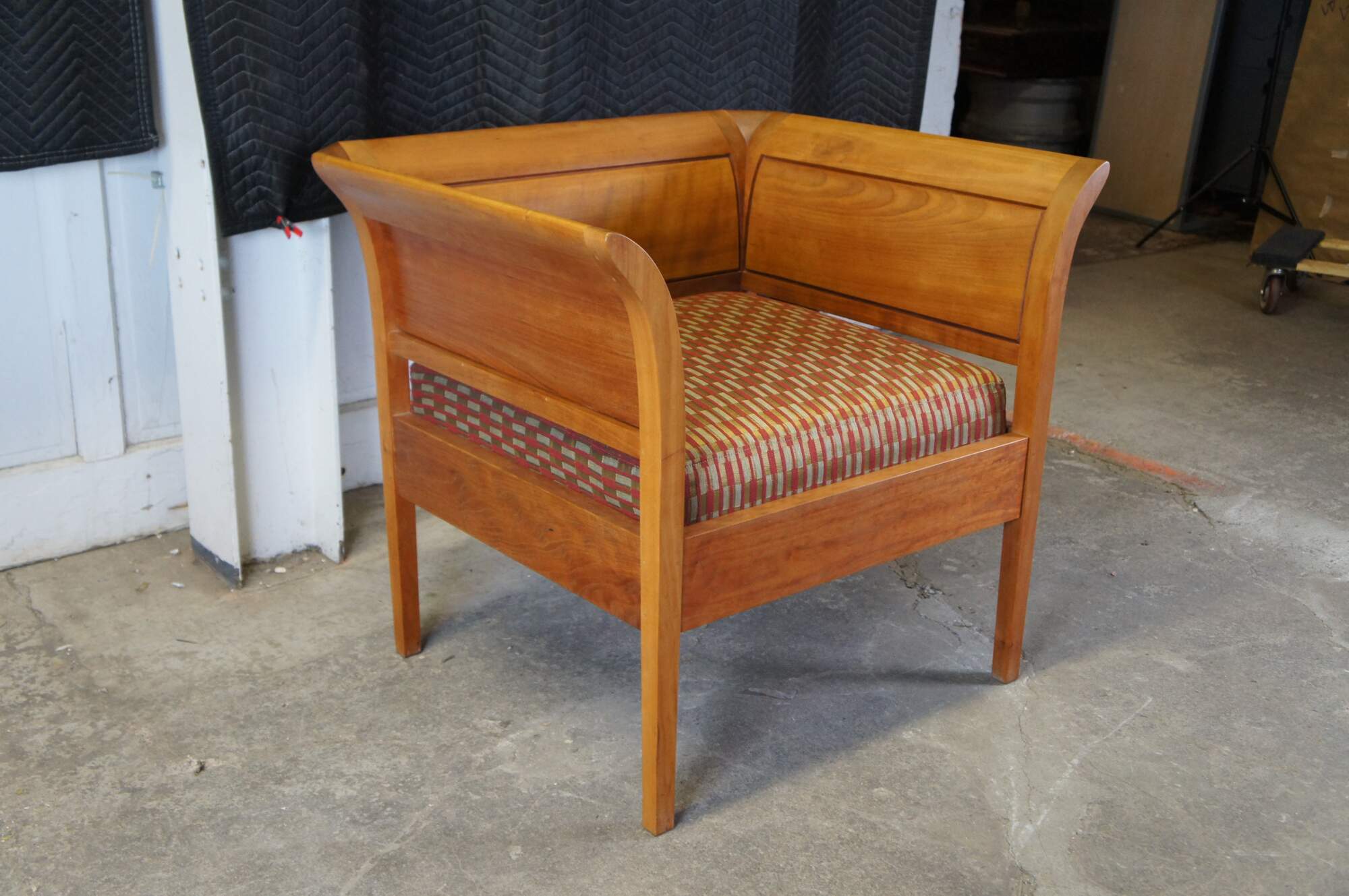 Two vintage large Thos Moser Sofia office / lounge armchairs. Made of cherry featuring modern styling with square and flared form, and paneled accents. Perhaps no other piece we've designed better celebrates the natural glory of cherry and our desire to create objects of timeless grace than the Sofia chair. One's eye is drawn along the swirling cherry patterns of its side panels to the darker, delicately tapered corner joint framed between. The long cherry panels and wine-glass-shaped corner joints remind us of the graceful lines of an old wooden boat transom. Circa 2007. Signed on base. Thomas Moser Cabinetmakers Auburn, Maine.