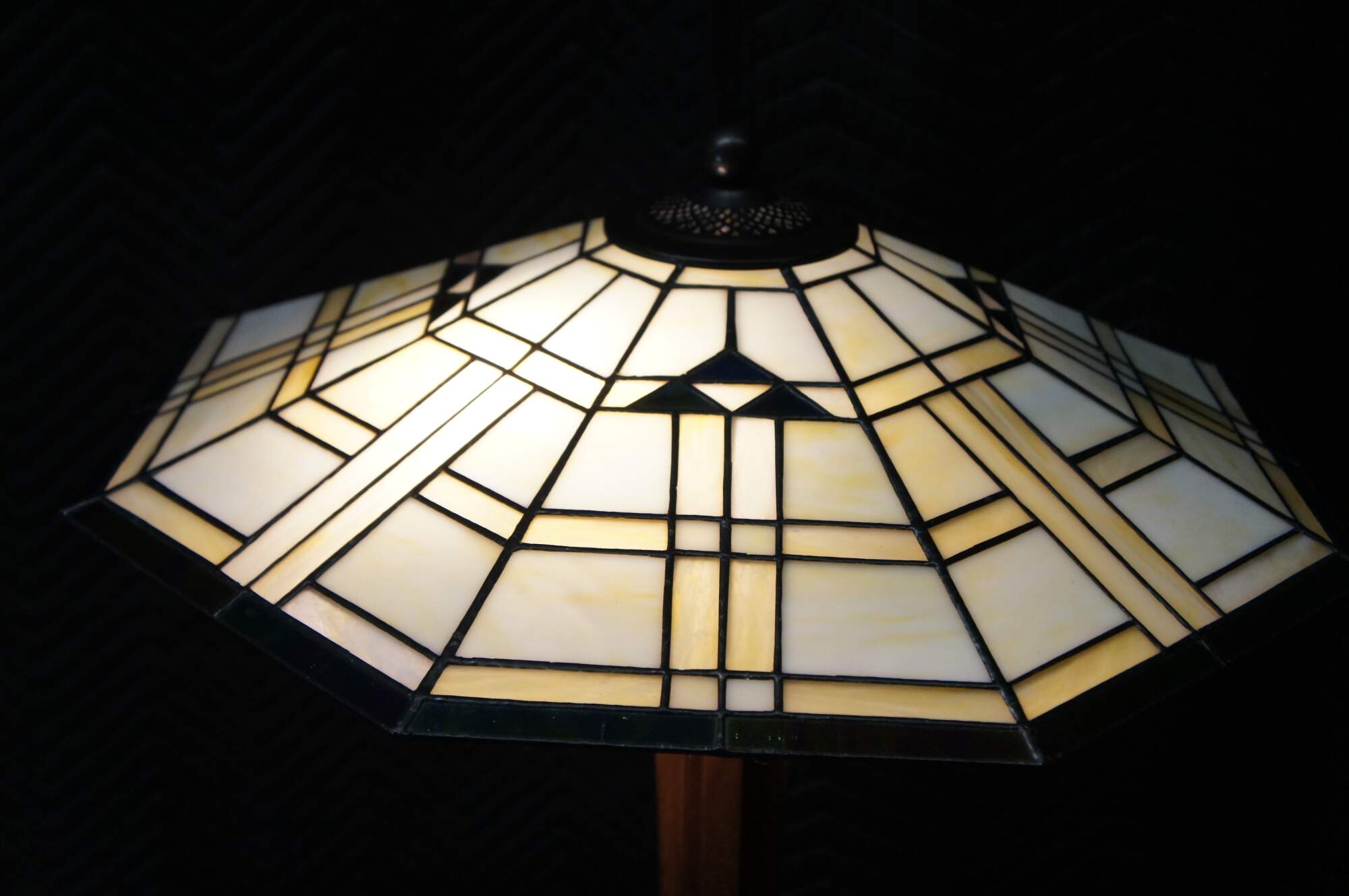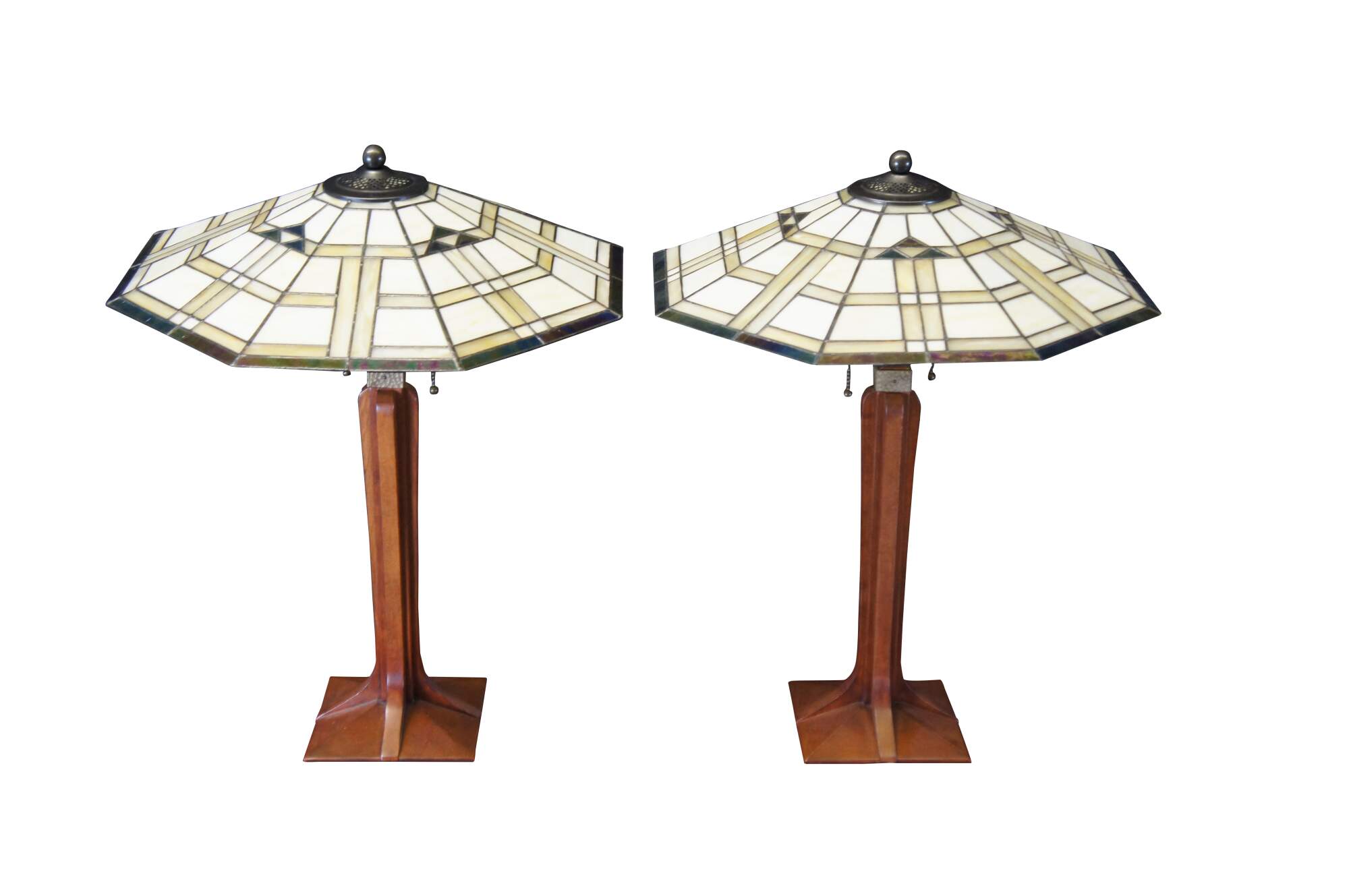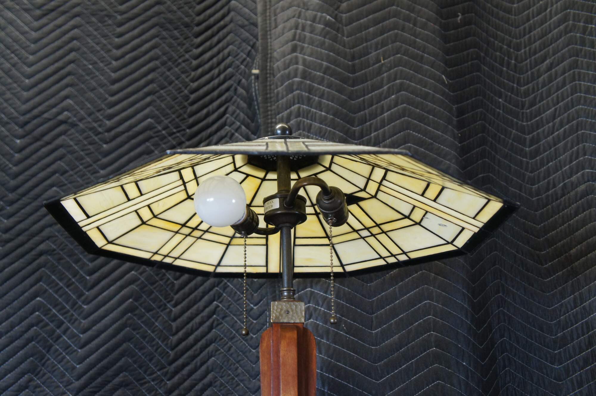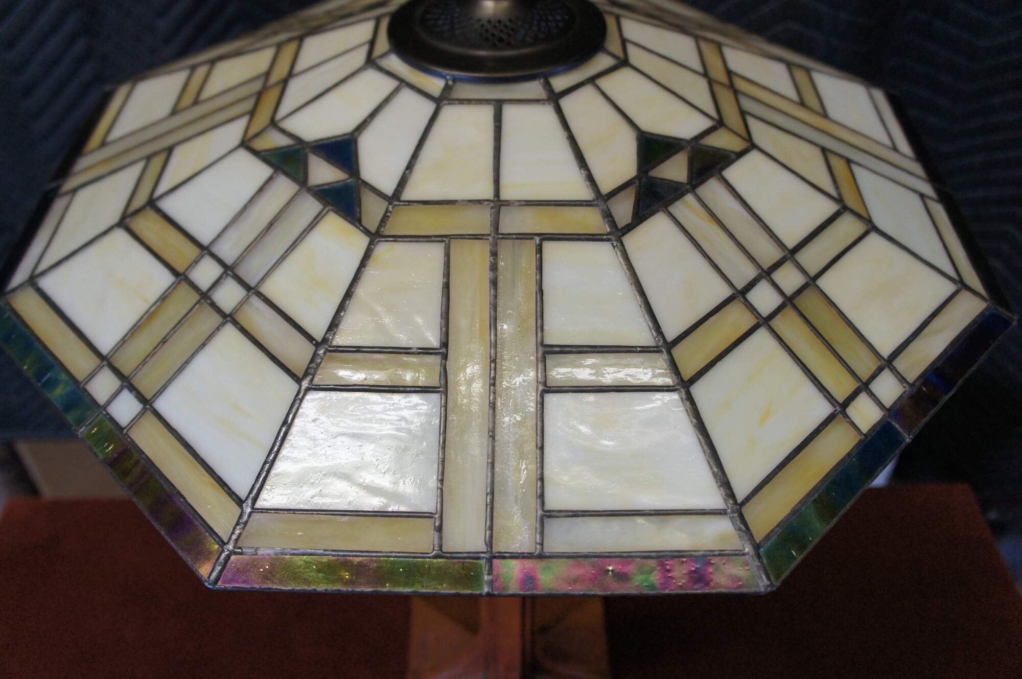 Set of two vintage Stickley library / office / table lamps. Made of cherry feautring Mission styling with octagonal stained glass shades. Circa 2007. #11. a