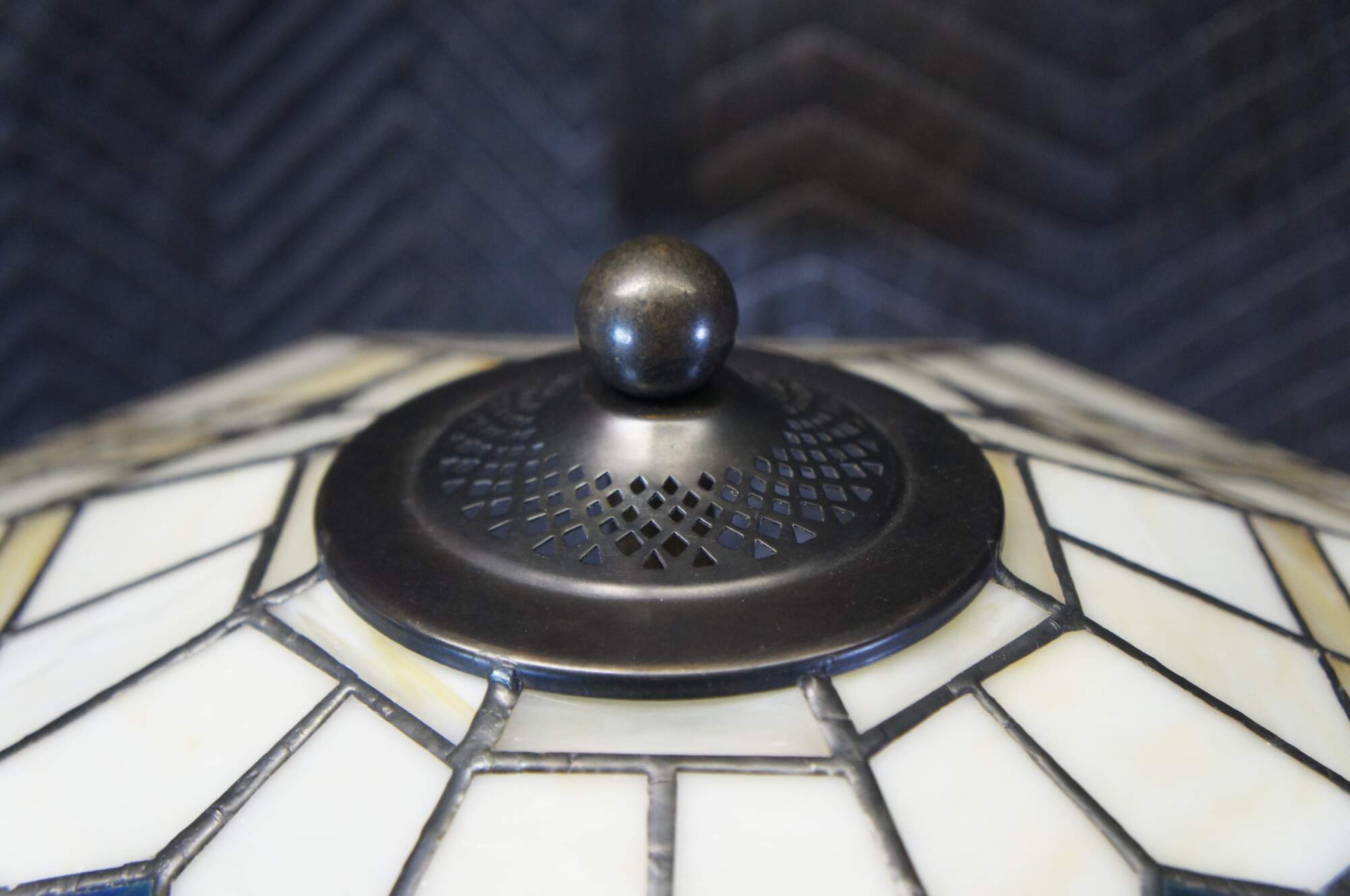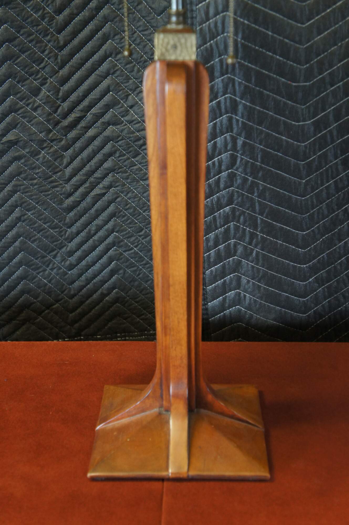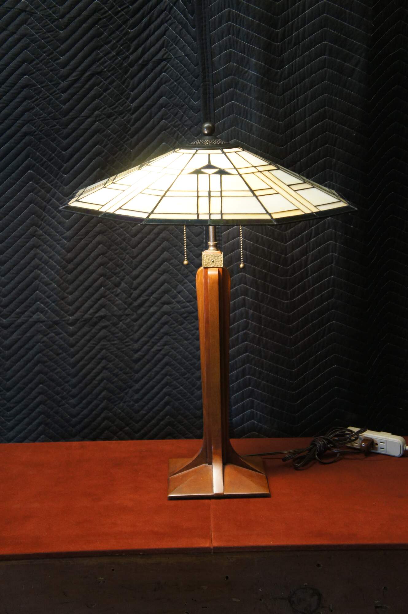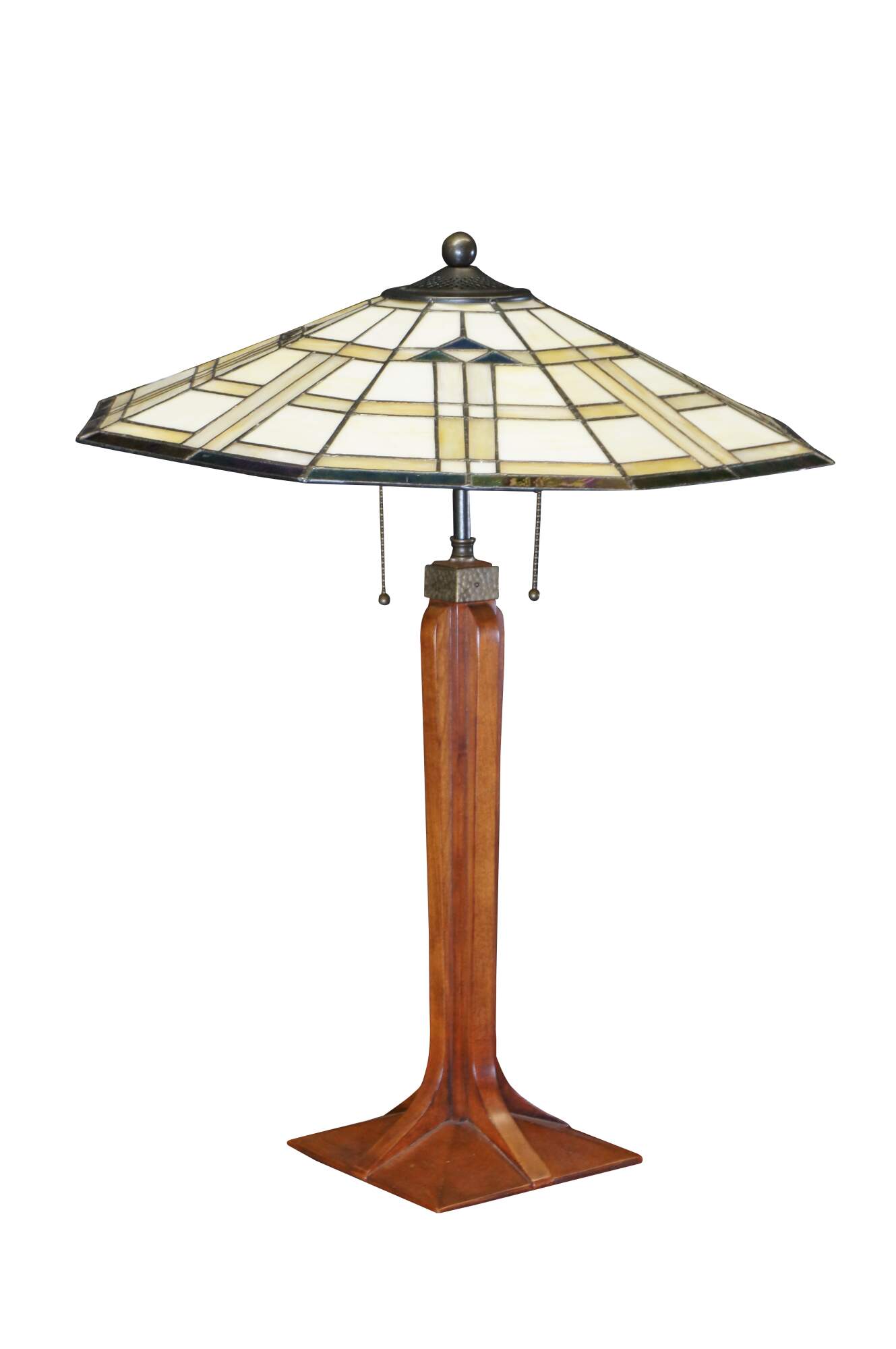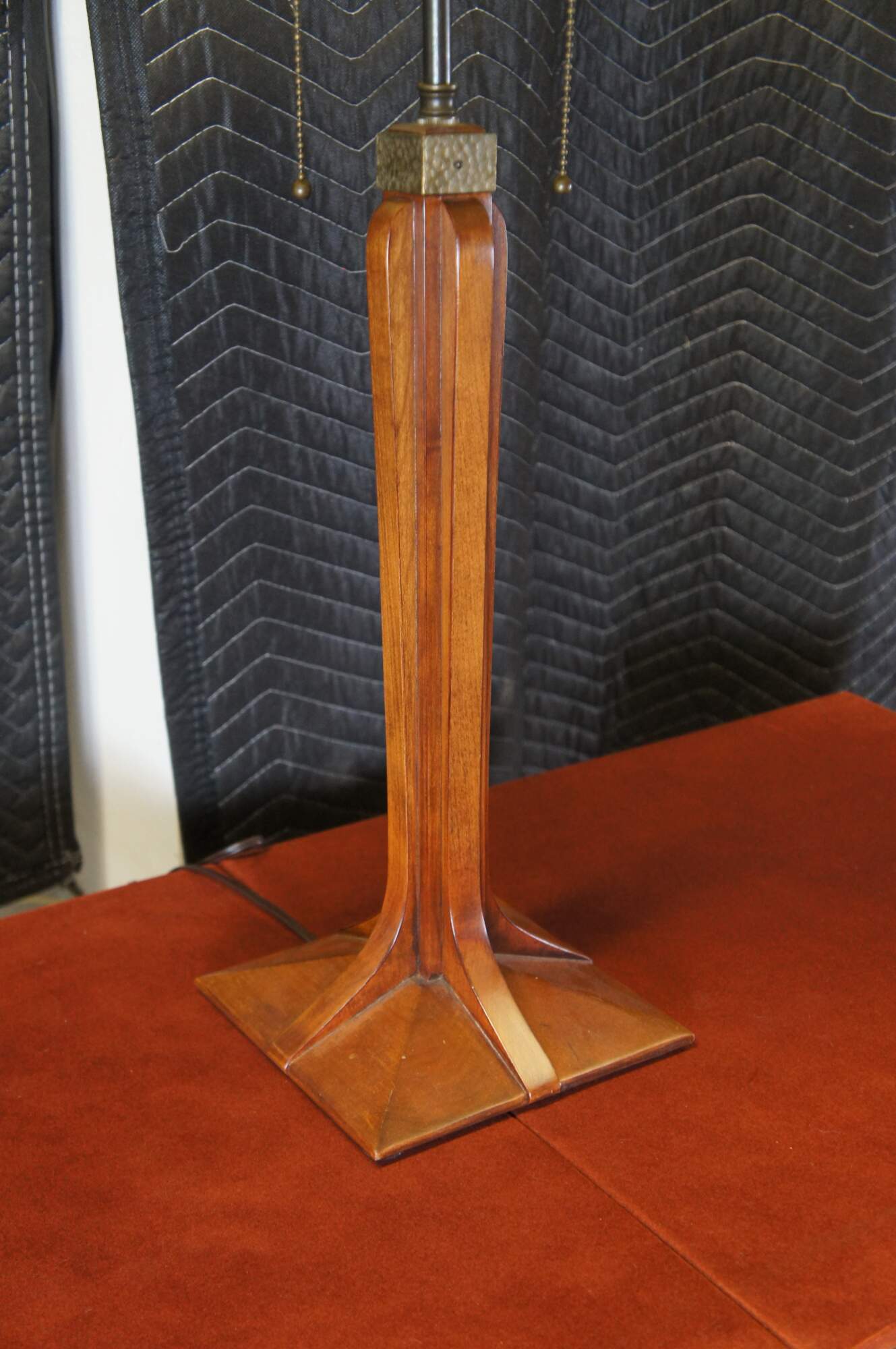 Set of two vintage Stickley library / office / table lamps. Made of cherry feautring Mission styling with octagonal stained glass shades. Circa 2007. #11. a