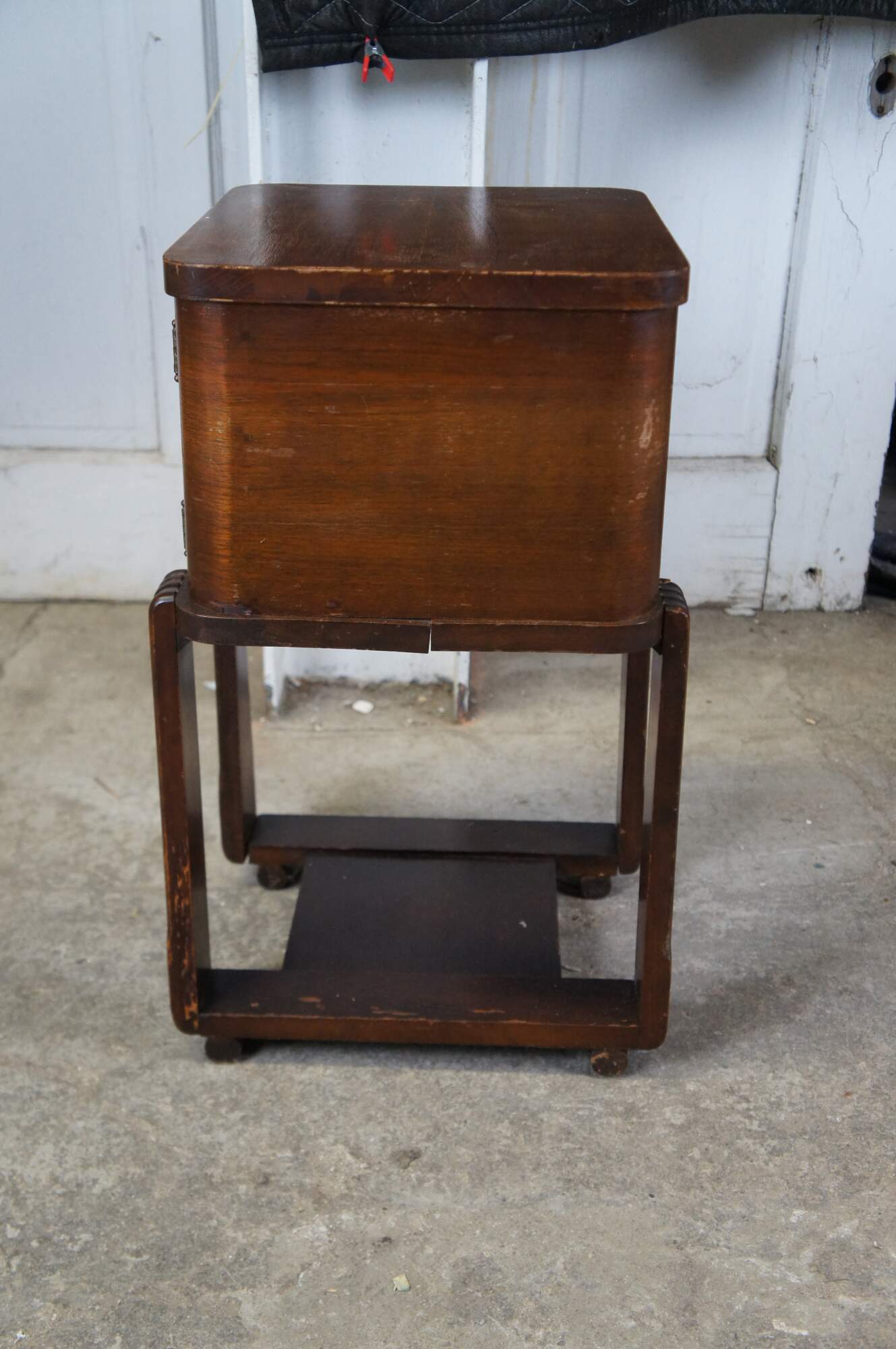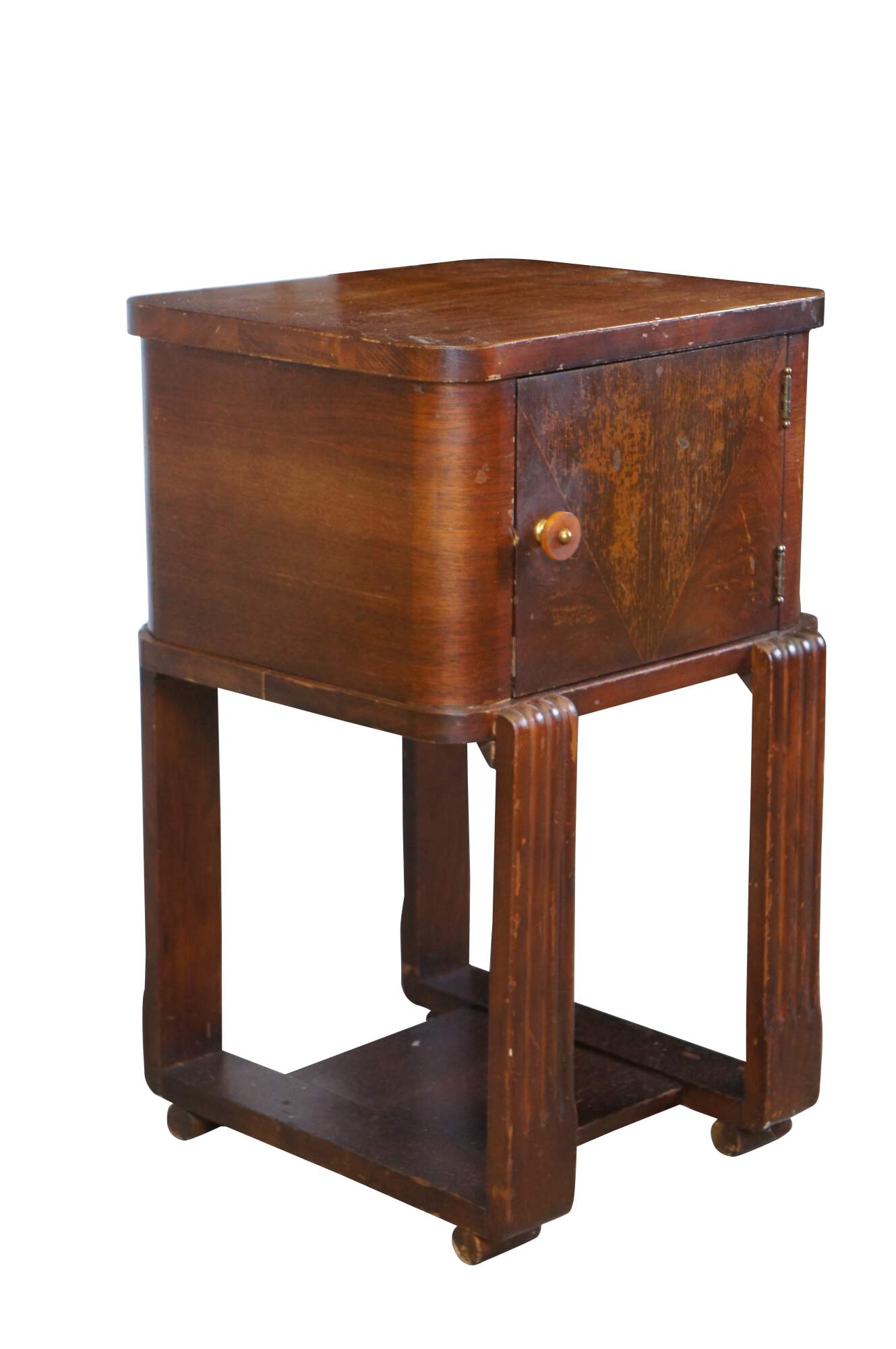 Antique humidor smoking stand side table. Made of walnut featuring square form with bakelite knob, copper lined cabinet, and fluted legs.
