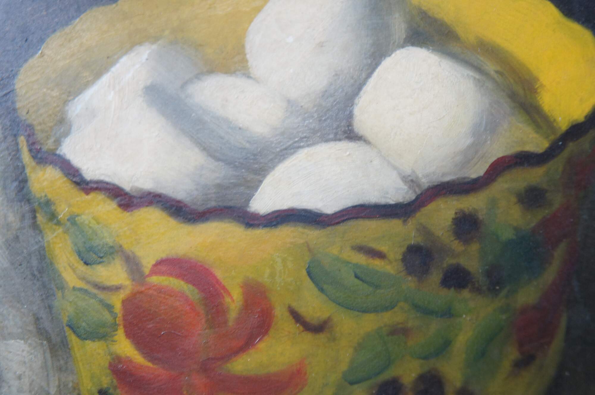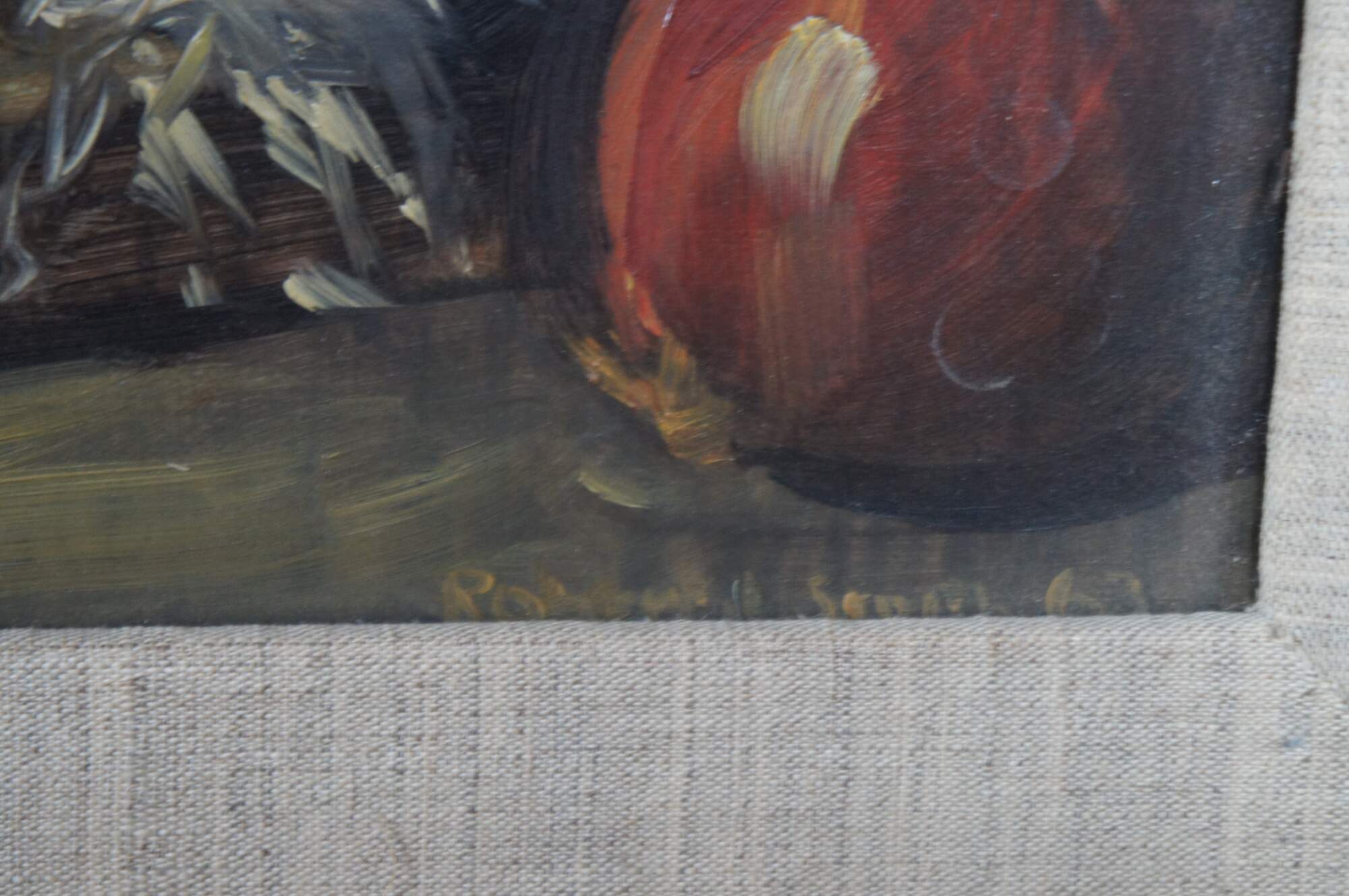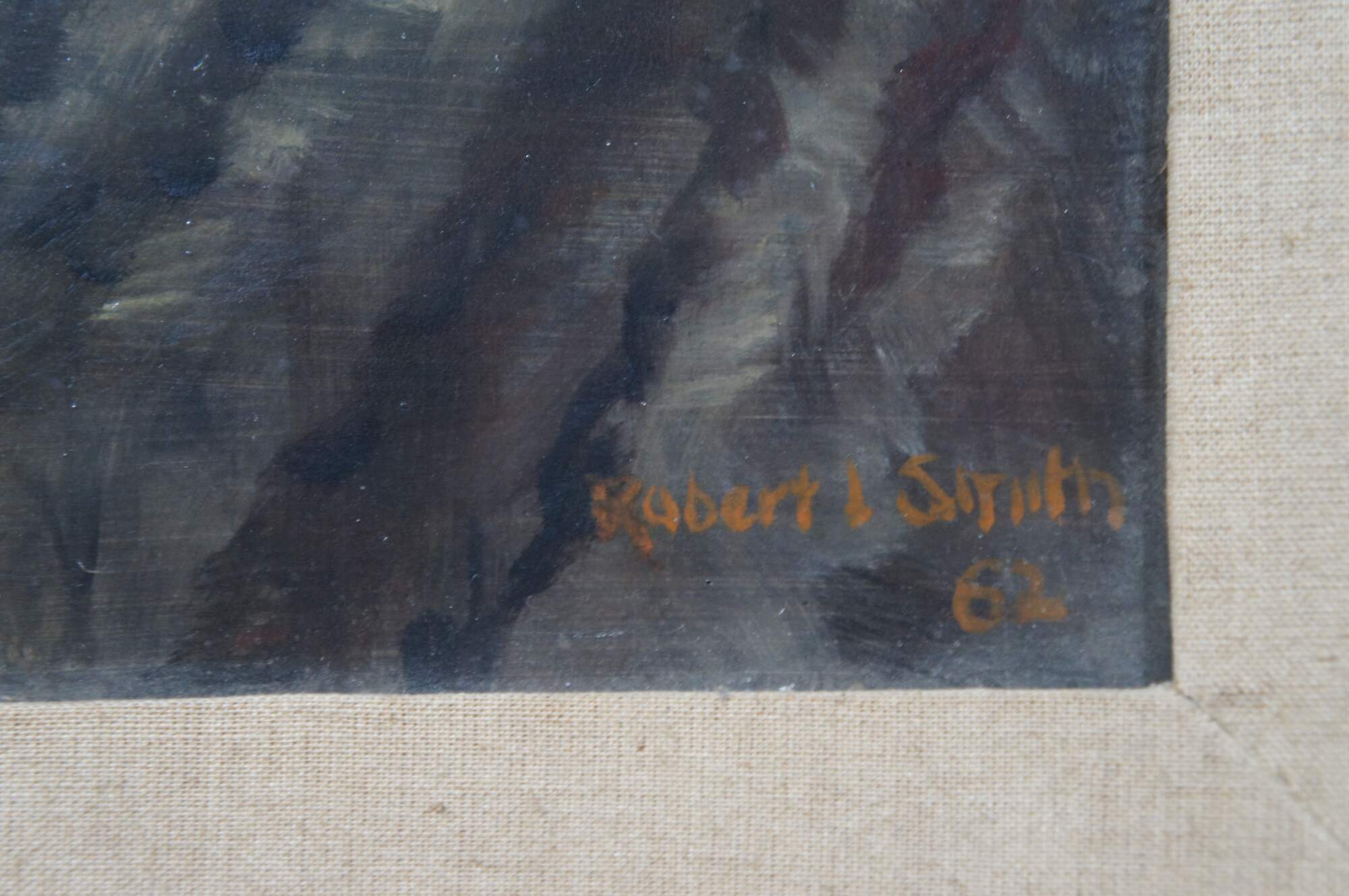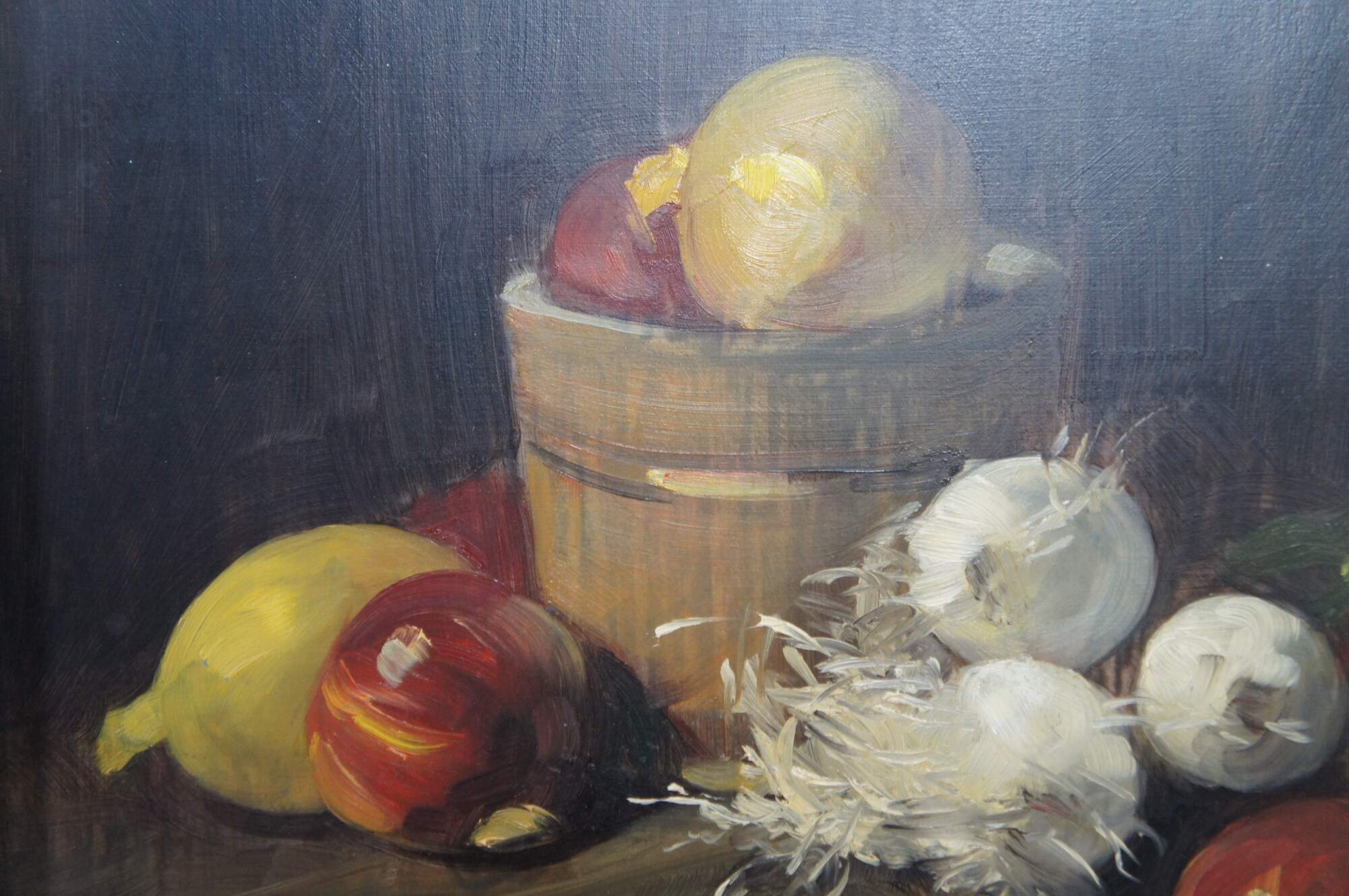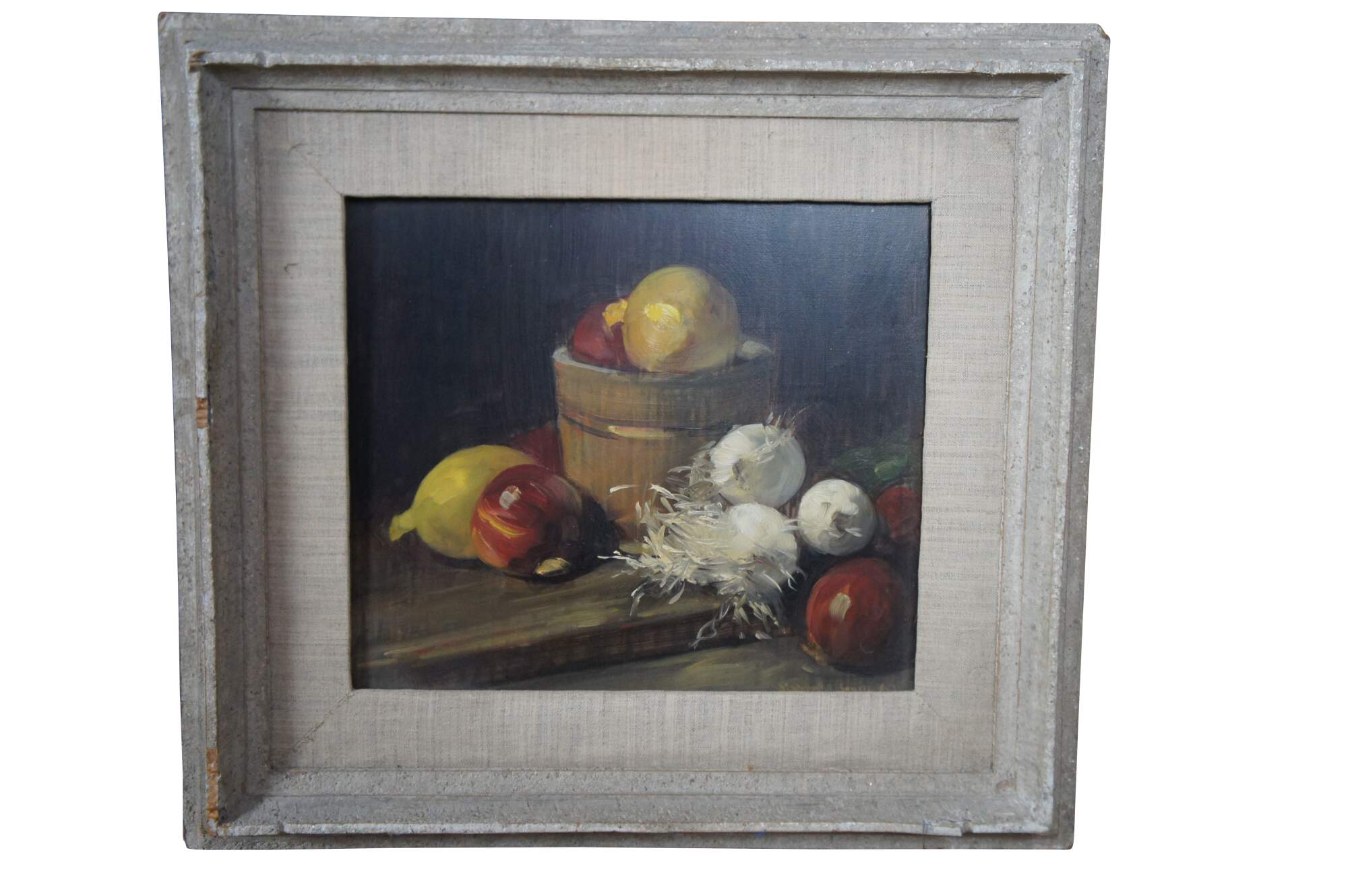 2 Robert J Smith Still Life Oil Paintings on Masonite, circa 1968. One features a porcelain bowl full of marshmellows and the other showcases a wooden container with fruit and vegetables. Signed lower right. Robert J Smith, 1901-1985. He was active on California and Dayton, Ohio. By 1916 Smith had an art studio in San Francisco. He was part of exhibitions held in Paris, New York and Los Angeles. He was influenced by The Baroque Master's. Also had exhibitions at the National Academy Of Design, Metropolitan Museum Of Art, and The Dayton Art Institute.