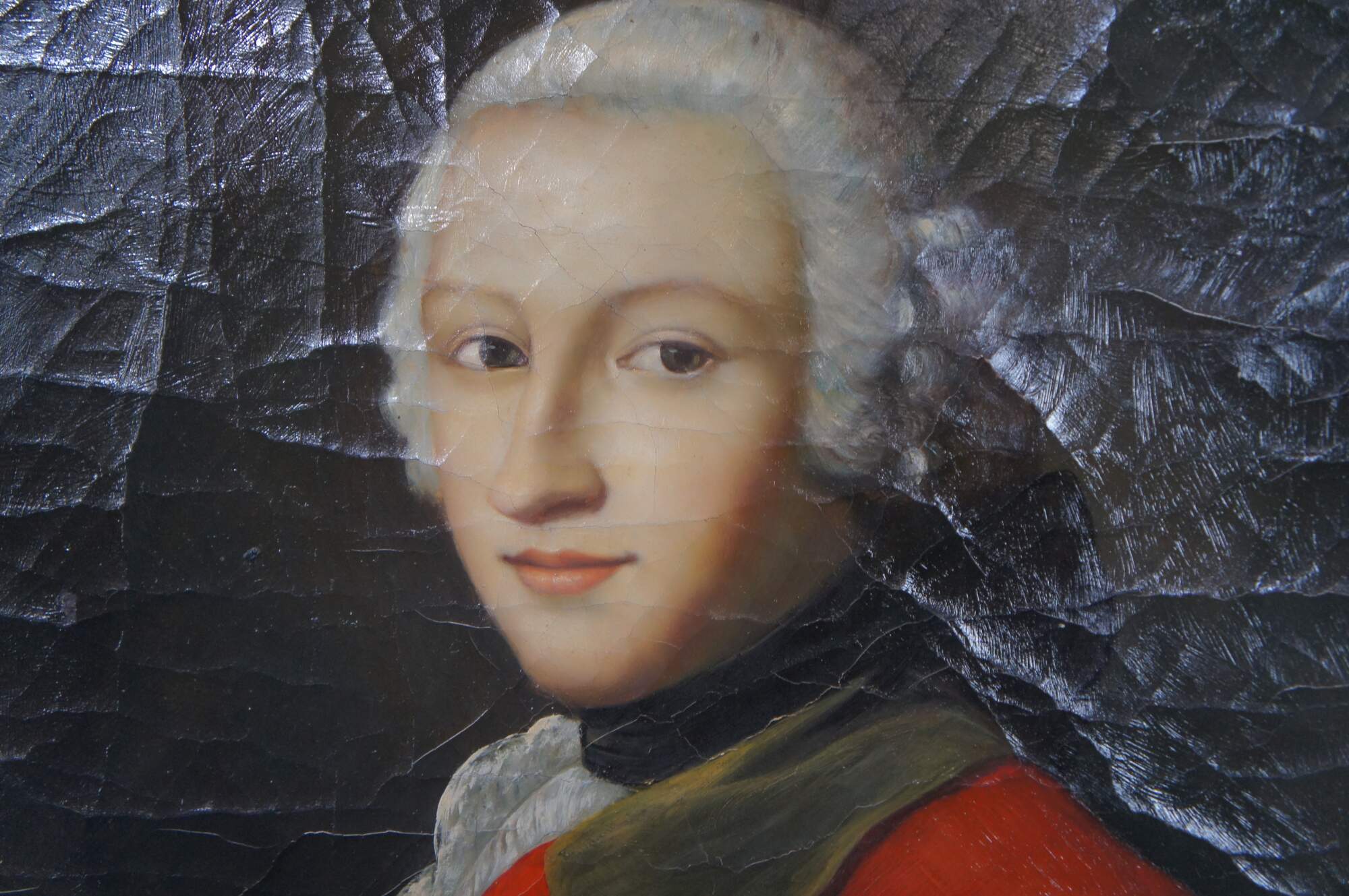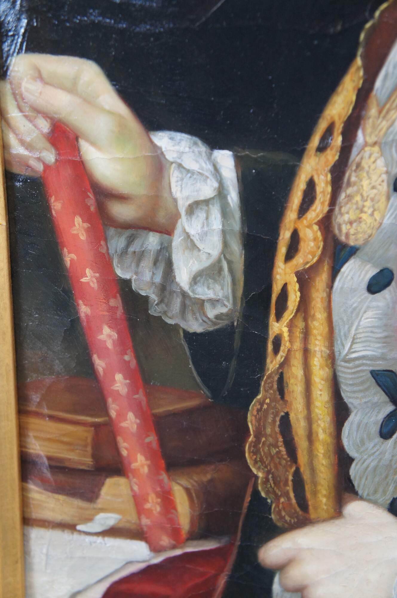 Late 20th century reproduction oil painting on canvas after a Portrait of the Duke of Savoy wearing the badge and star of the Order of the Annuziata, originally painted by Maria Giovanna Clementi circa 1746-61. Signed in lower right corner. Baroque / Rococo style gold frame with scrolling acanthus foliate.