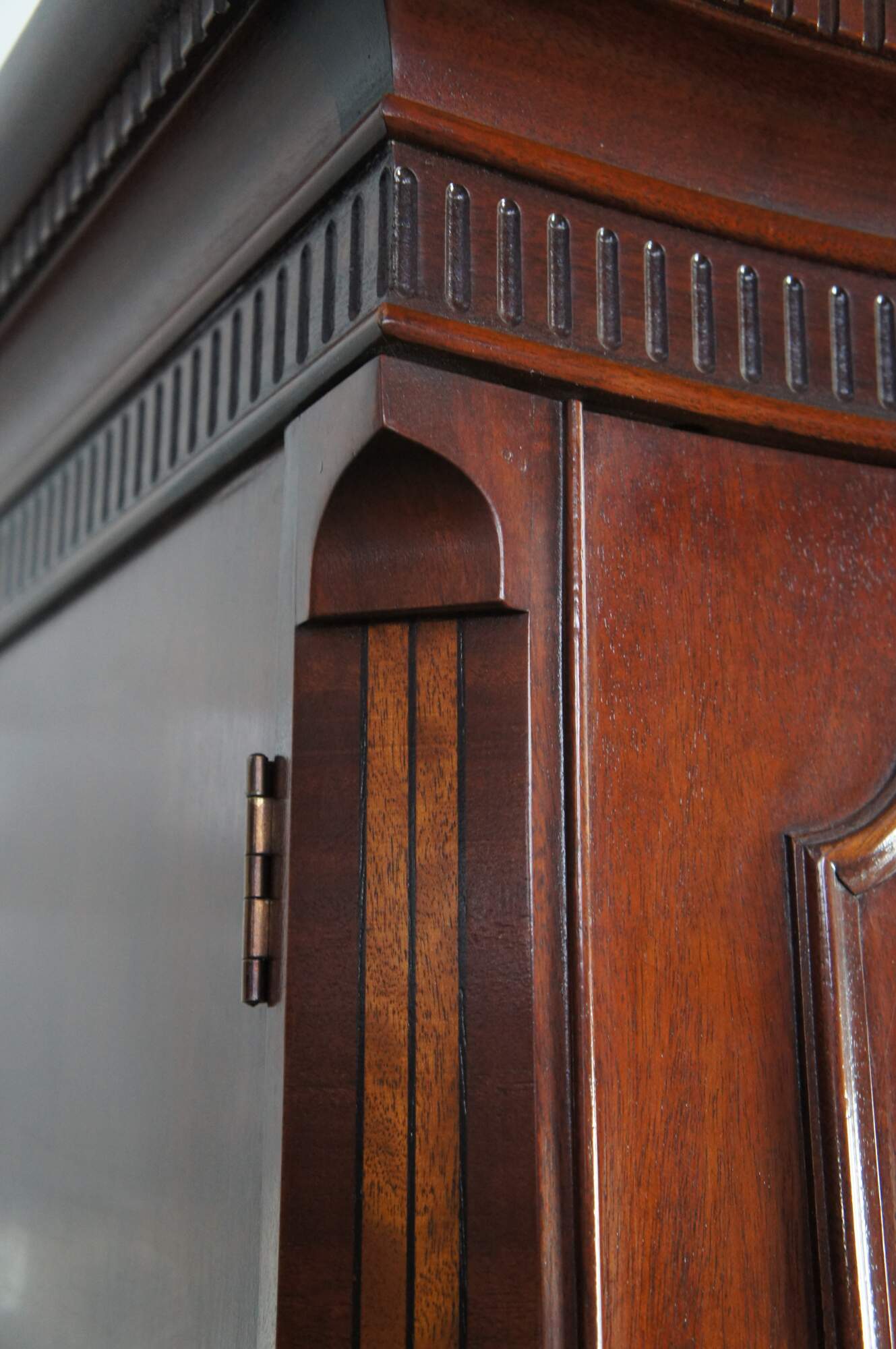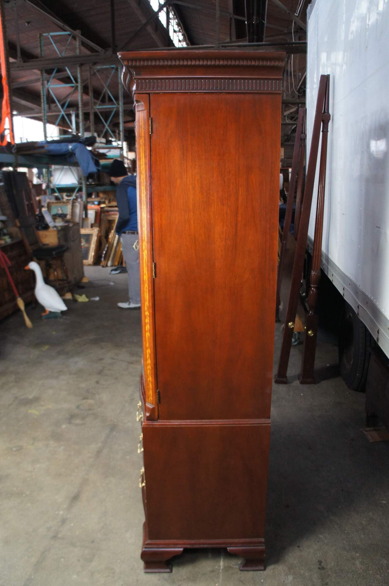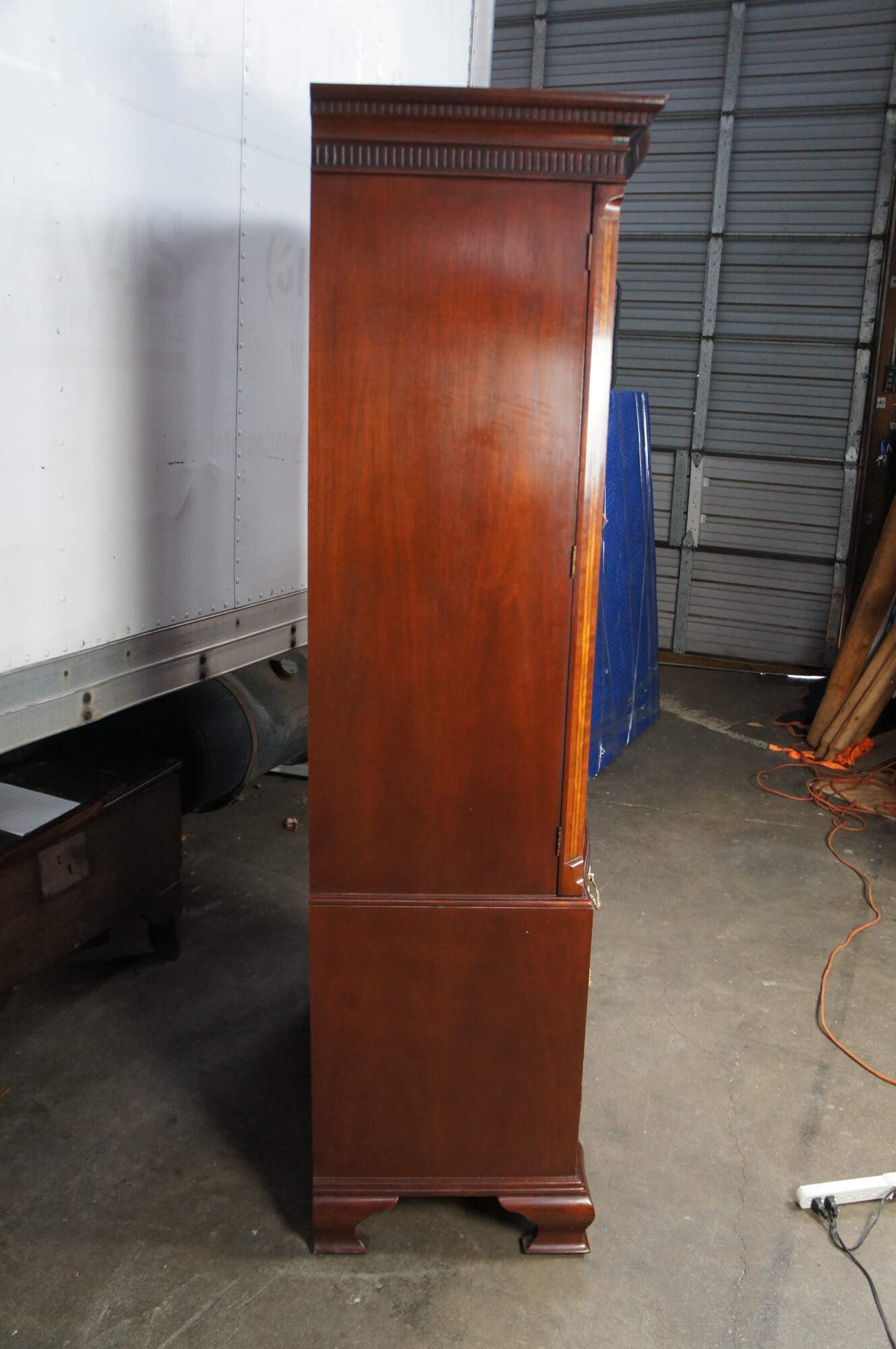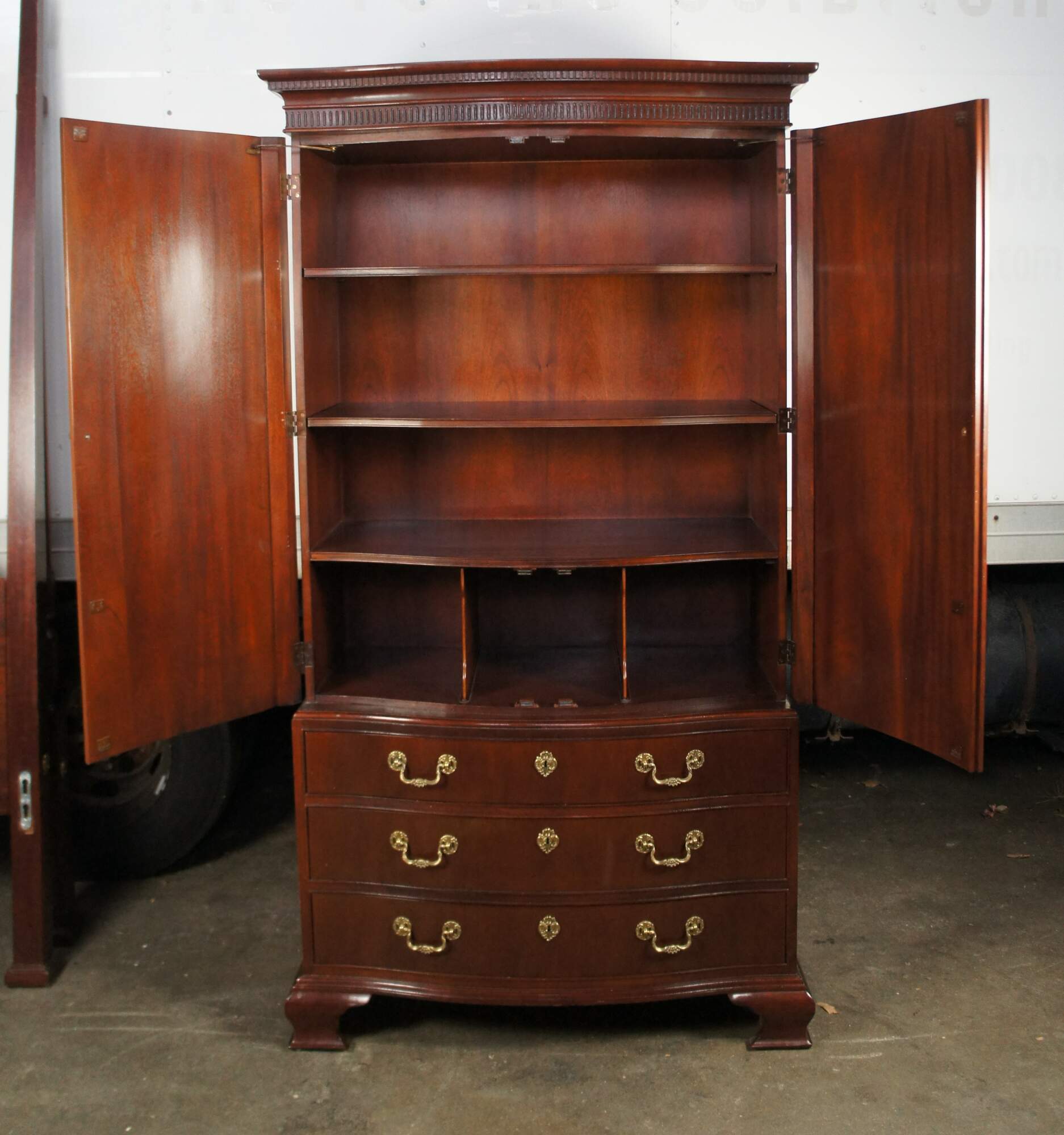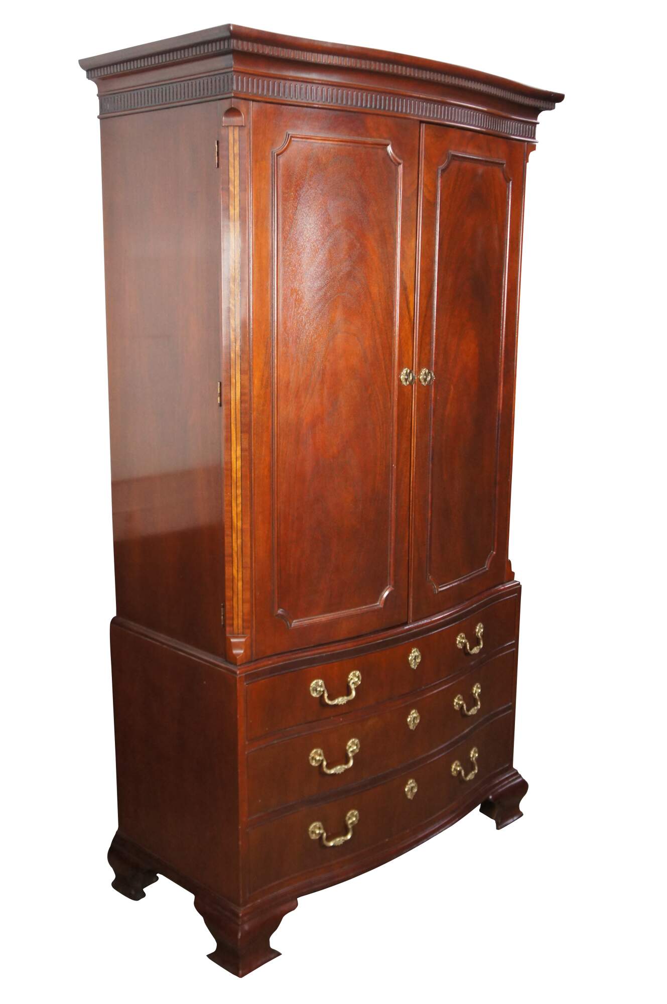 1980s Baker Furniture Georgian Style Armoire or Wardrobe. Made from mahgoany with a serpentine bowfront and chamfered stiles with striped inlay terminating into a rams tongue. The cabinet opens to a linen press format with shelves for clothing over lower cubbies. The bottom portion has three dovetailed drawers with ornate brass bail hardware. The crown showcases a carved dentil molding over a band of fluting. Base is supported by bracket feet. Marked along the backside 4506,407-2.