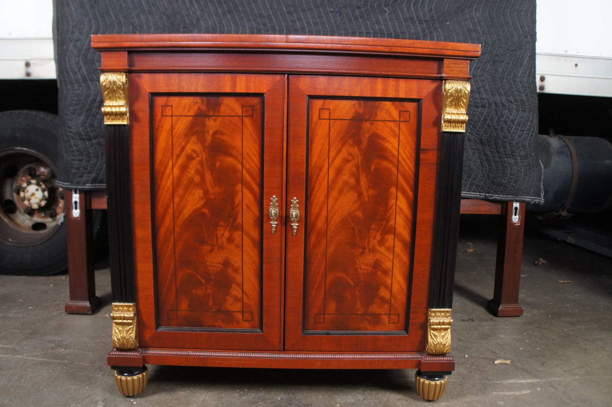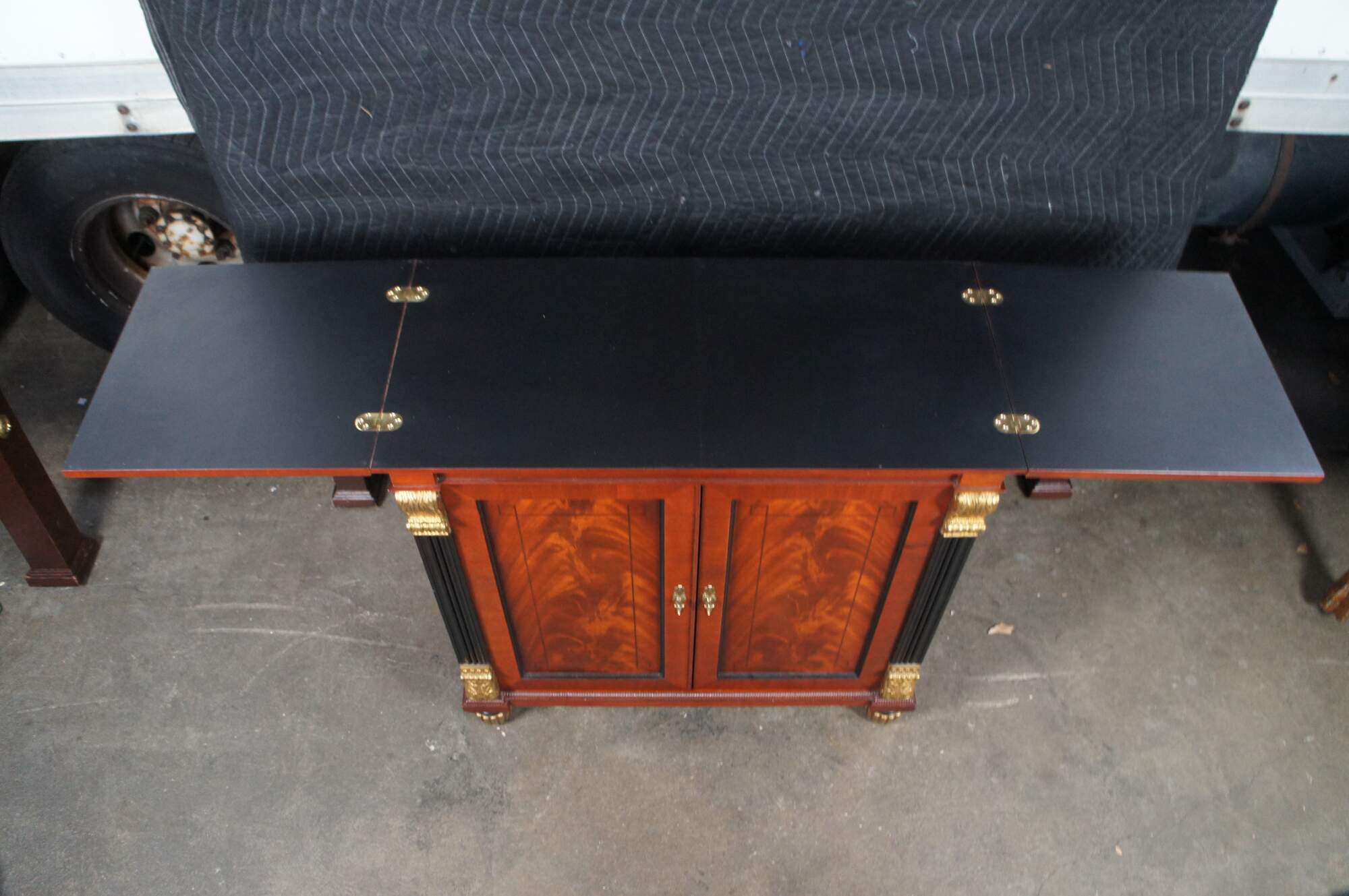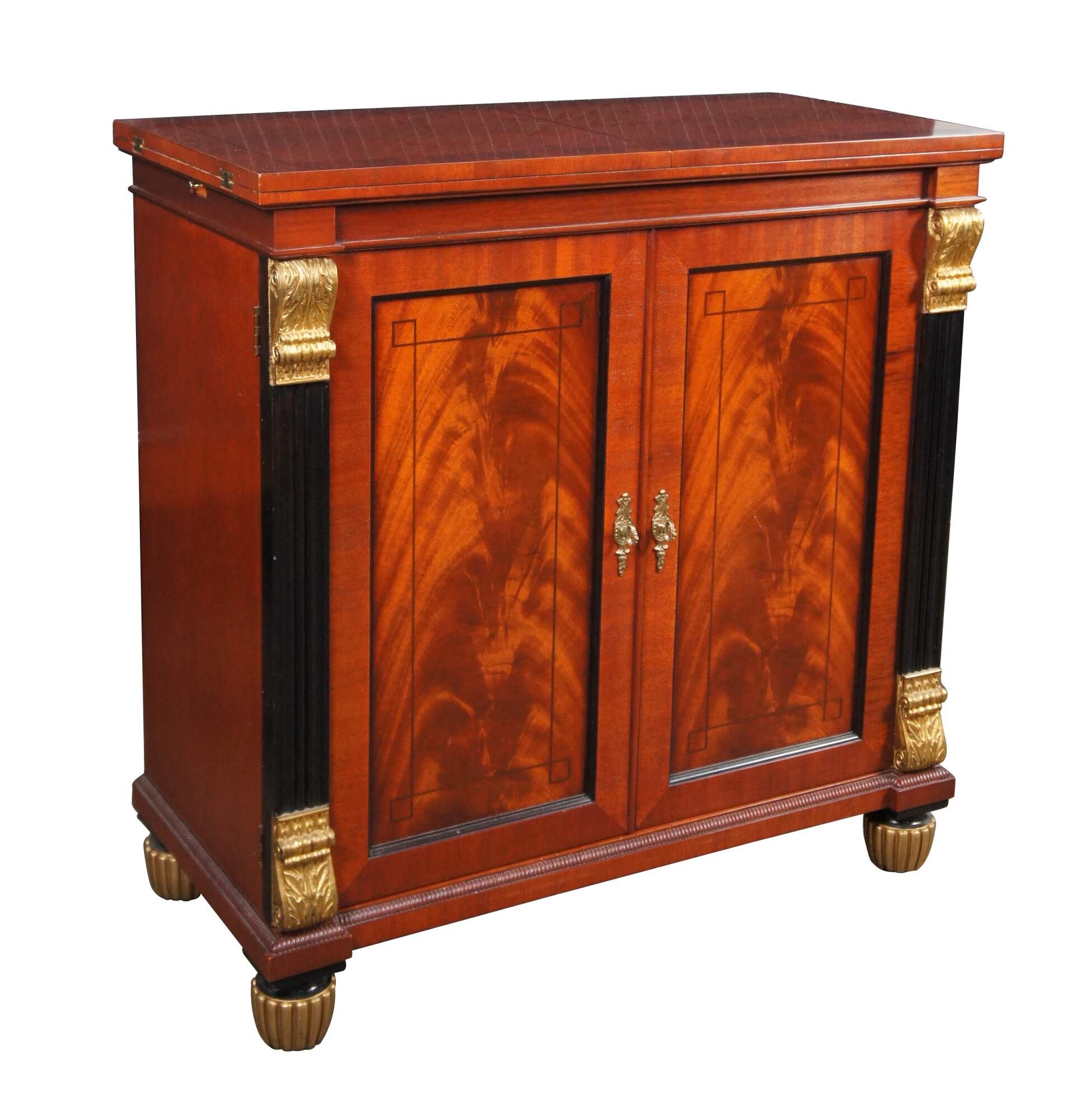 Exceptional Baker Furniture Company flip-top server, circa 1980s. Inspired by English Regency, Neoclassical, and French Empire styling. A rectangular form made from mahogany with flame (crotch) mahogany door fronts and magnificent inlay. Features acanthus carved and fluted gilt and ebonized columns along the front over ribbed bun feet. The top flips open to reveal a Formica top perfect for serving. Lower cabinet opens to a dovetailed felt-lined drawer over two lower shelves. An eye-catcher for any dining room, bar, or library. Baker paper tag and metal plate along the left interior side of the drawer.