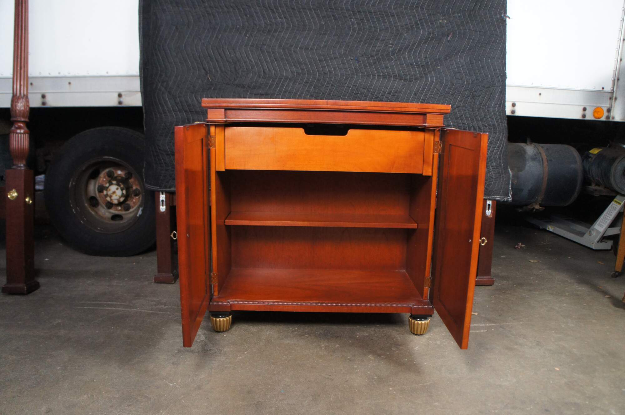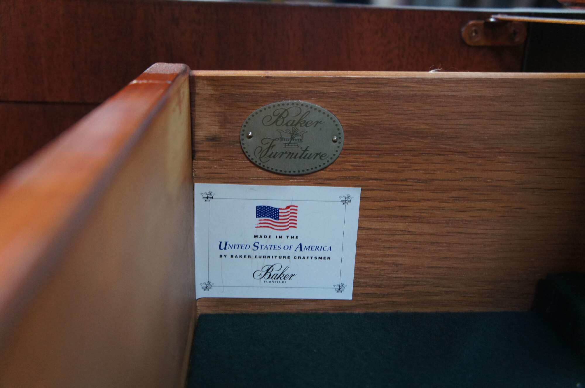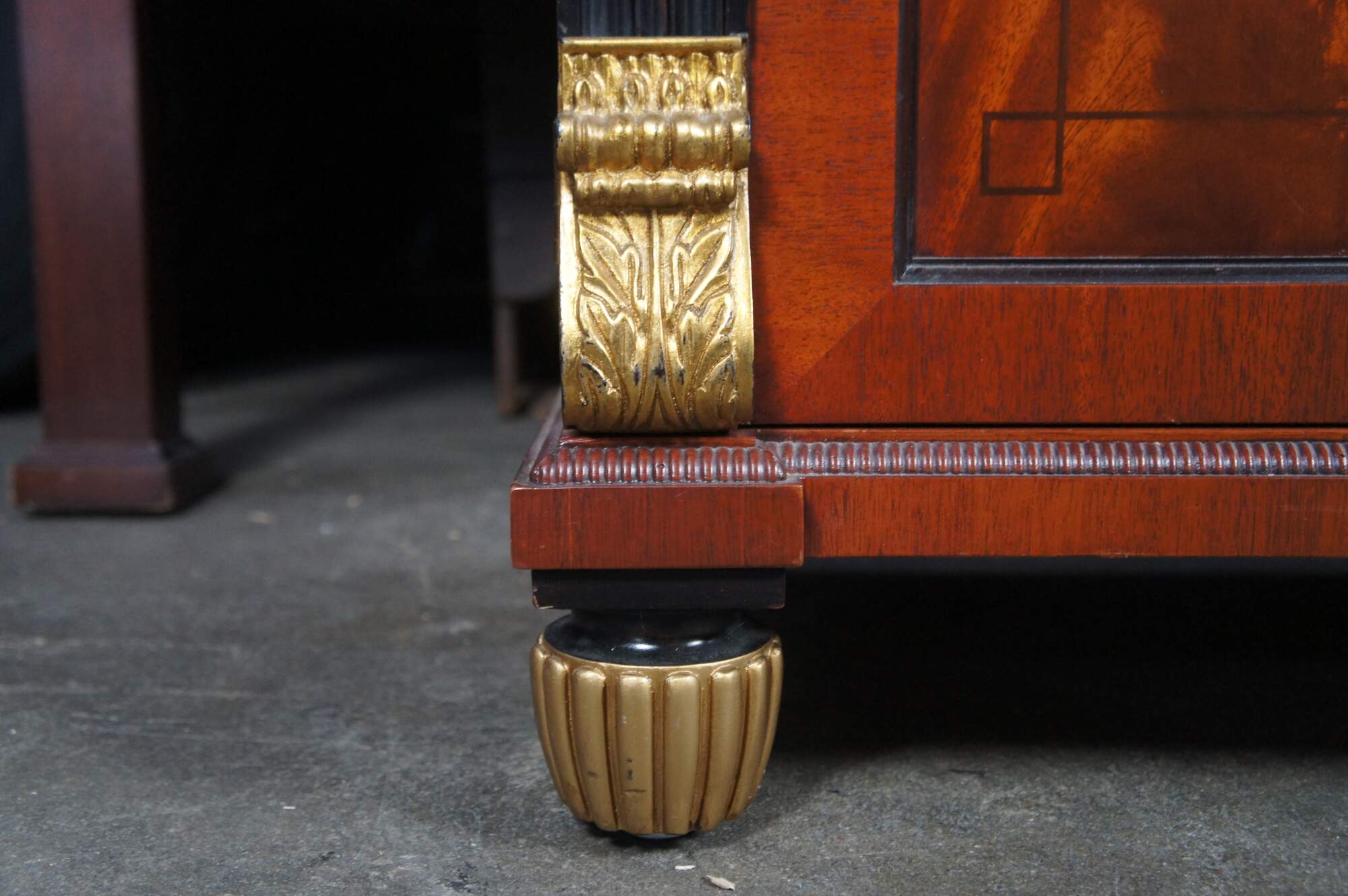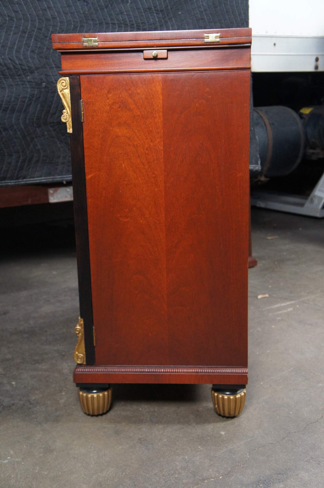 Exceptional Baker Furniture Company flip-top server, circa 1980s. Inspired by English Regency, Neoclassical, and French Empire styling. A rectangular form made from mahogany with flame (crotch) mahogany door fronts and magnificent inlay. Features acanthus carved and fluted gilt and ebonized columns along the front over ribbed bun feet. The top flips open to reveal a Formica top perfect for serving. Lower cabinet opens to a dovetailed felt-lined drawer over two lower shelves. An eye-catcher for any dining room, bar, or library. Baker paper tag and metal plate along the left interior side of the drawer.