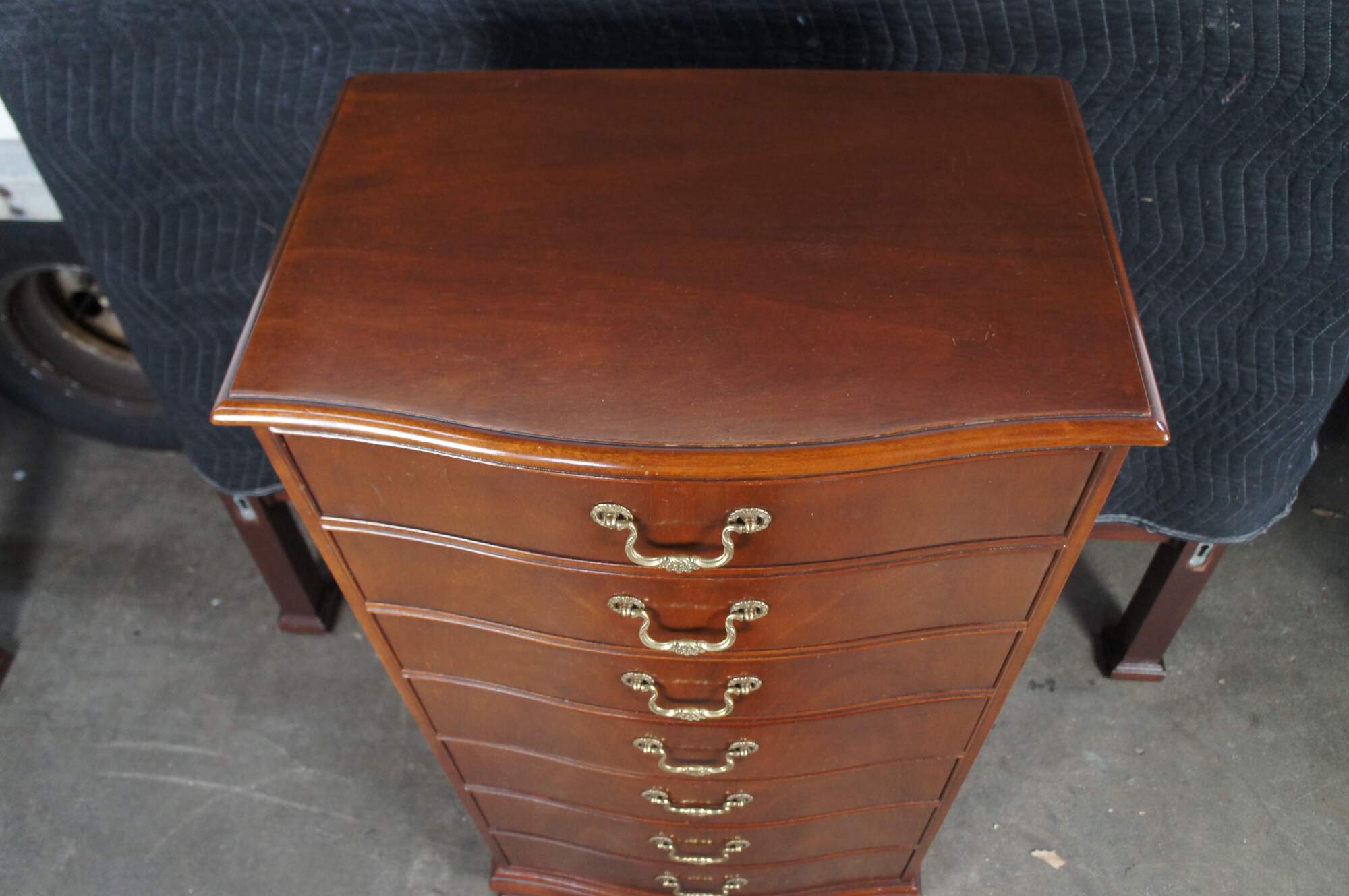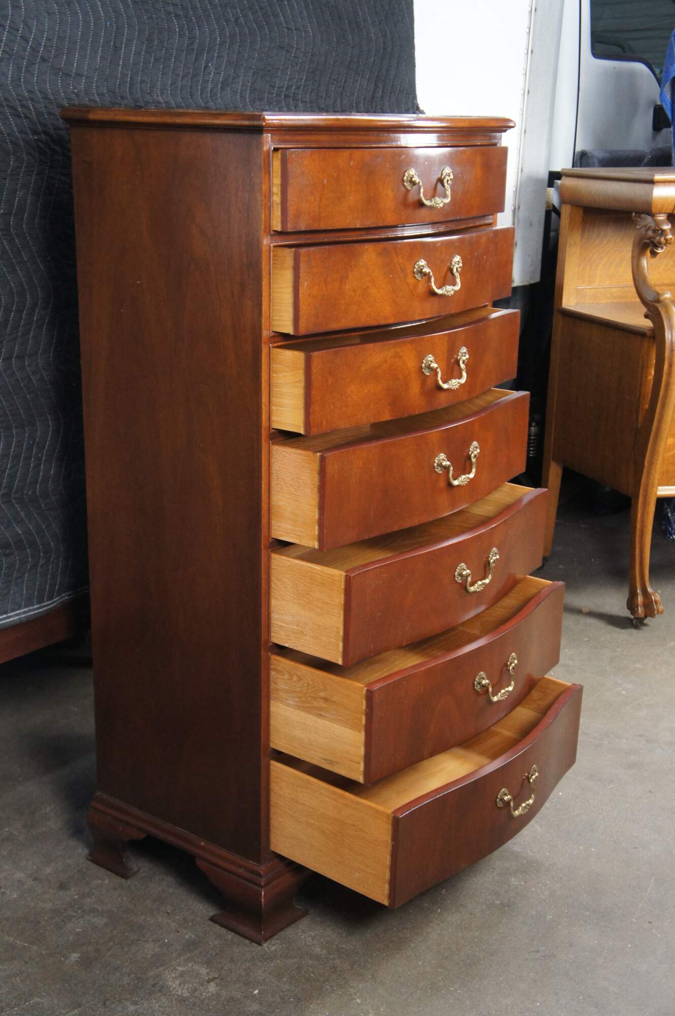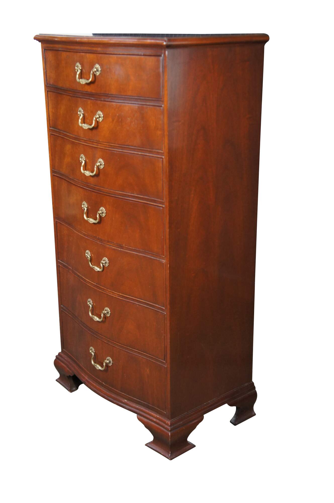 Baker Furniture English Georgian Style Lingerie Chest, circa 1980s. Features a serpentine form made from mahogany with seven oak dovetailed drawers. Each drawer is accented with by a timeless scalloped brass bail drawer pull. The chest is supported by bracket feet. Baker metal tag mounted along inside left of the top drawer. Backside marked 4038