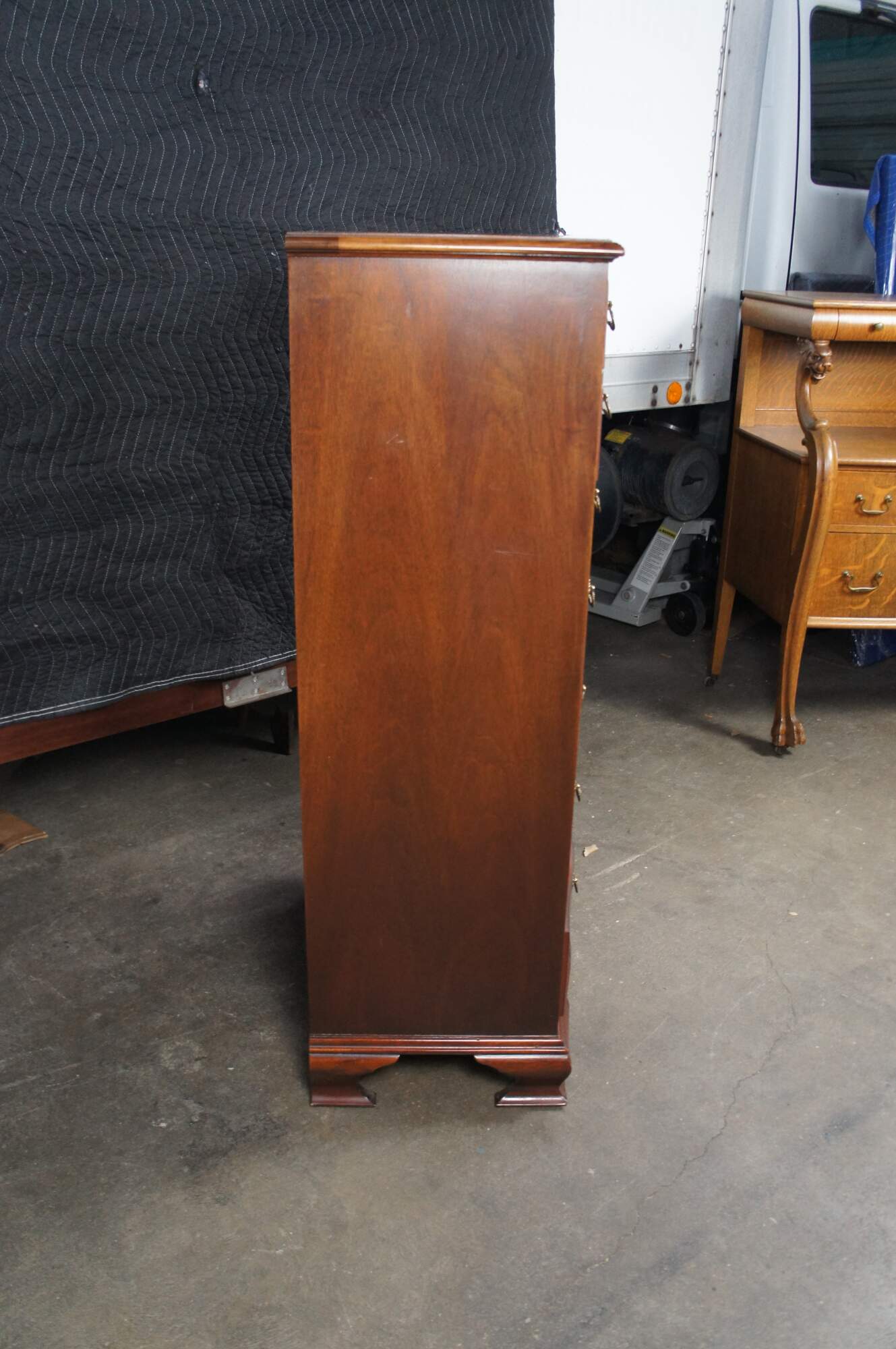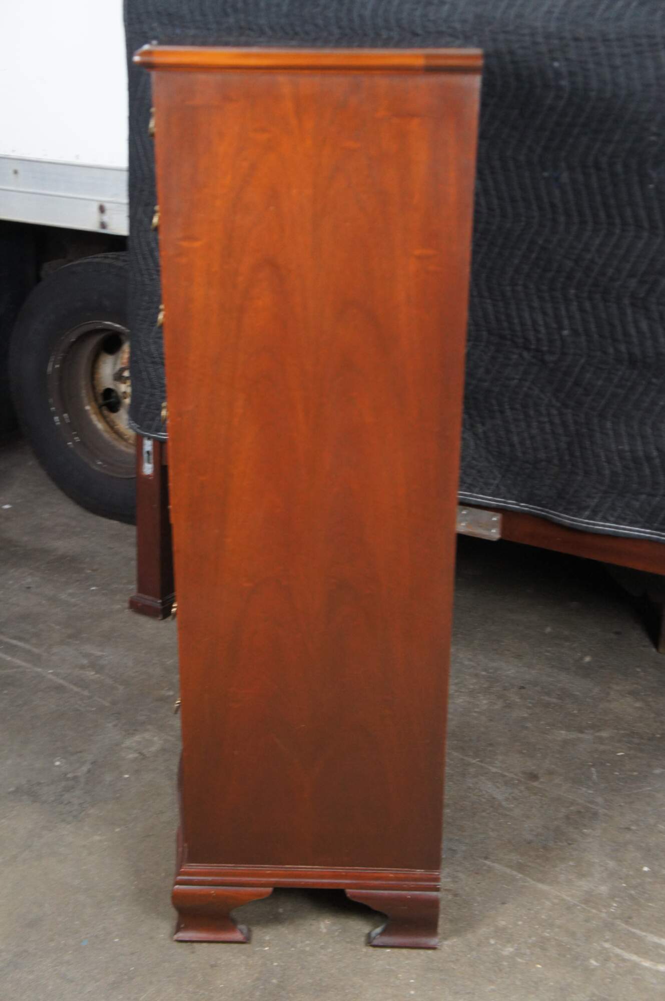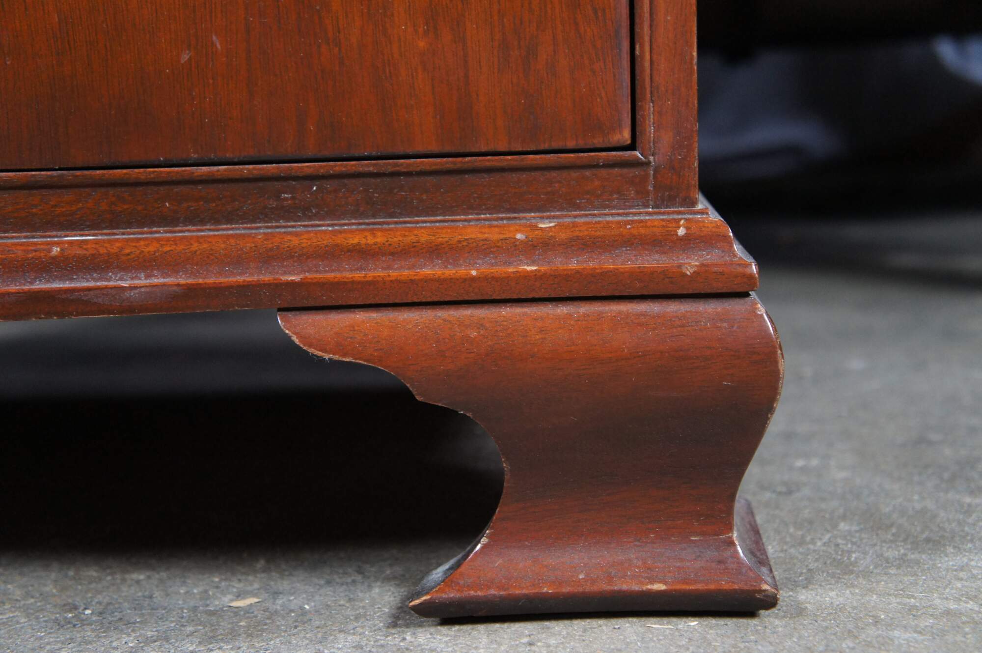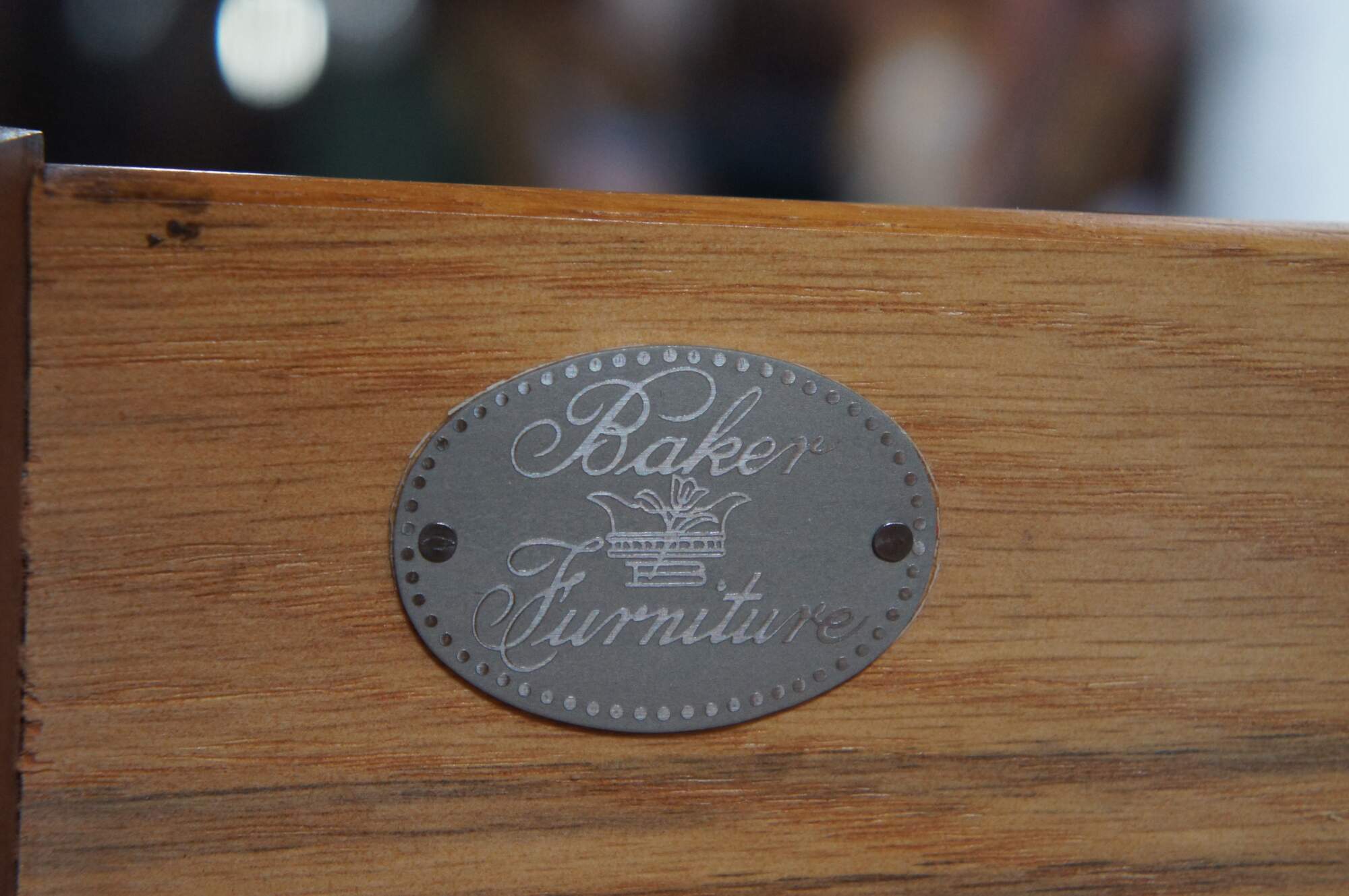 Baker Furniture English Georgian Style Lingerie Chest, circa 1980s. Features a serpentine form made from mahogany with seven oak dovetailed drawers. Each drawer is accented with by a timeless scalloped brass bail drawer pull. The chest is supported by bracket feet. Baker metal tag mounted along inside left of the top drawer. Backside marked 4038