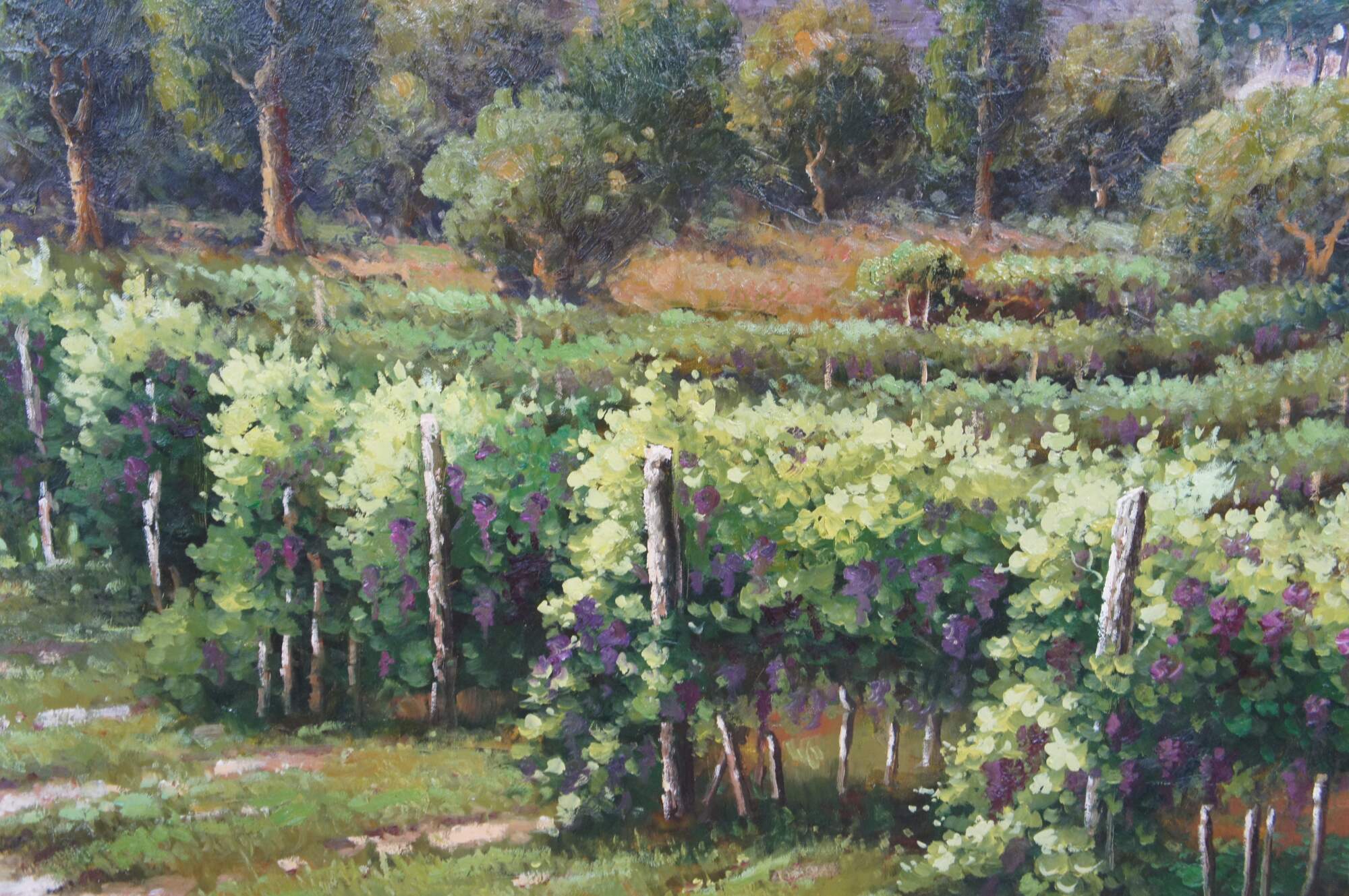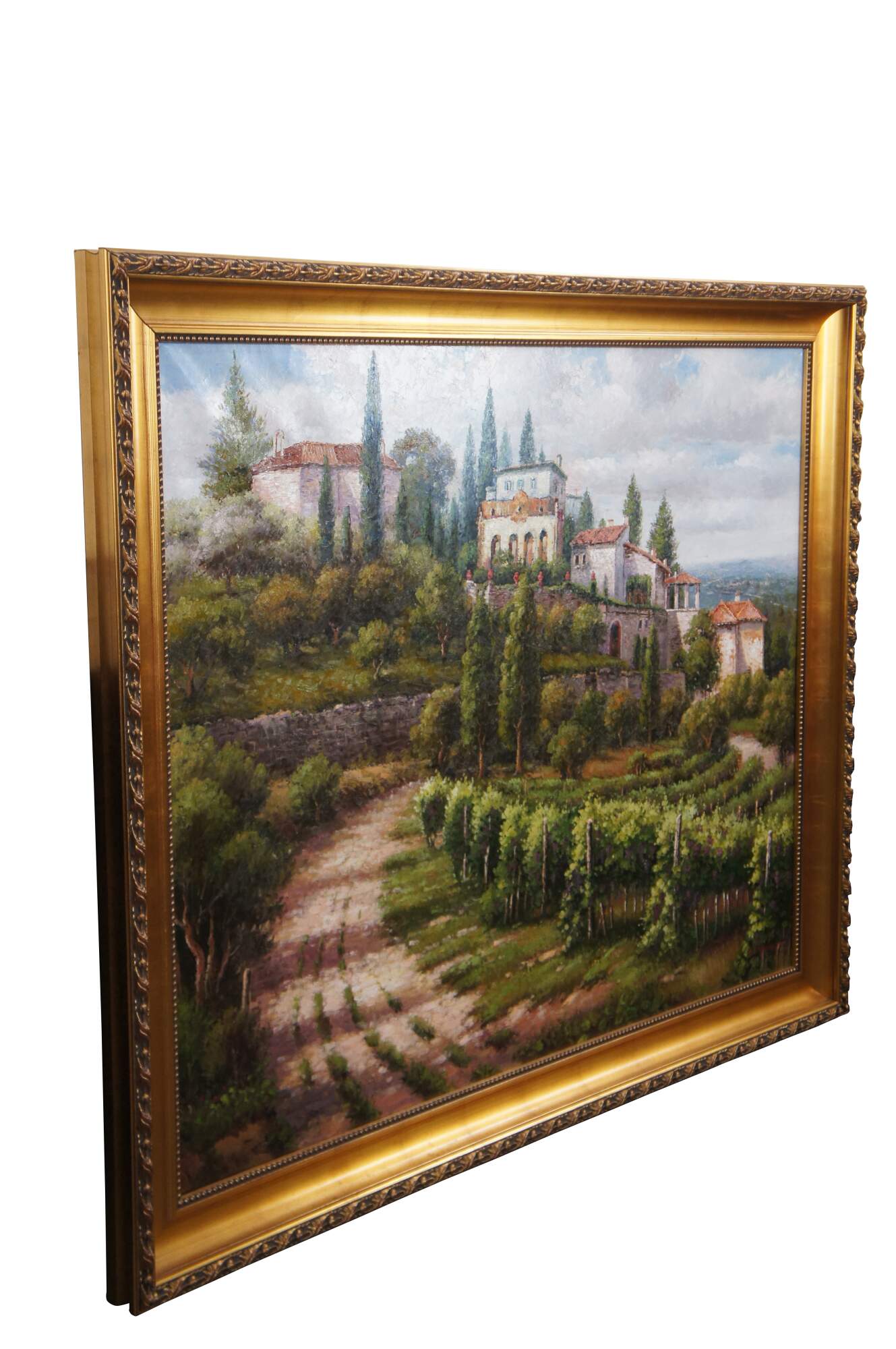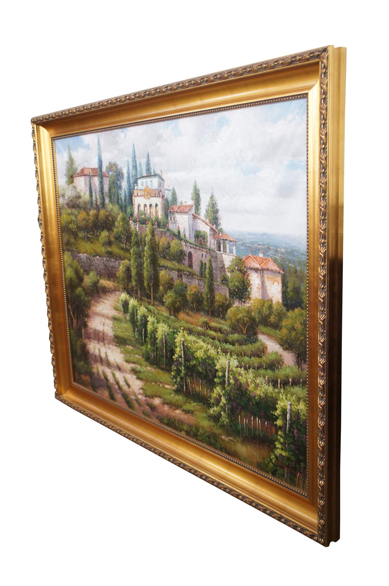 Late 20th century Tuscan Vineyard landscape painting by C. Giliano. A charming estate scene with mediterranean buildings on the hillside over looking over the rows grape vines. A town can be seen off the left in the background. The oil painting is on canvas and signed to the lower right. Framed in wood with a gold finish.