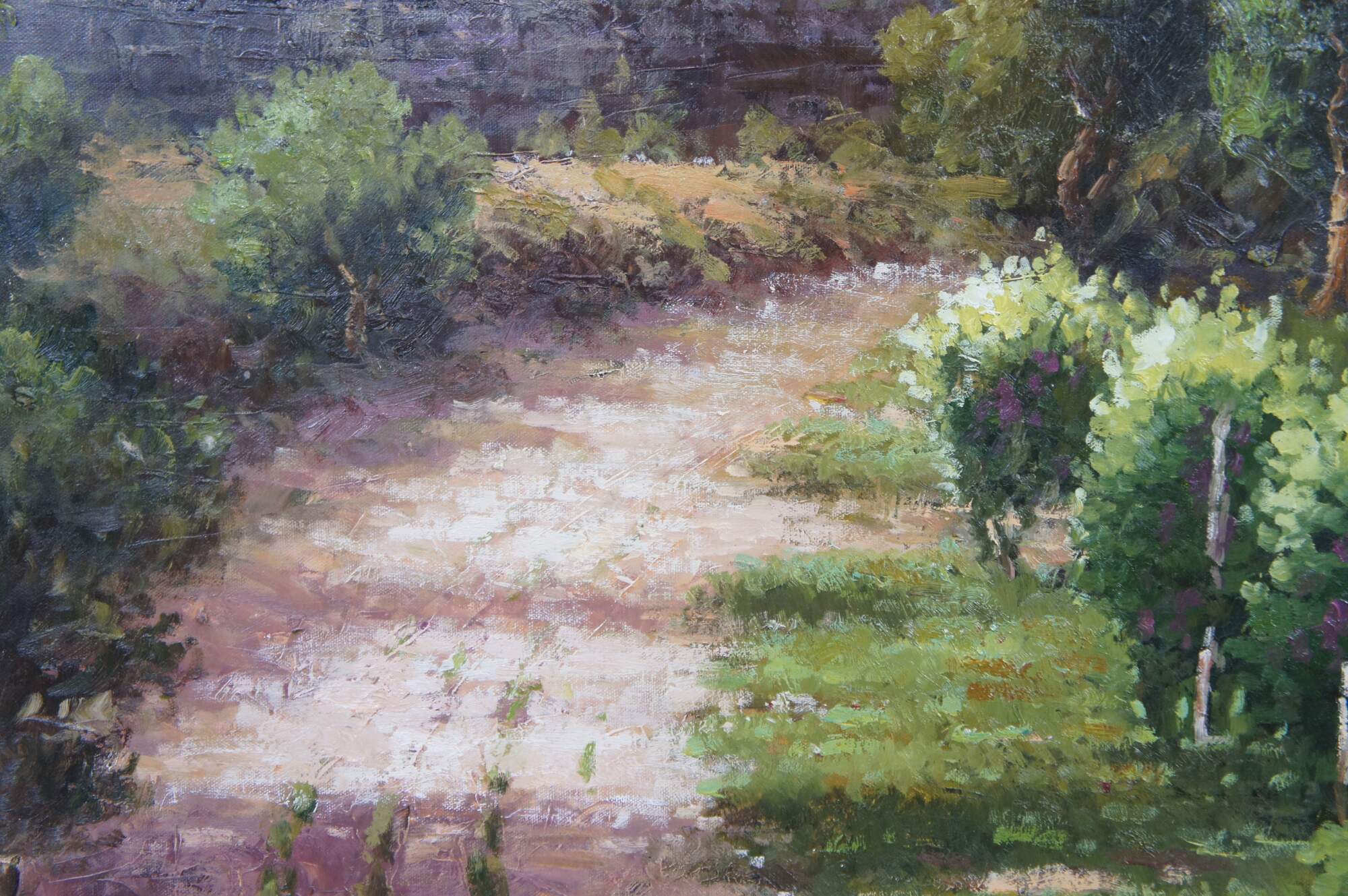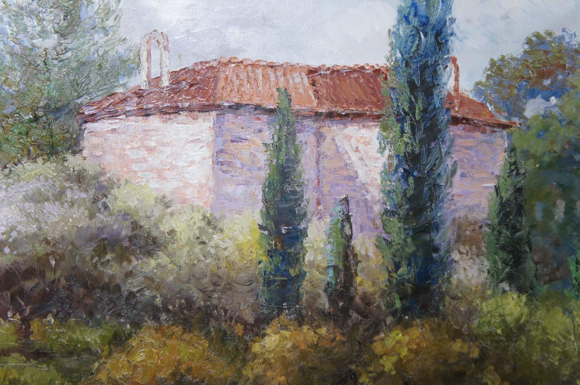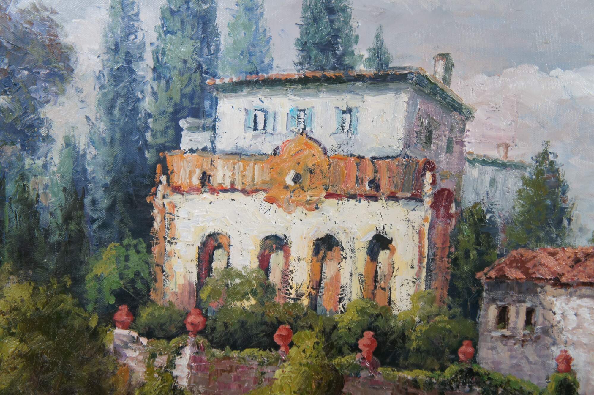 Late 20th century Tuscan Vineyard landscape painting by C. Giliano. A charming estate scene with mediterranean buildings on the hillside over looking over the rows grape vines. A town can be seen off the left in the background. The oil painting is on canvas and signed to the lower right. Framed in wood with a gold finish.