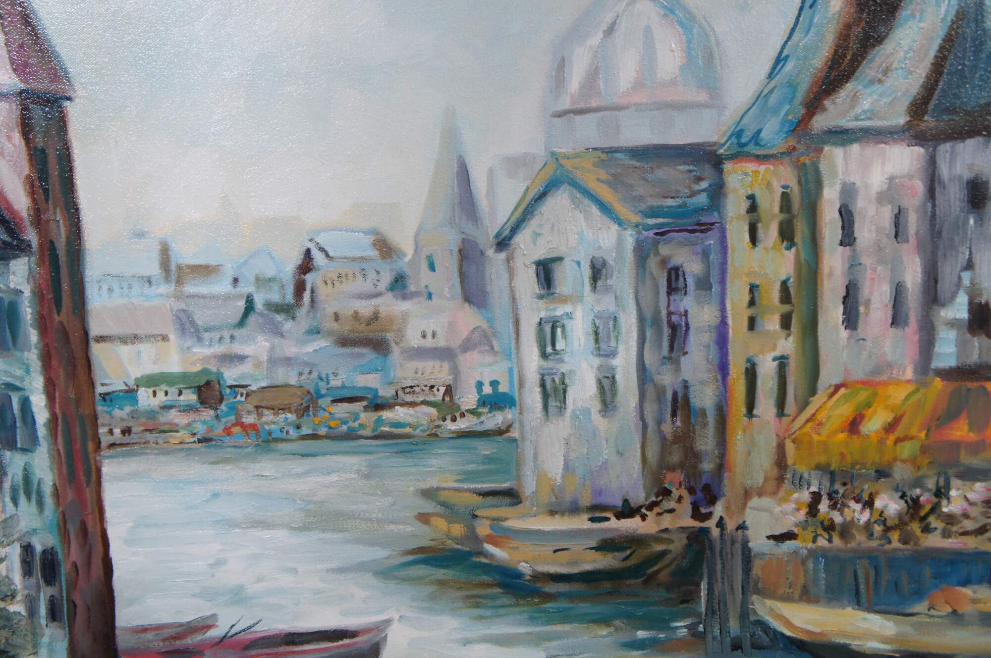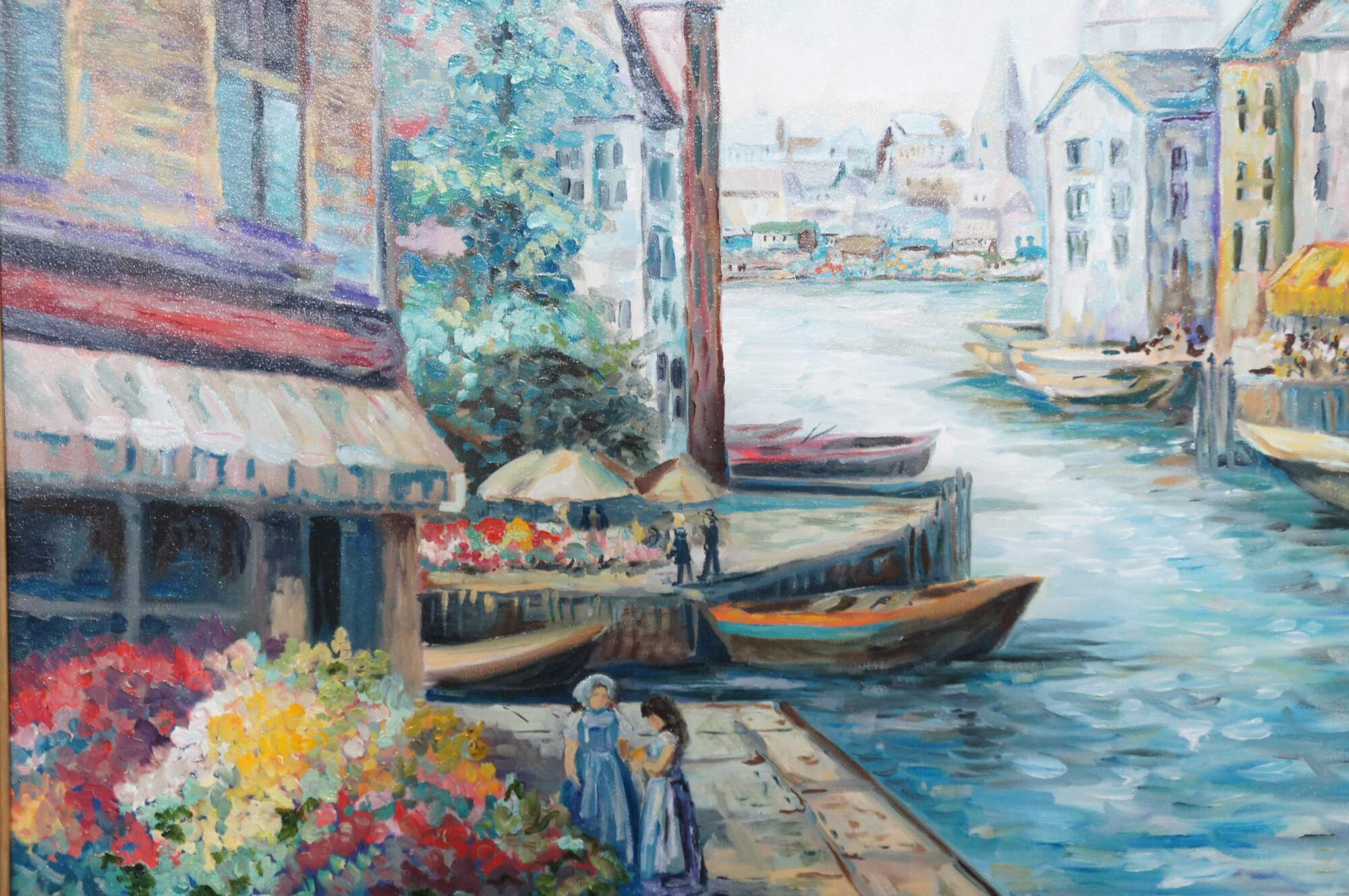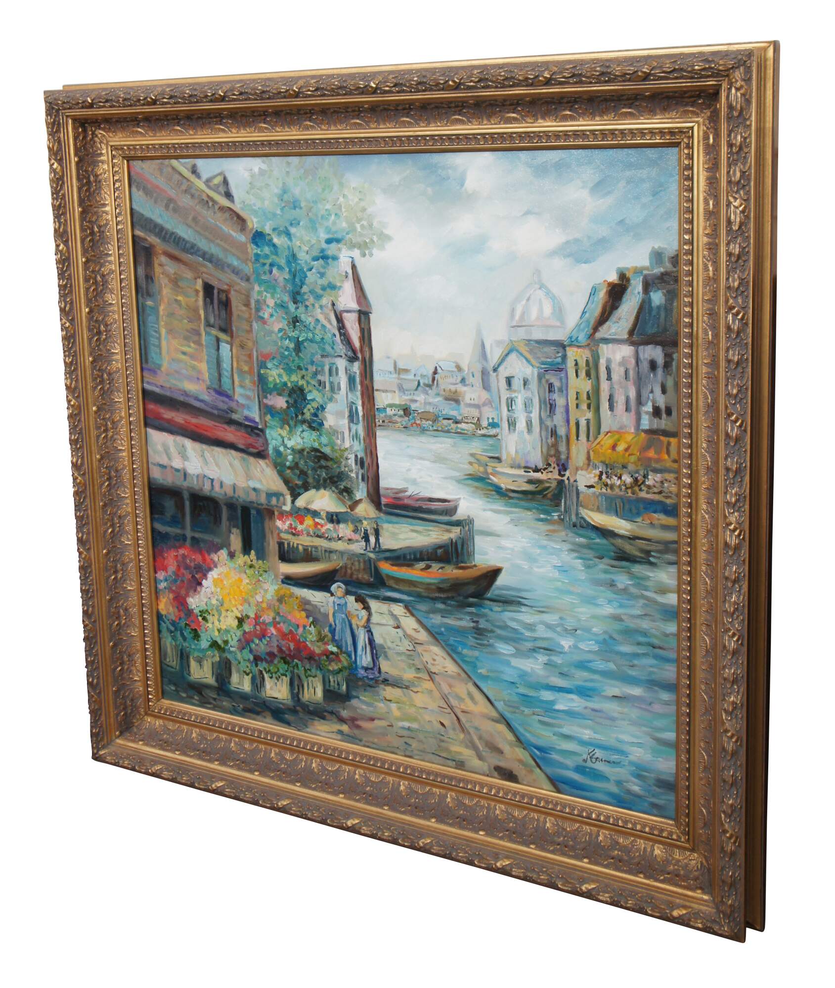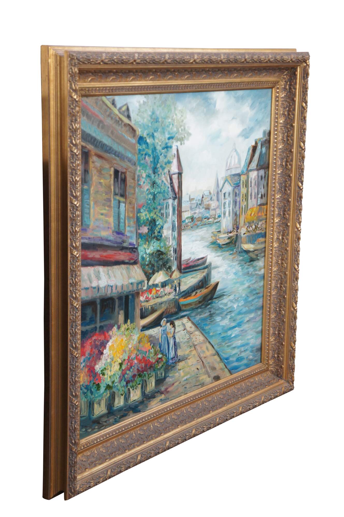 A large signed oil painting depicting a canal scene or view of Venice. Features buildings, boats, and figures on the waterway. The painting is vibrantly colored with beautiful detail. The canvas is signed along the lower edge and framed in a Neoclassical manner. A certificate of authenticity is mounted to the backside of the canvas.