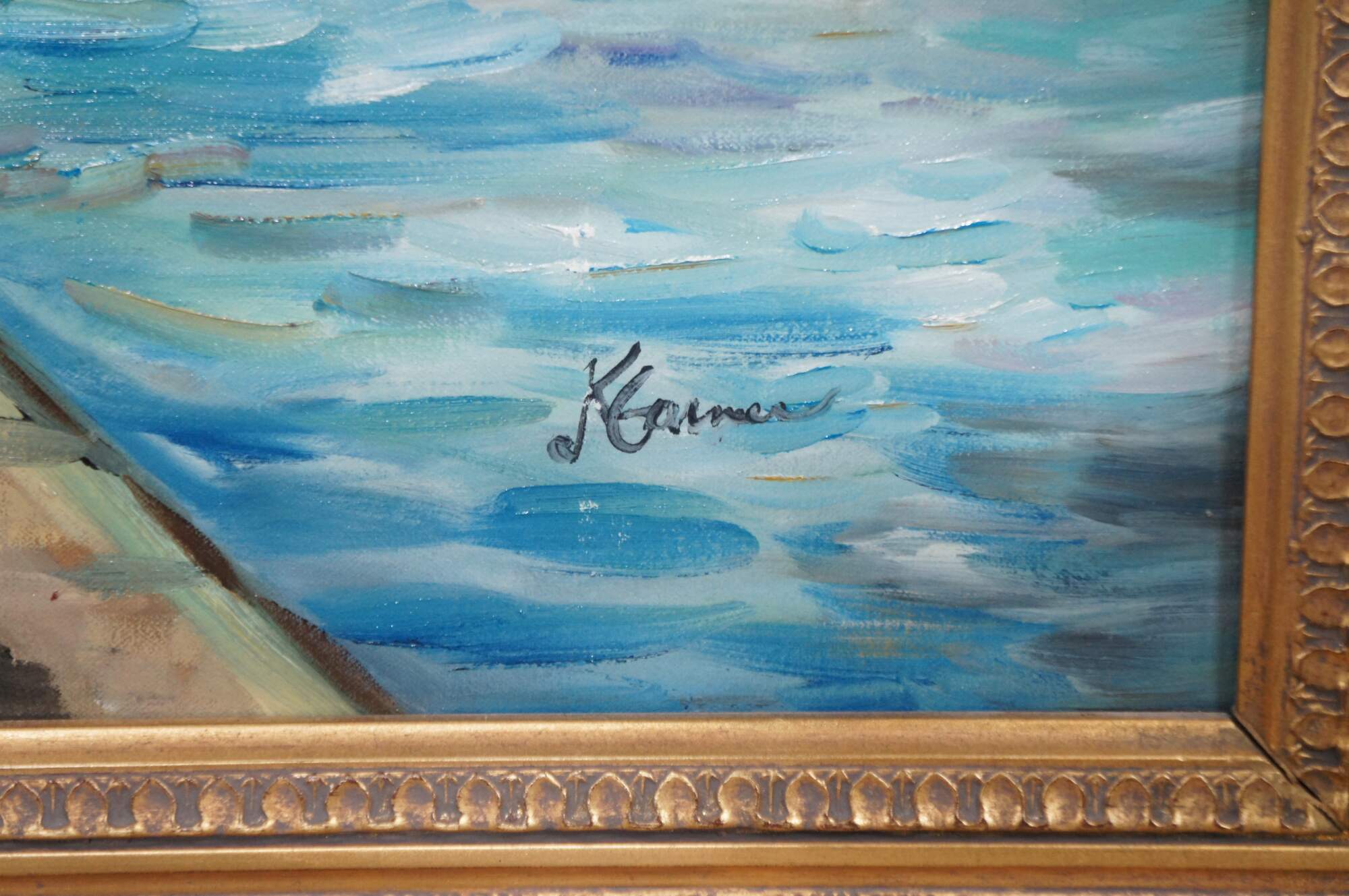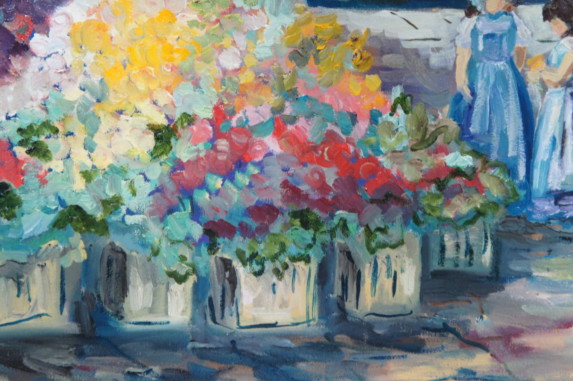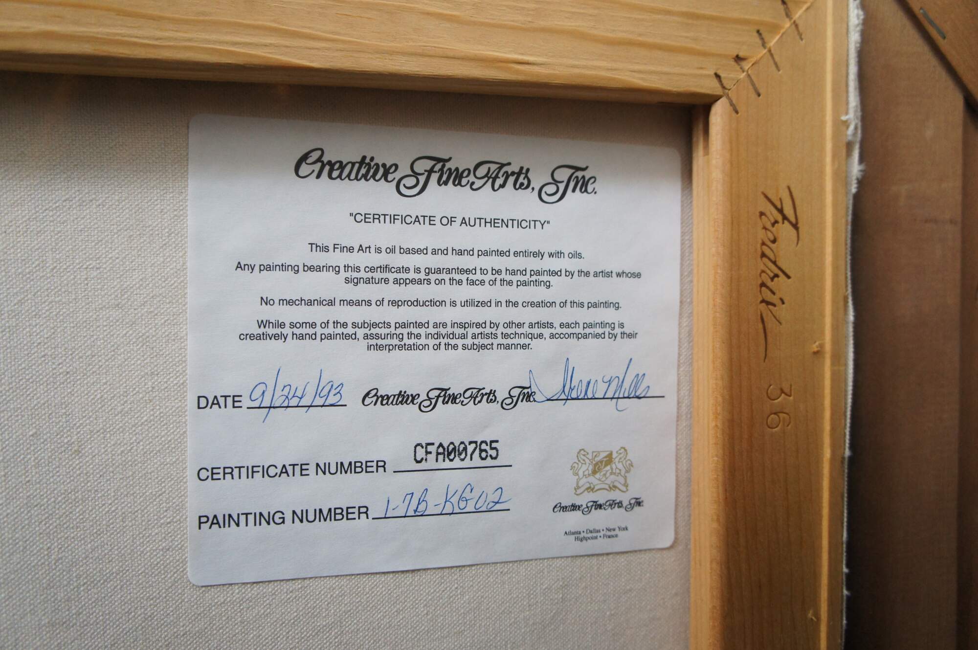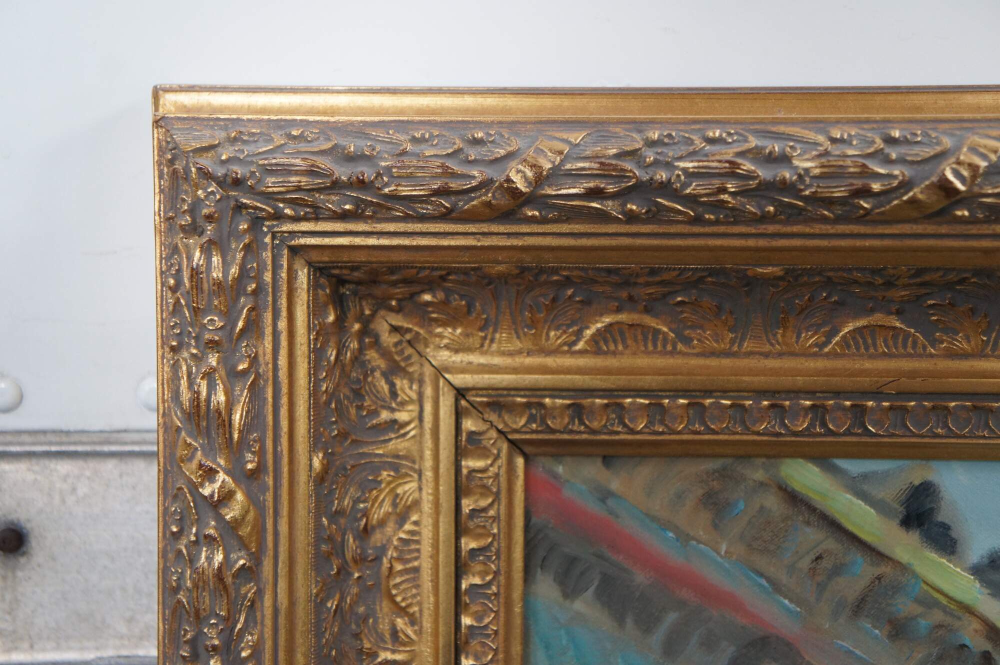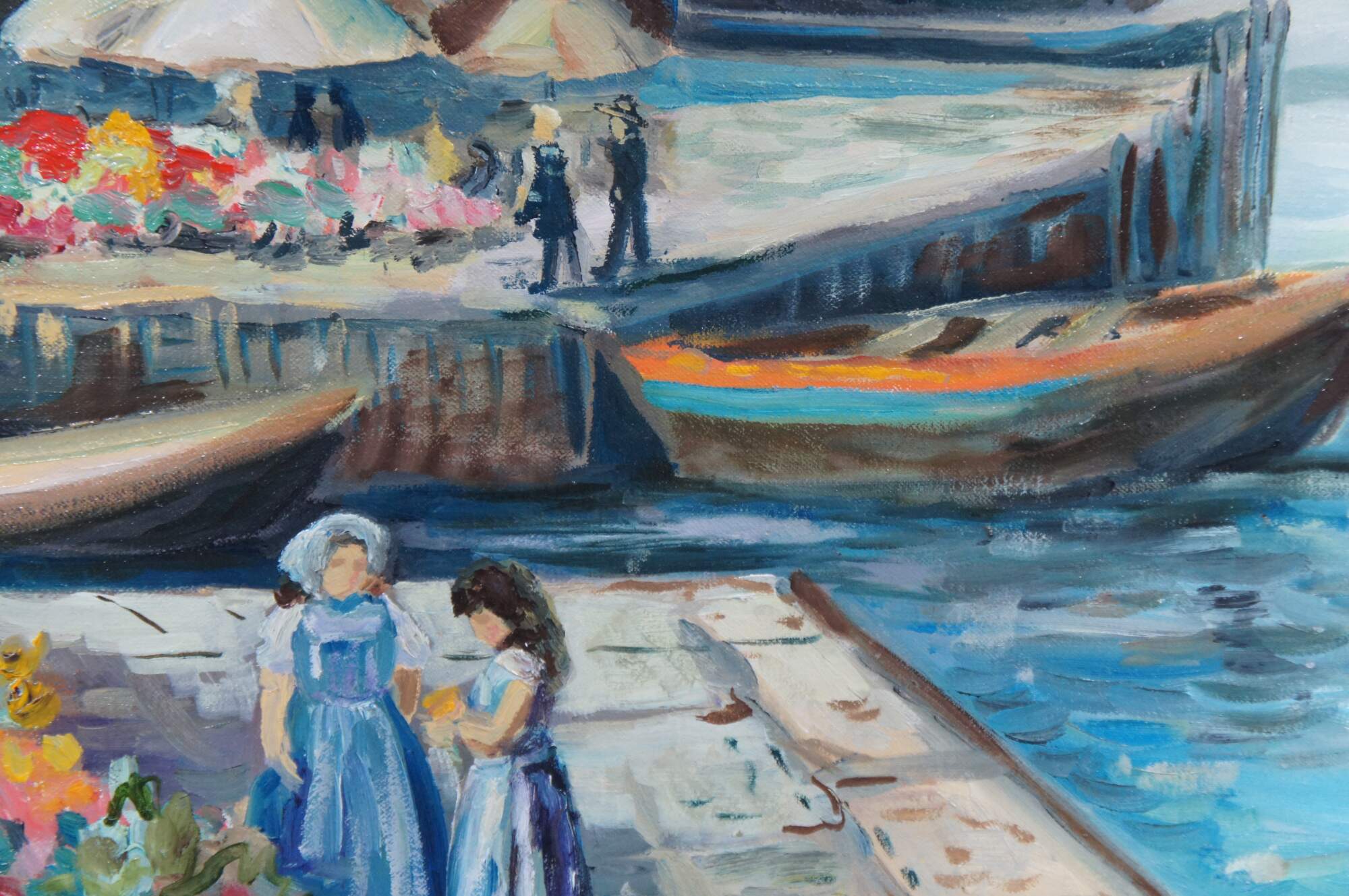 A large signed oil painting depicting a canal scene or view of Venice. Features buildings, boats, and figures on the waterway. The painting is vibrantly colored with beautiful detail. The canvas is signed along the lower edge and framed in a Neoclassical manner. A certificate of authenticity is mounted to the backside of the canvas.