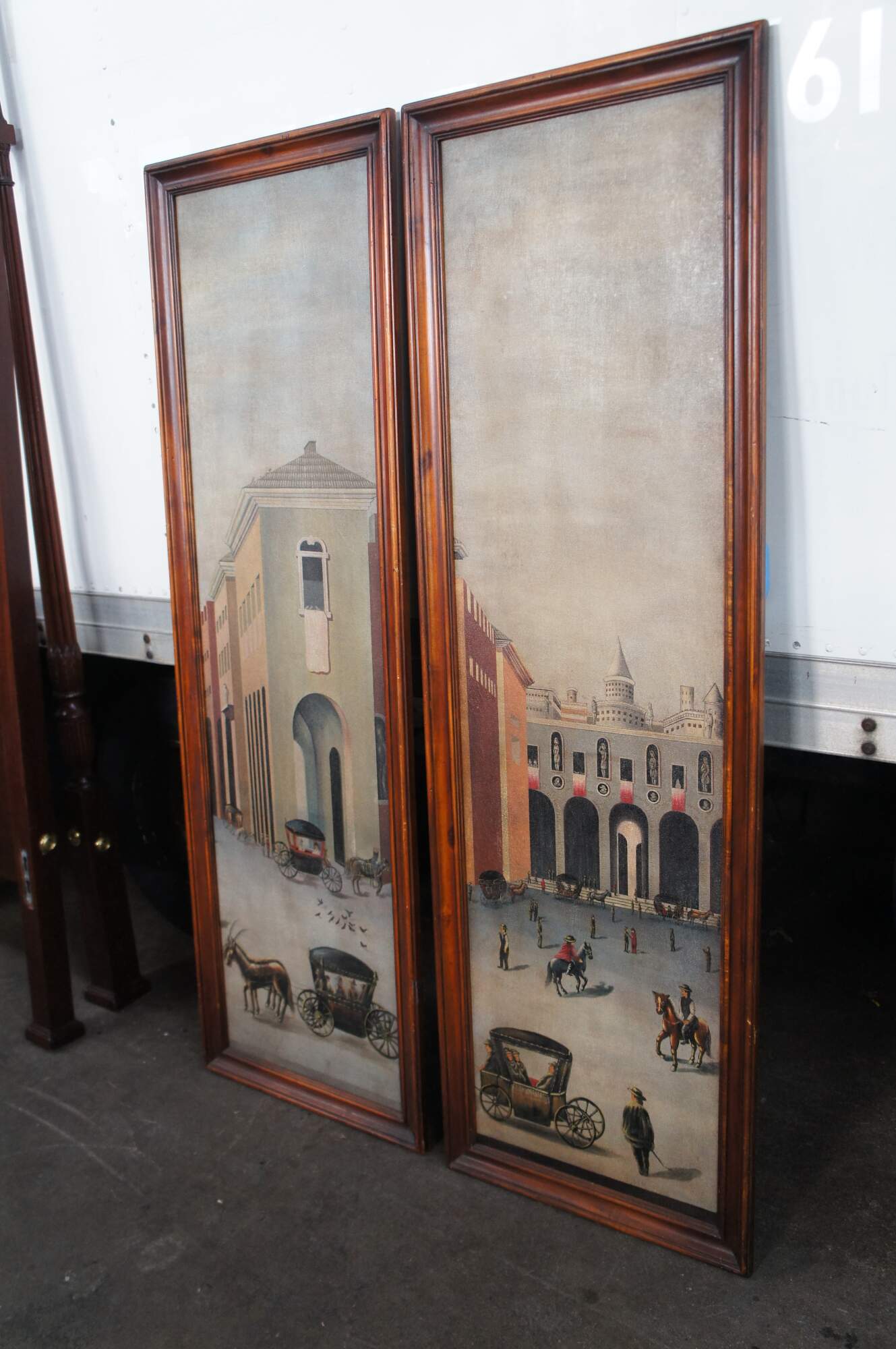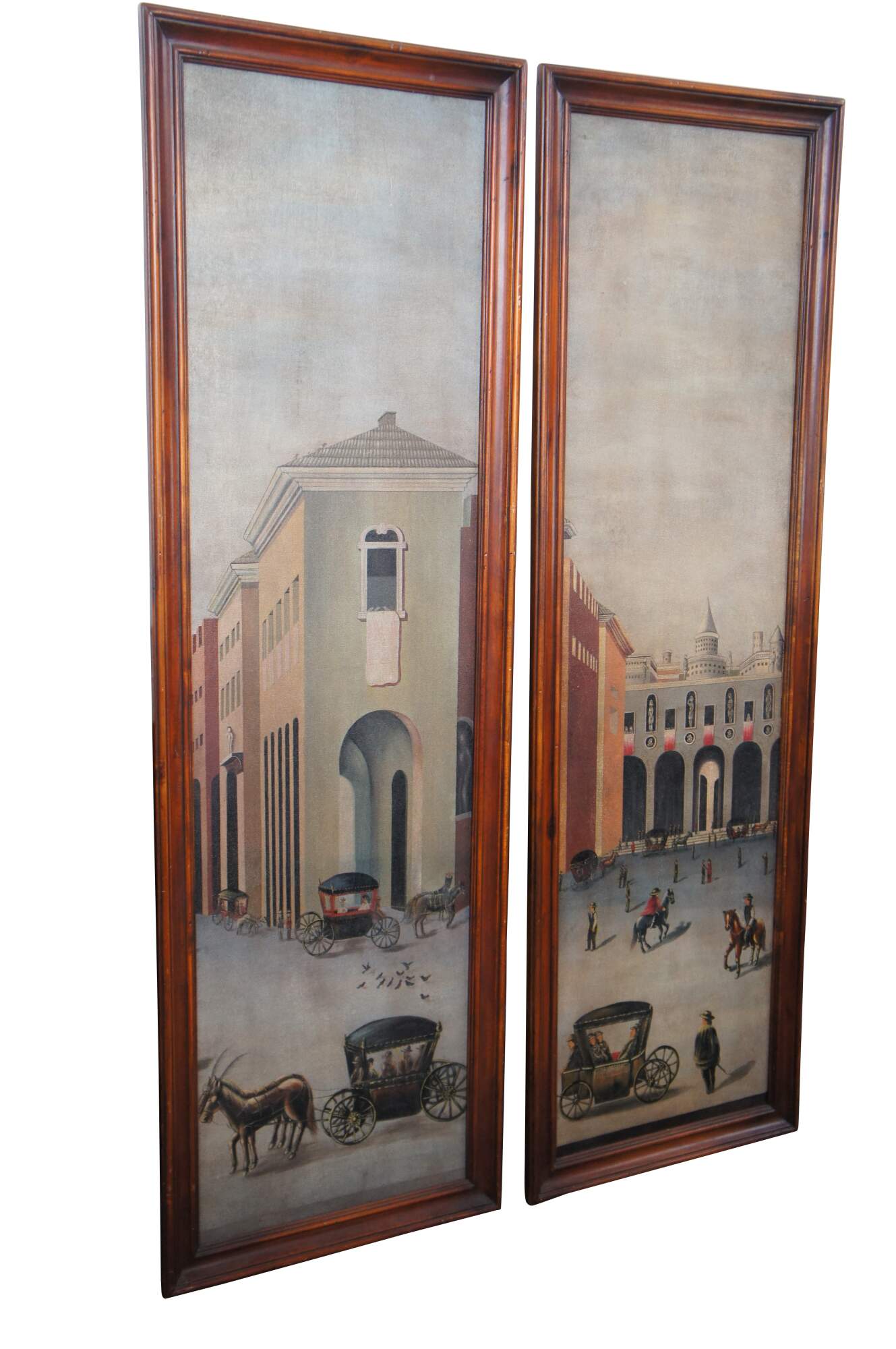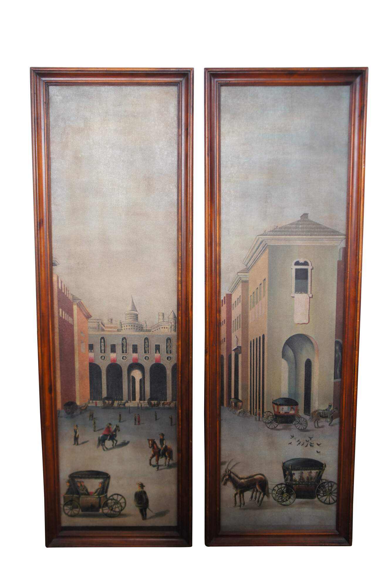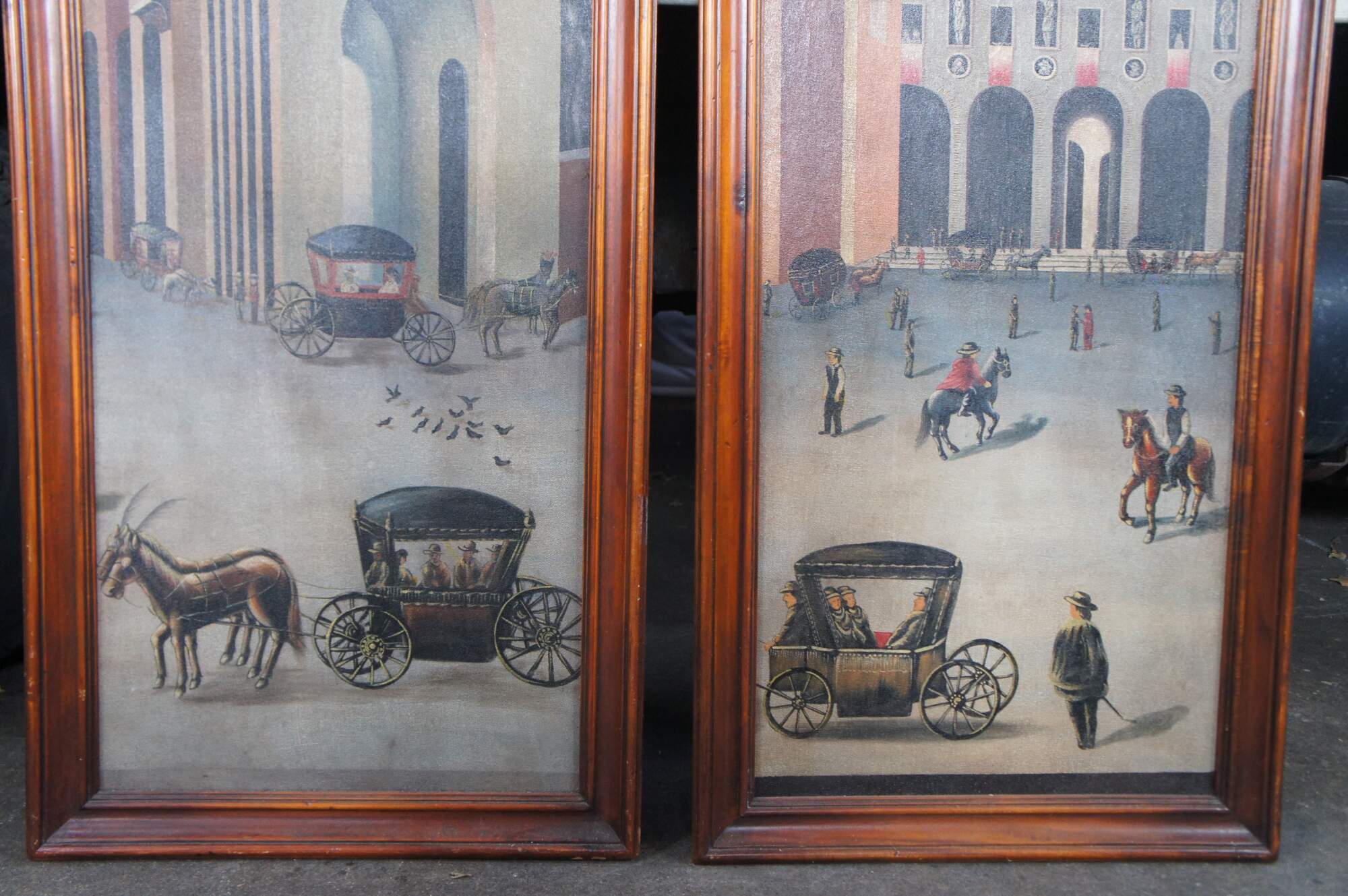 Early 21st Century Pair of Theodore Alexander Oil Paintings on Panel. Features a European plaza with horse and carriages and figures amongst the cityscape. Framed in mahogany.