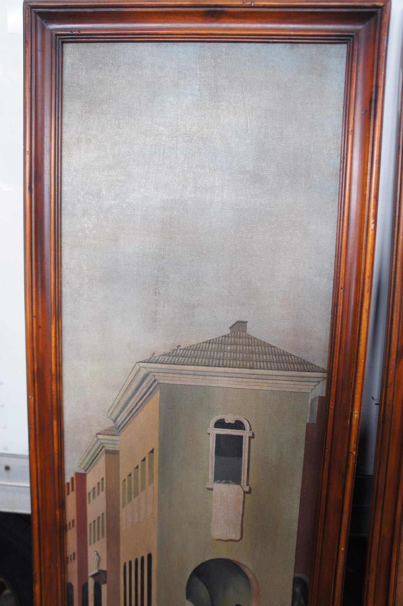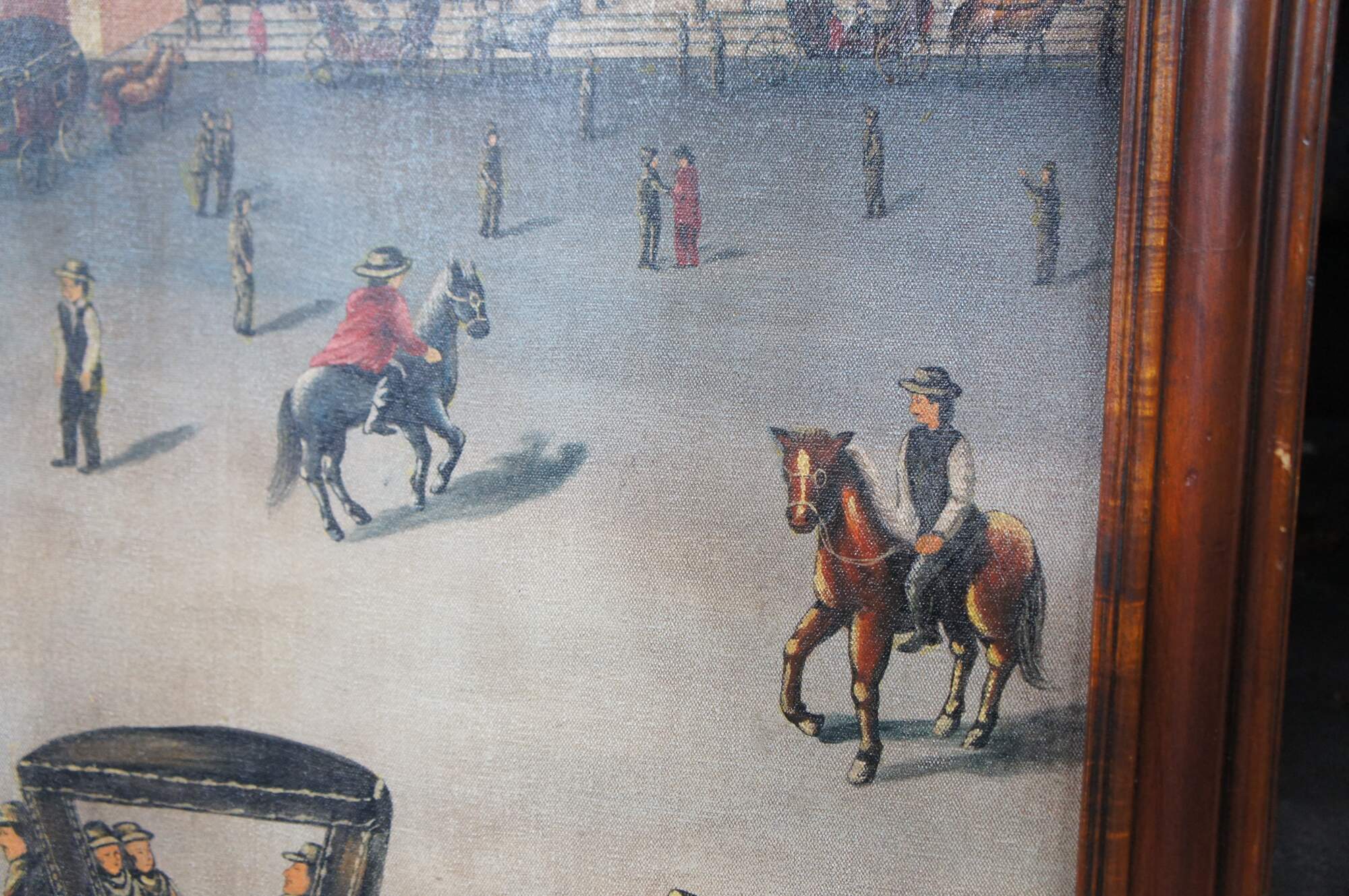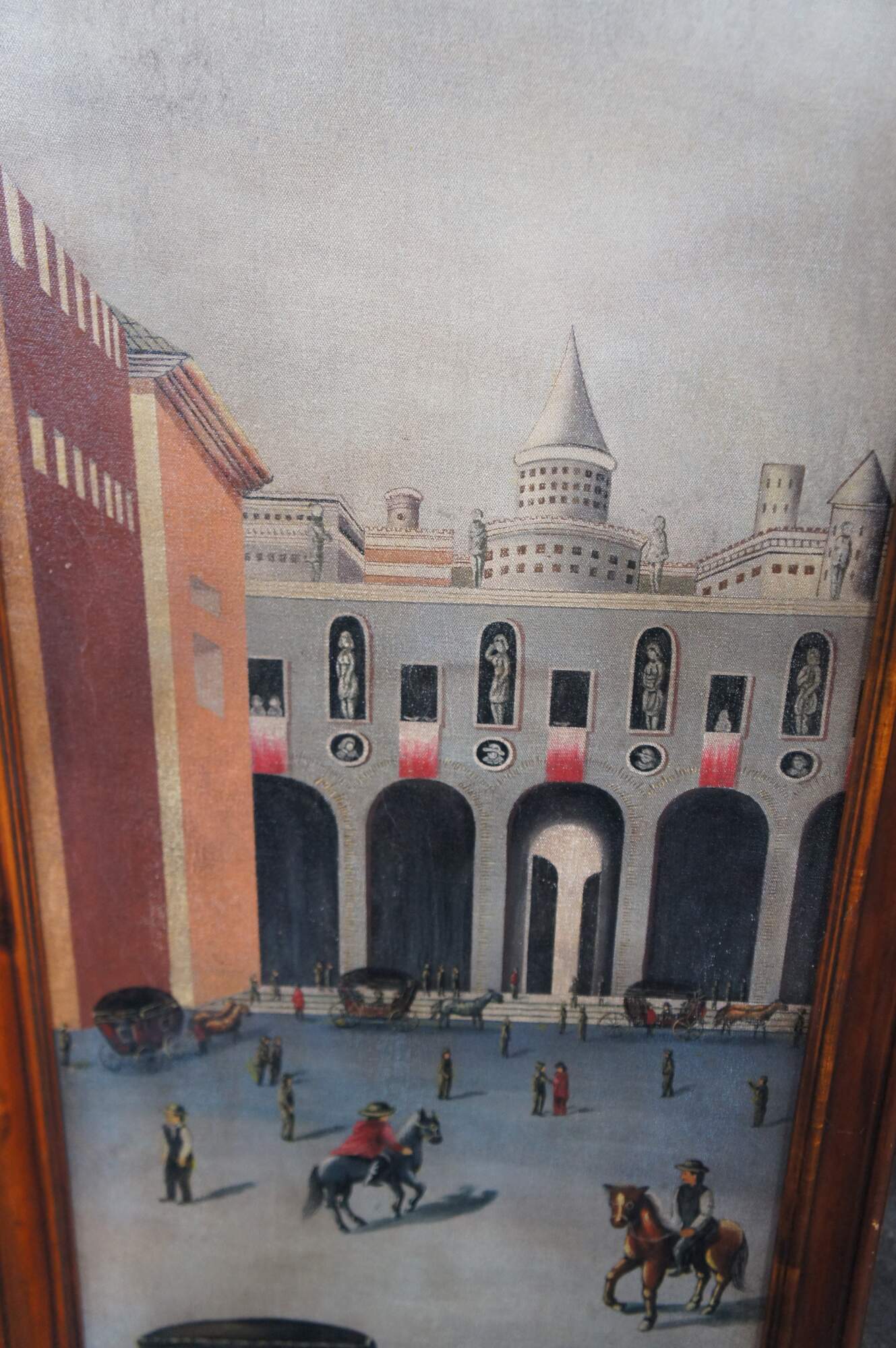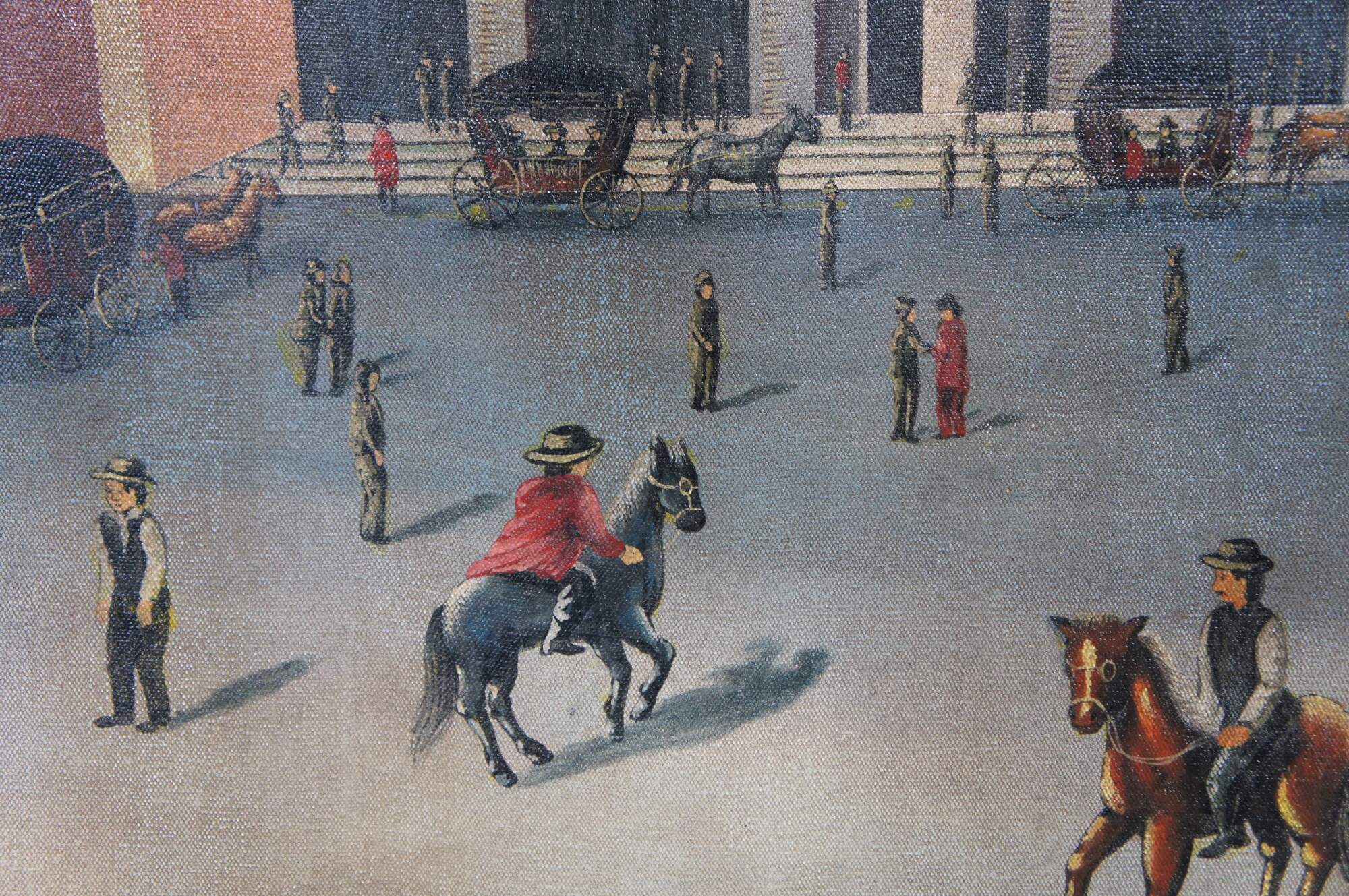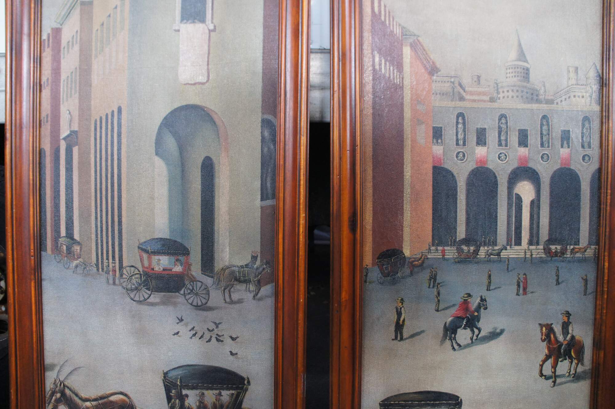 Early 21st Century Pair of Theodore Alexander Oil Paintings on Panel. Features a European plaza with horse and carriages and figures amongst the cityscape. Framed in mahogany.