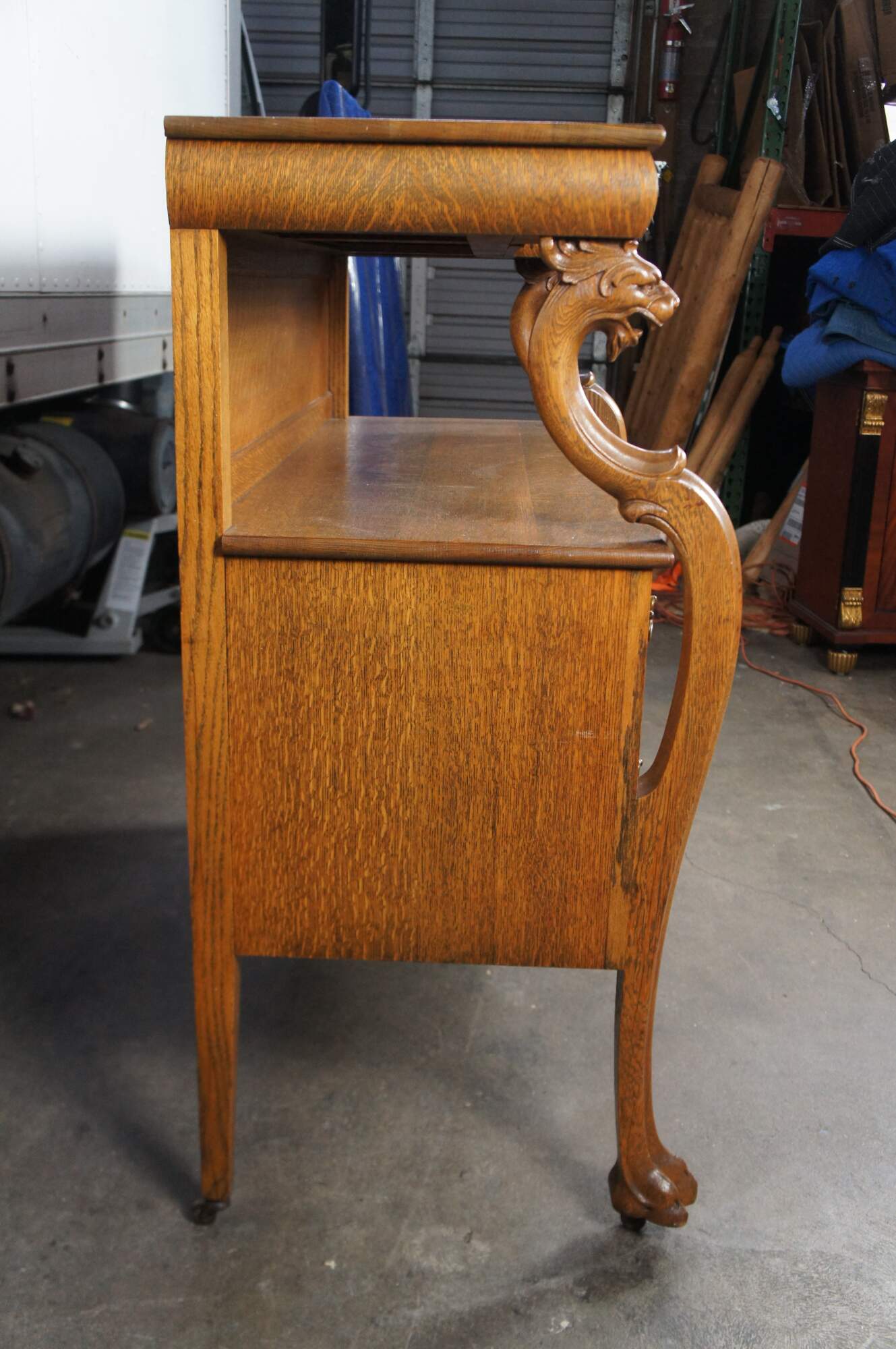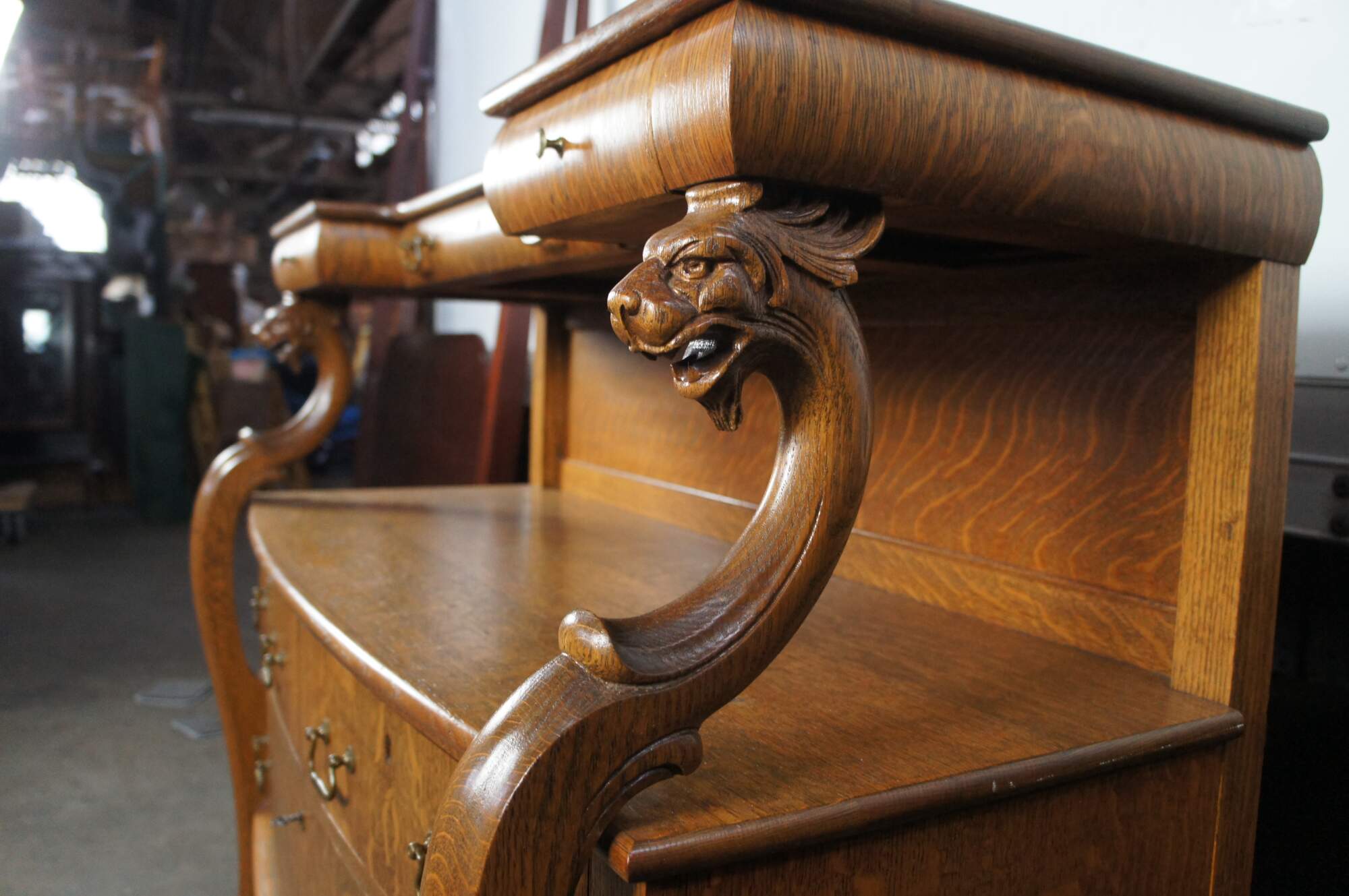 Late Victorian American Empire Style Sideboard, C. 1900. Features a rectangular form made from quartersawn oak with a unique in-cut top featuring three dovetailed drawers within the frieze, supported by contoured figural carved Griffin / Lion heads. The center surface is open with a bowfront over three larger drawers perfect for storage of china or glassware. The contoured "s" curved Griffin supports continue down over the front of the case leading to large paw feet over casters. The unique design and shape of this piece allow for versatility in use. It could be used as a drybar, credenza, buffet, server, console table, or sideboard.