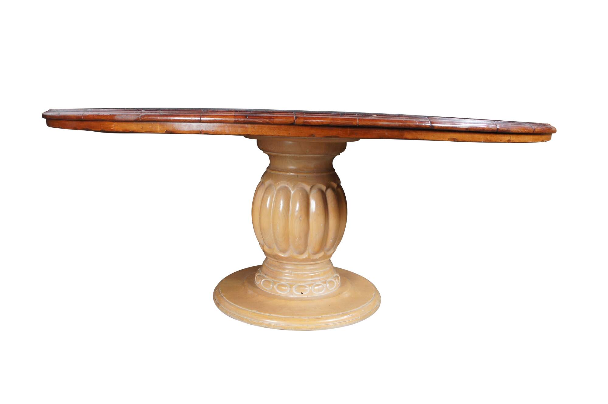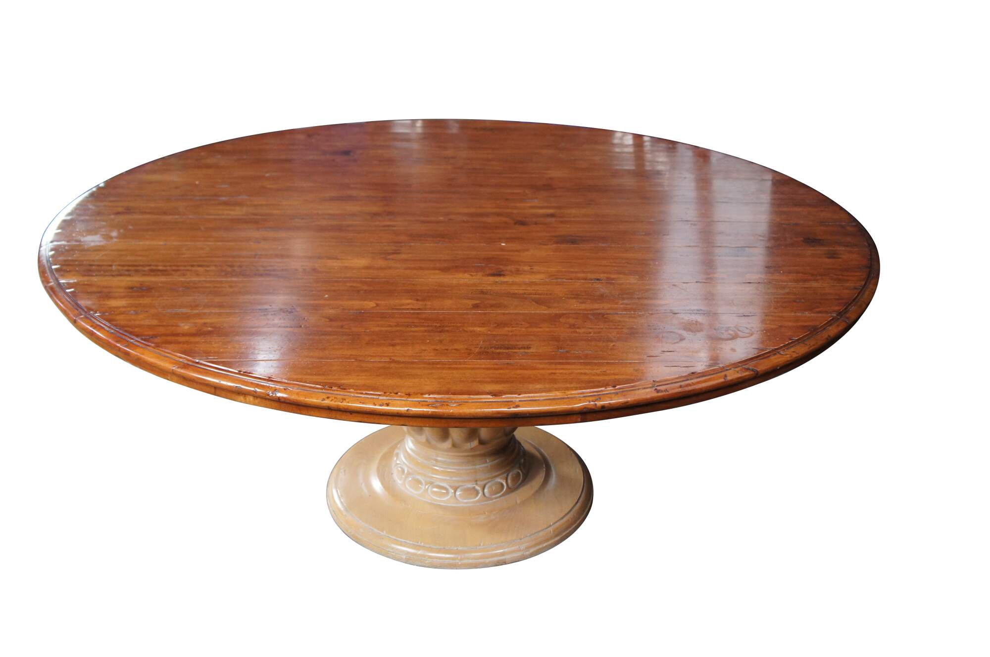 Early 21st century farmhouse dining table. Features a naturally distressed round pine plank top over a light finished ribbed pedestal base. Circa 2001