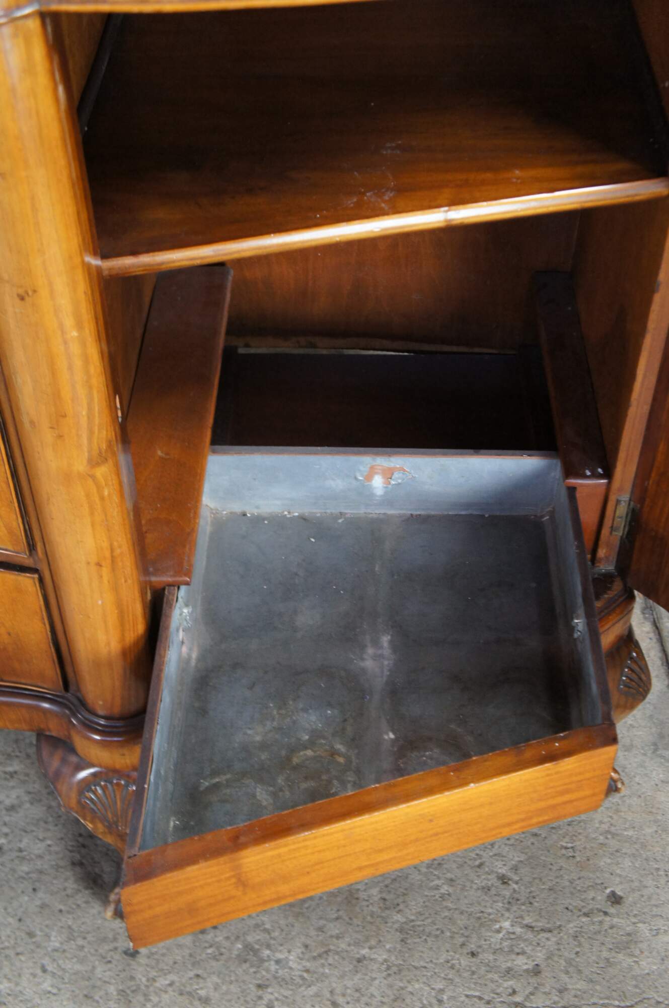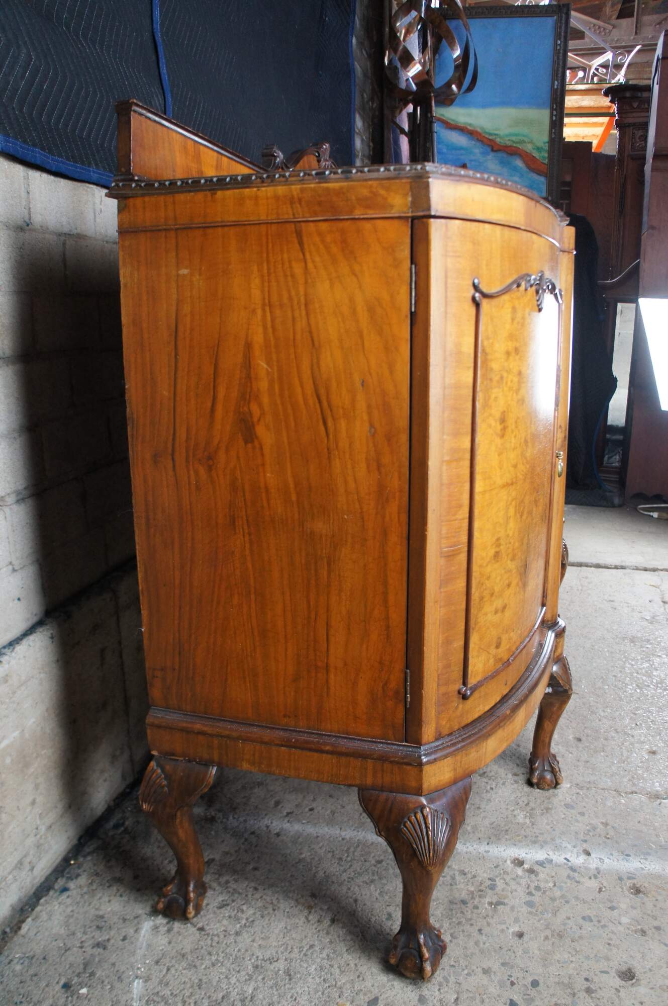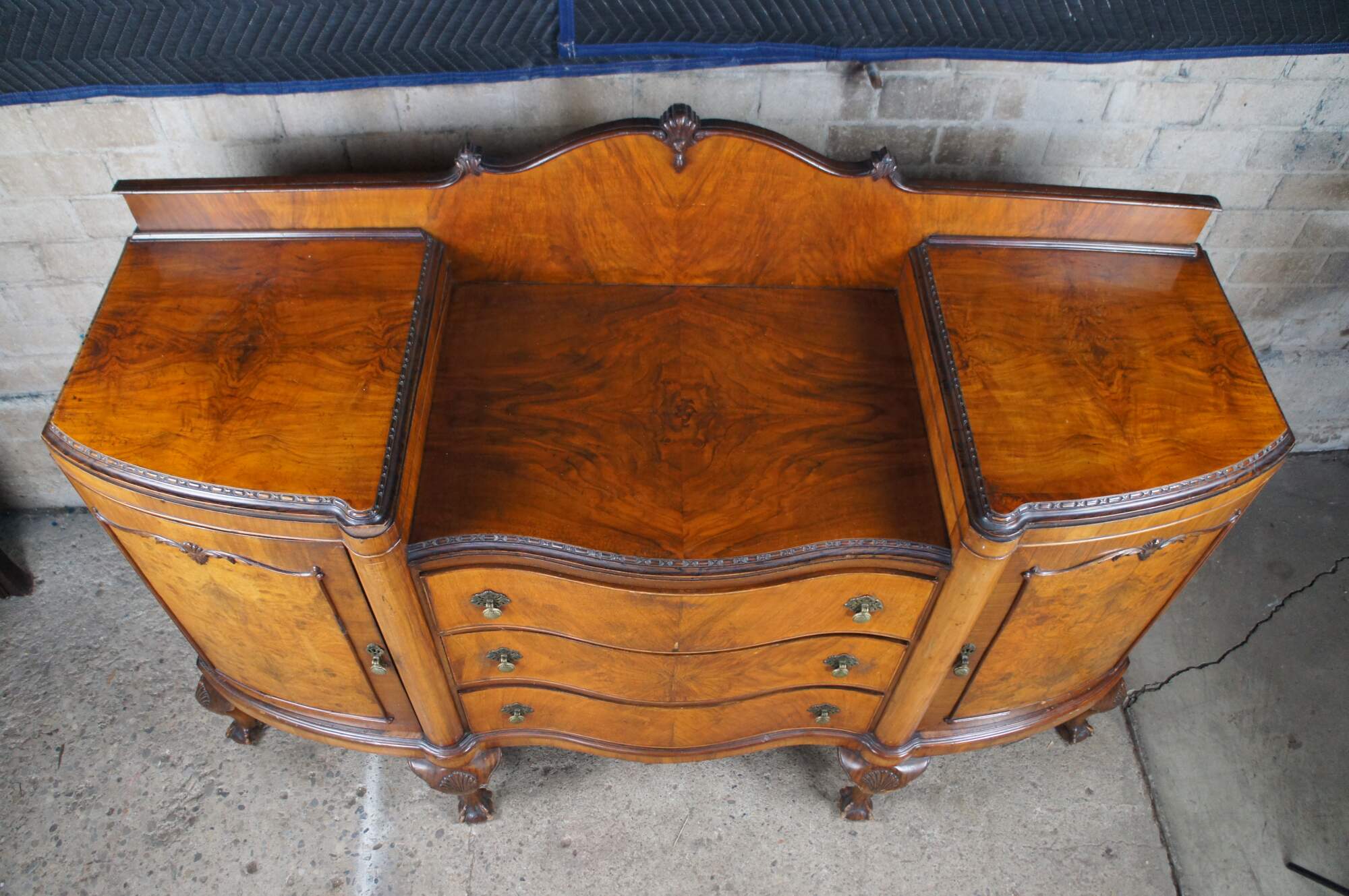 Sunning Antique English Chippendale style sideboard, circa 1870s. Features a serpentine form made from walnut with matchbook burl and crossbanding. The buffet showcases a camelback shaped backsplash infront of a dropwell with three hand dovetailed drawers, set between two outer cabinets for additional storage. Each outer cabinet has one shelf. The lower right side has a pullout drawer that was originally used as a Cellarette and shows shadows from the wine or spirits that were once housed there. Drawers and doors are fitted with ornate filigree brass hardware and round drop / knocker pulls. The case is supported by six cabriole legs with scalloped knees over ball and claw feet. A true work of craftmanship that will make a statement in any space.