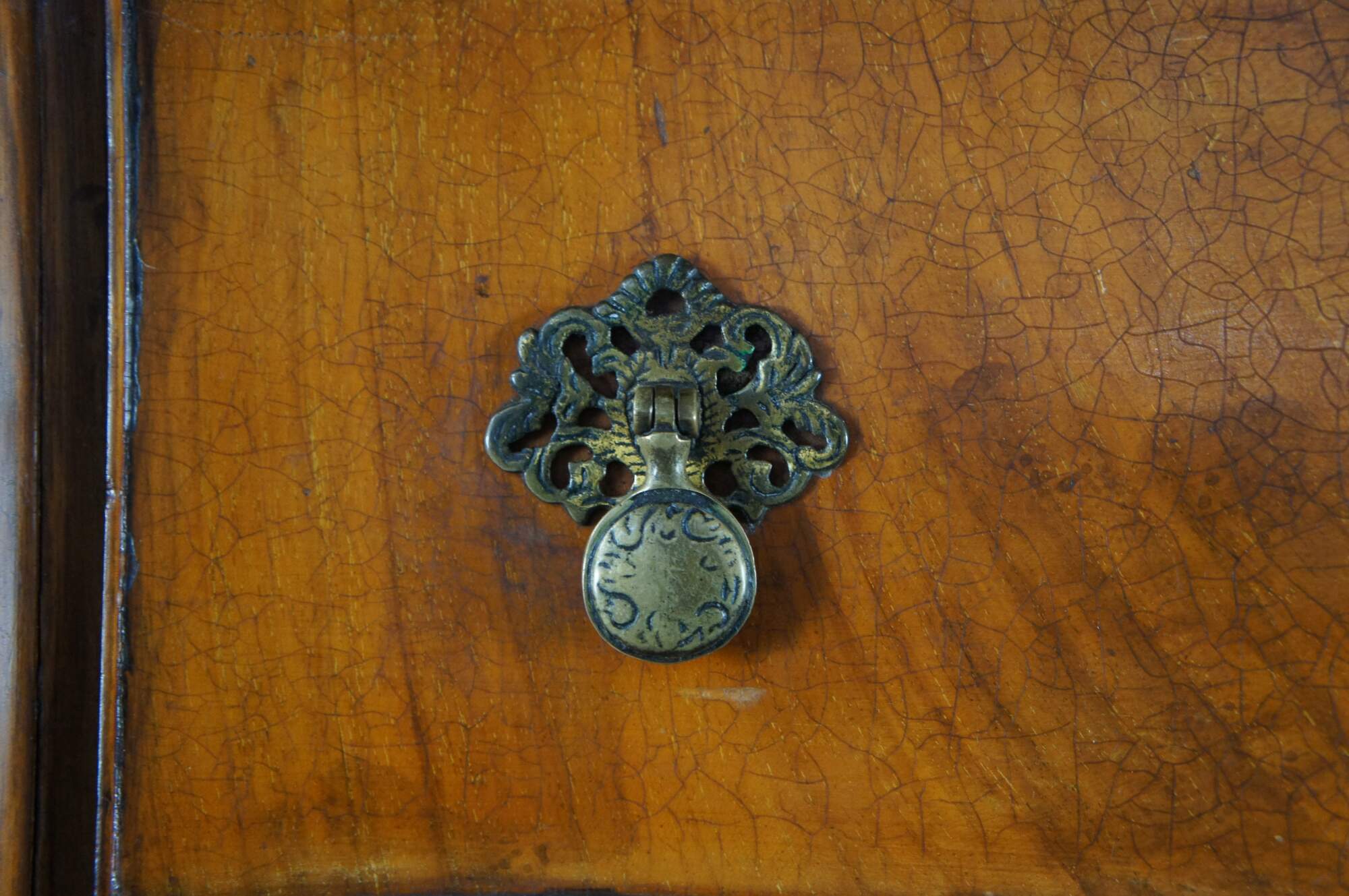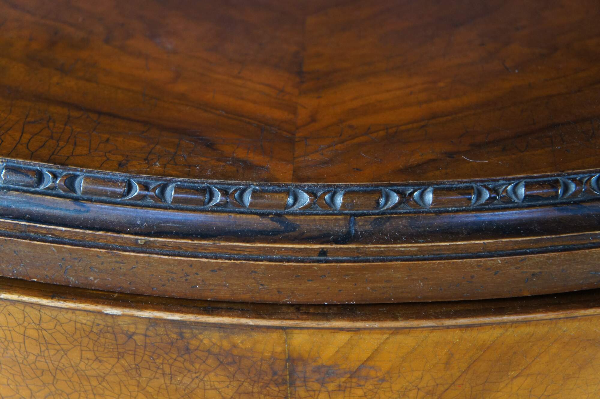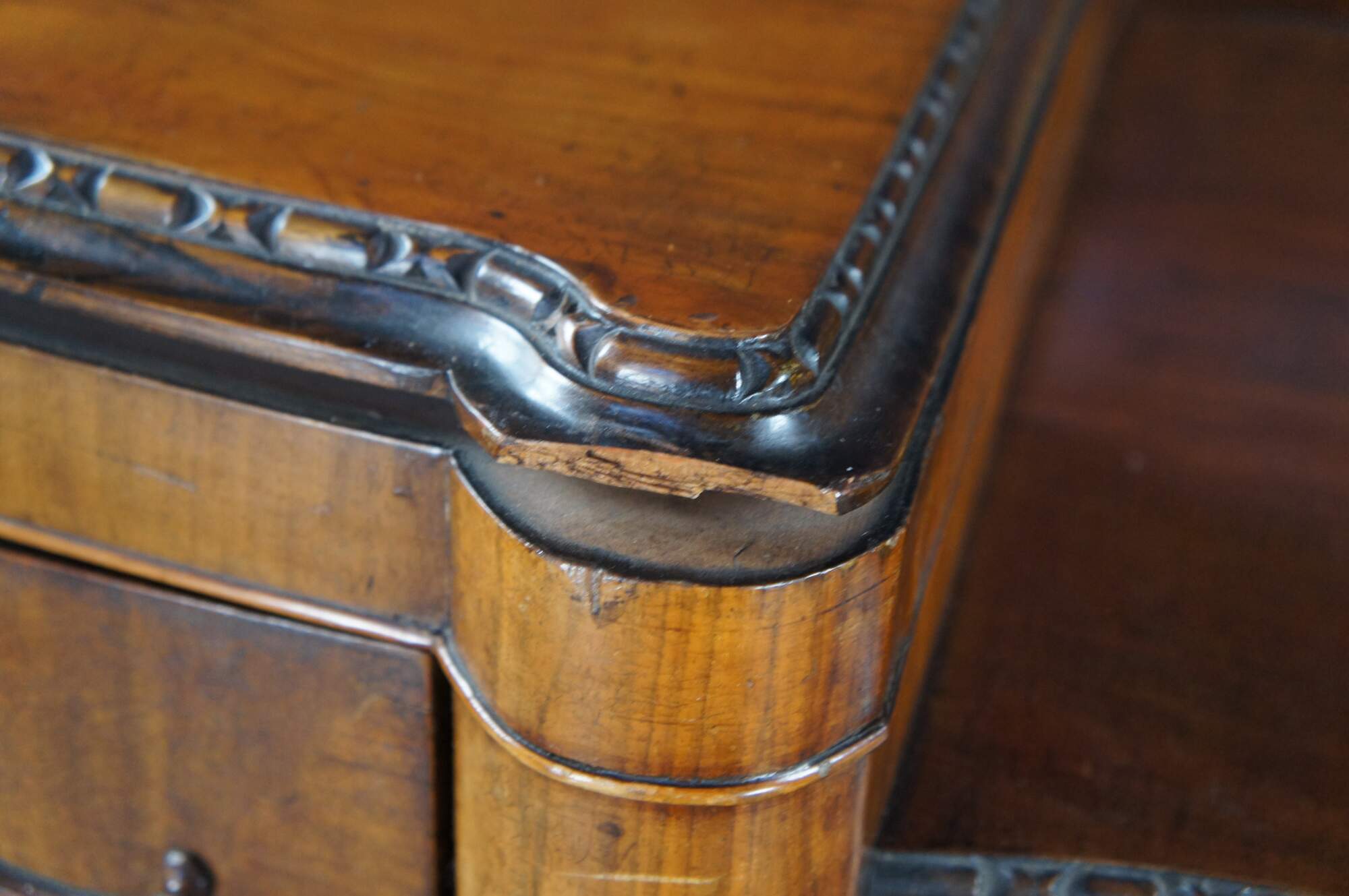 Wear and distressing commensurate with age. some finish loss, marking and staining. Outer top surfaces show slight lifting or warping as well a piece of wood missing on the front rounded edge. Slight trim loss to drawer edges