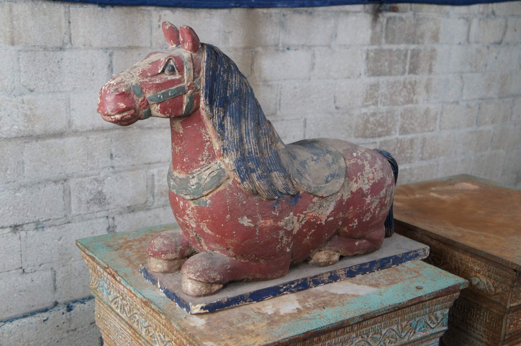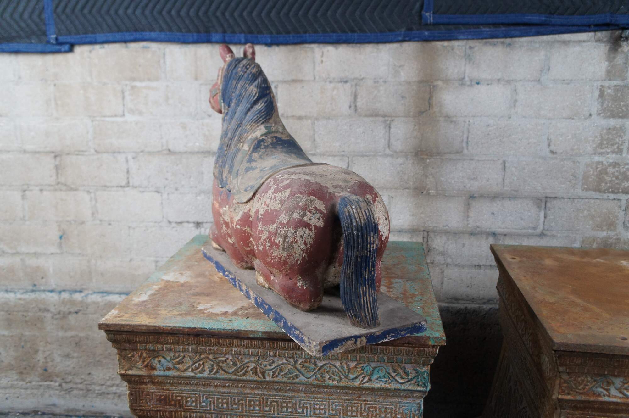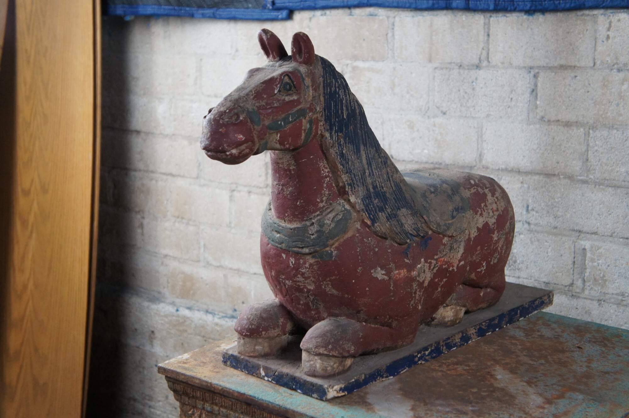 A large and beautiful carved polychrome Han / Tang Dynasty style seated horse sculpture. Hand painted with a rustic red, blue and green patina. The horse is mounted to a wiiden plinth base.