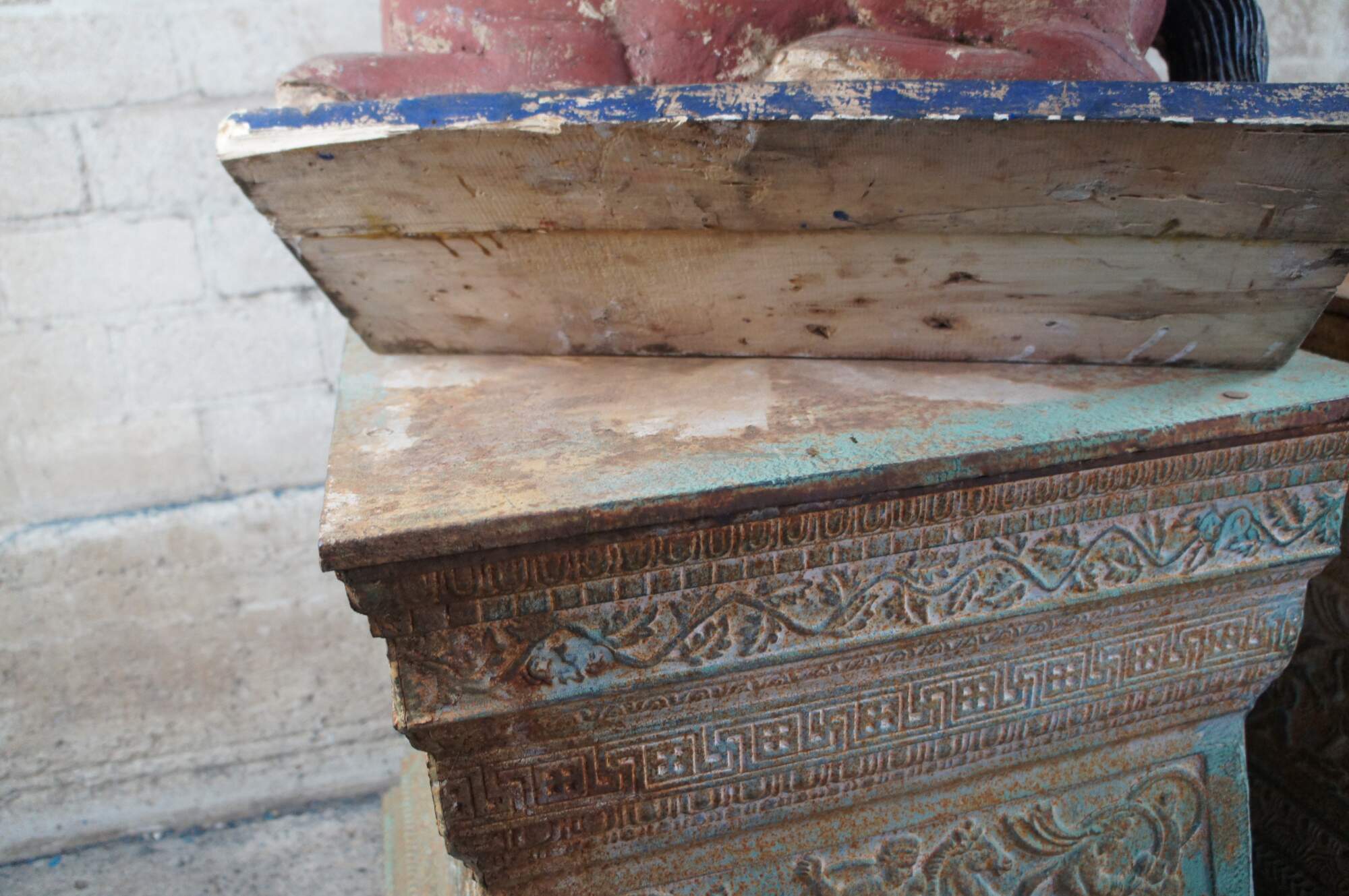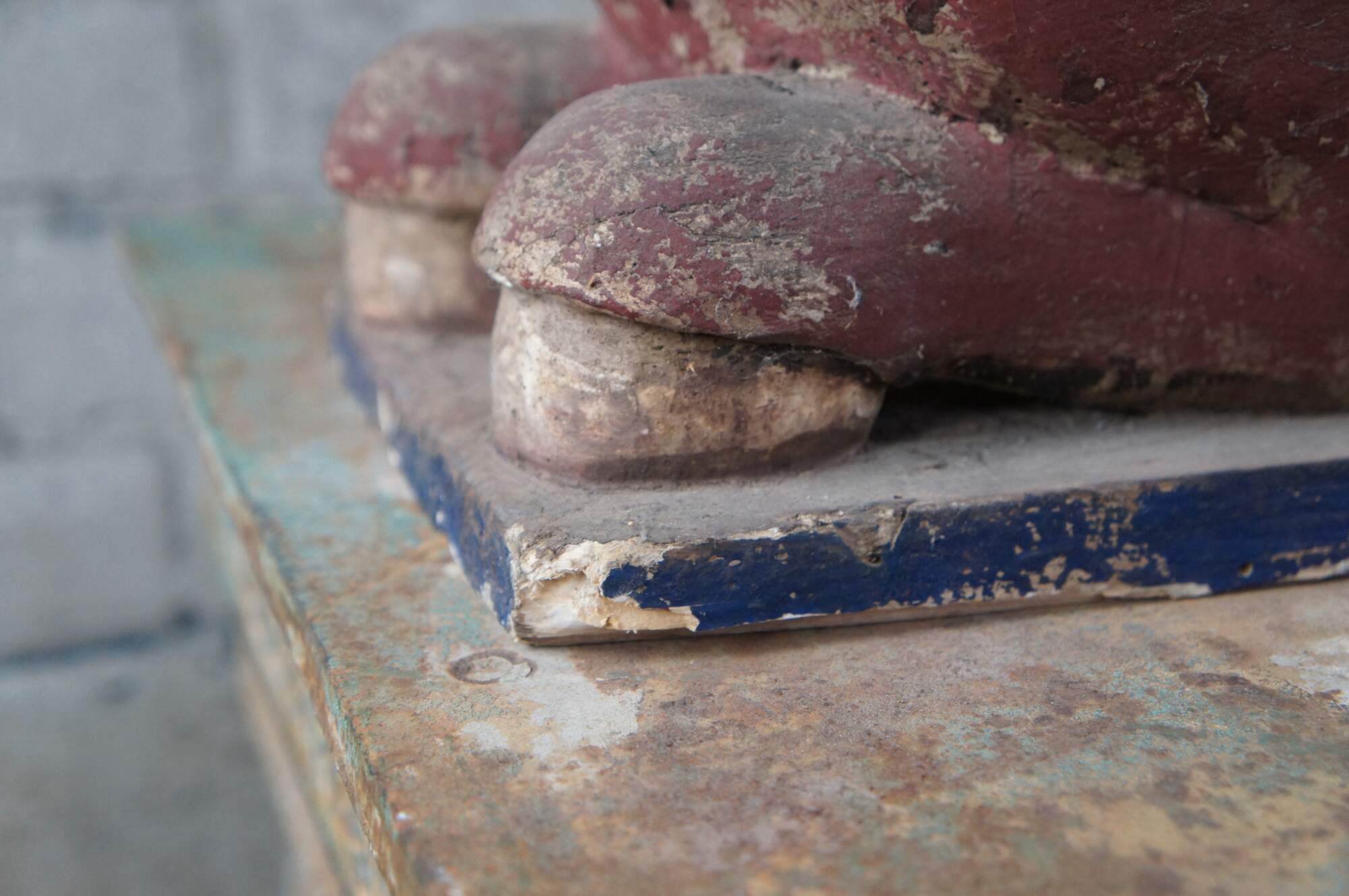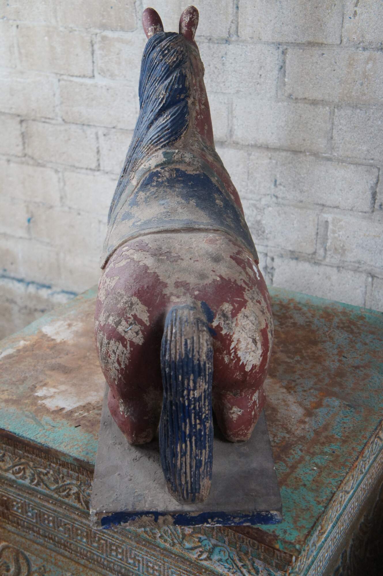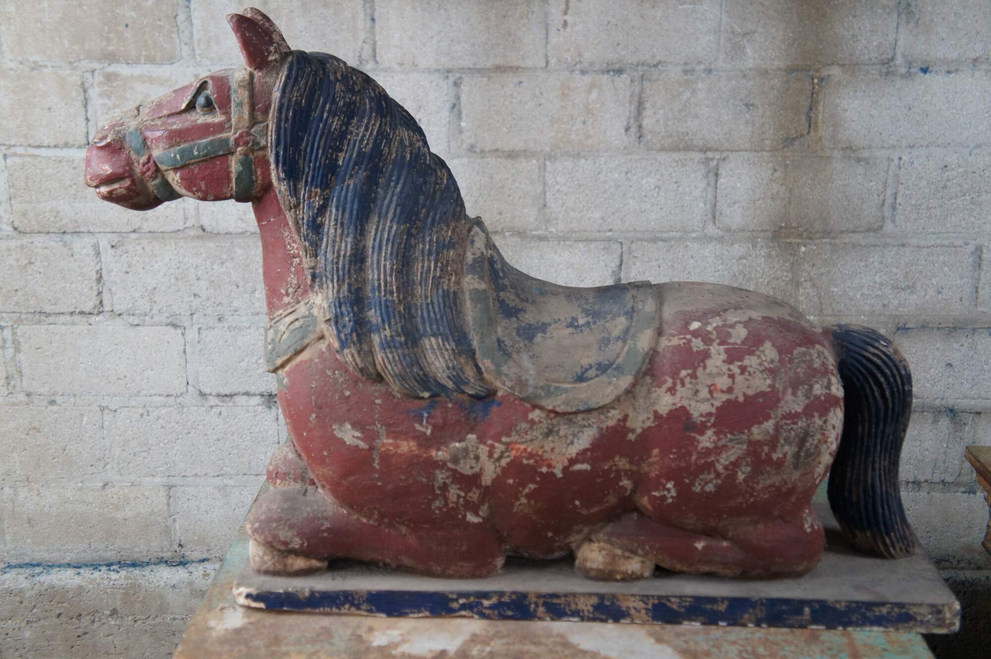 A large and beautiful carved polychrome Han / Tang Dynasty style seated horse sculpture. Hand painted with a rustic red, blue and green patina. The horse is mounted to a wiiden plinth base.