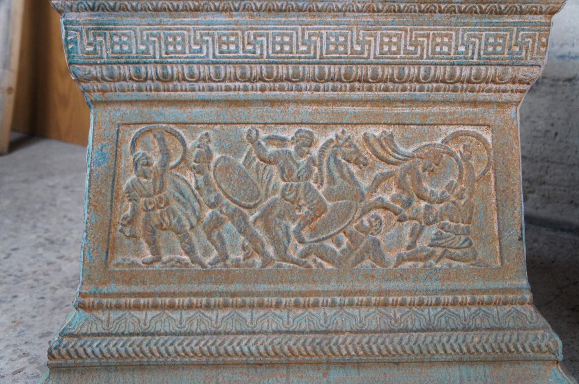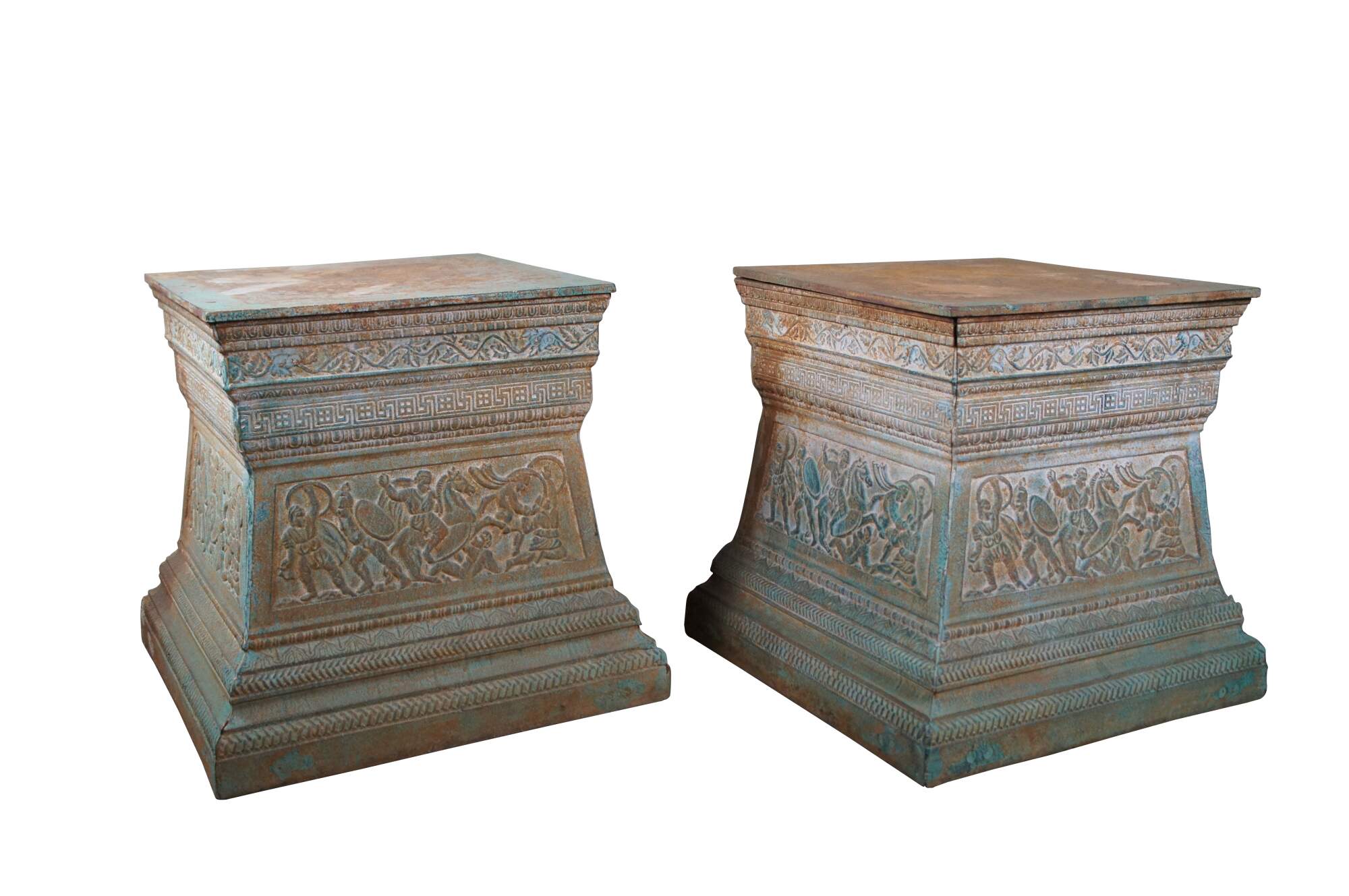 Large pair of Grecian Cast Iron Plinths. Features a square tapered form with scenes of men and horses. The pedestal has a foliate freeze, herringbone trim, and sculpted moldings. Perfect for display of an urn or sculpture. Can be used indoor or outdoor. Finished in a green patina.