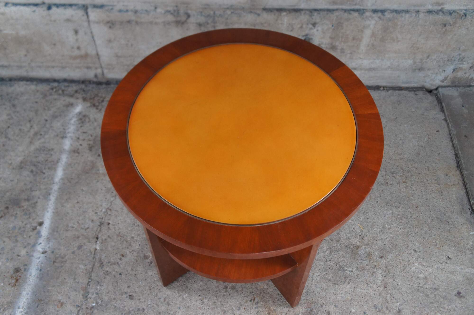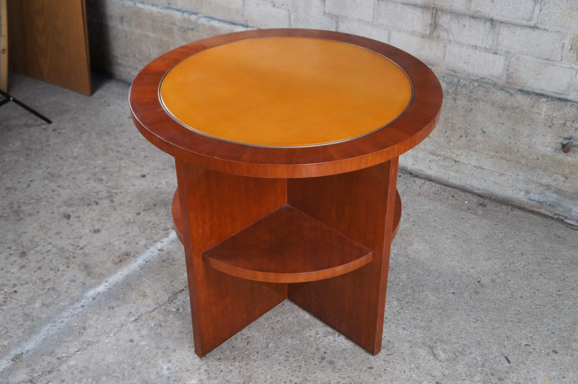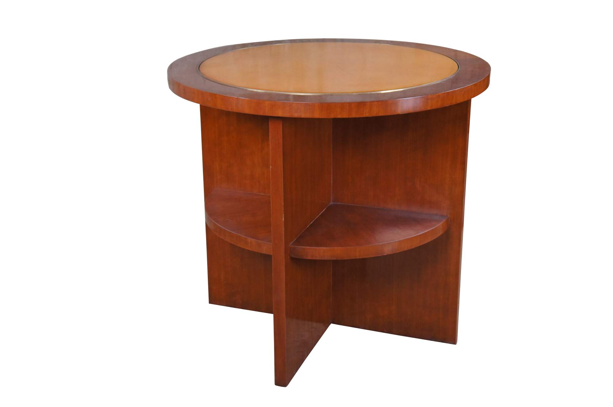Ralph Lauren Modern Table, circa 2000s. Features Art Deco styling with a round tiered form. Made from mahogany with a brass trimmed leather inset top. Great for use as an occasional table or bedside / nightstand.