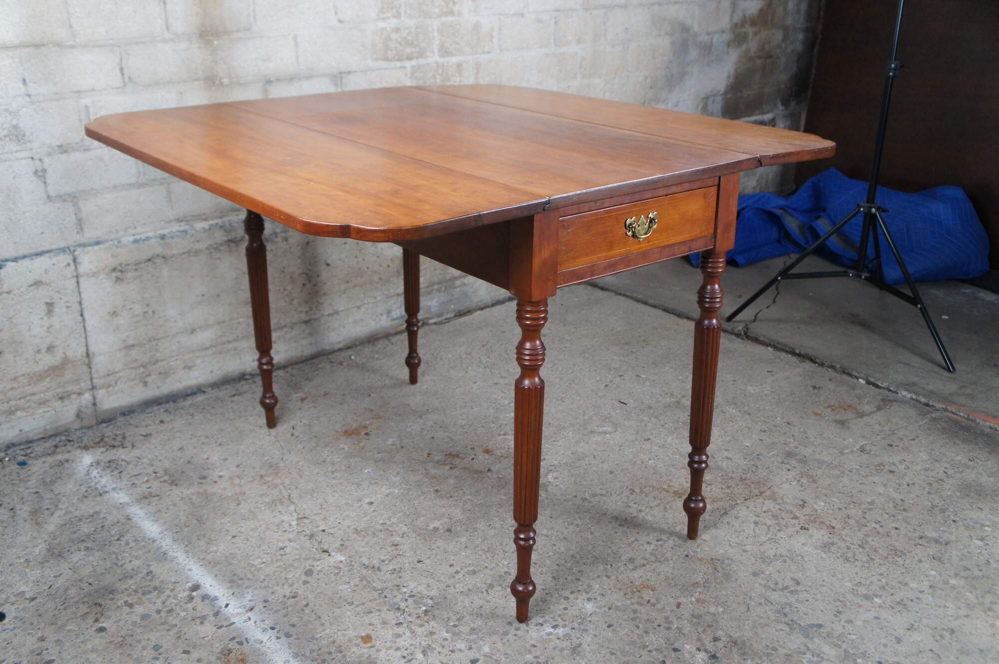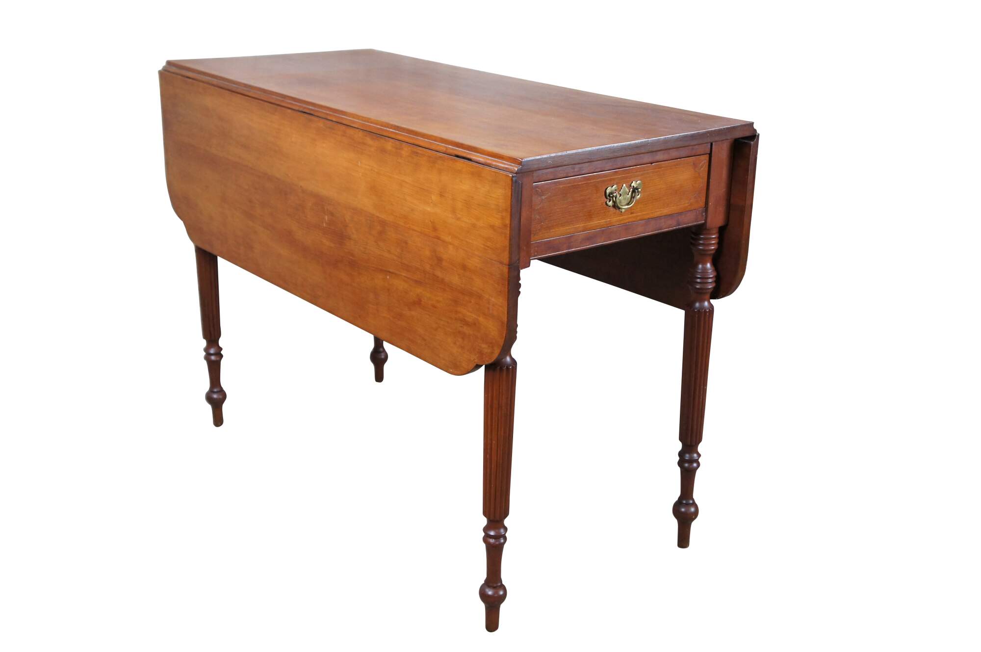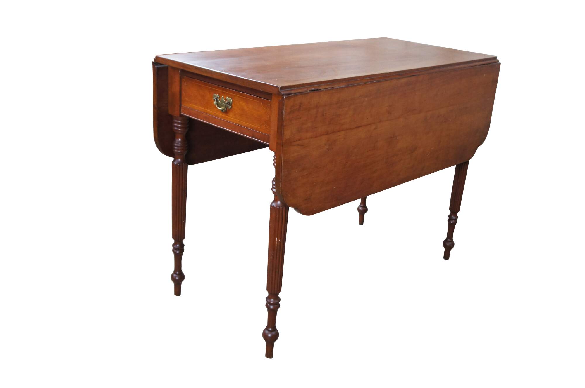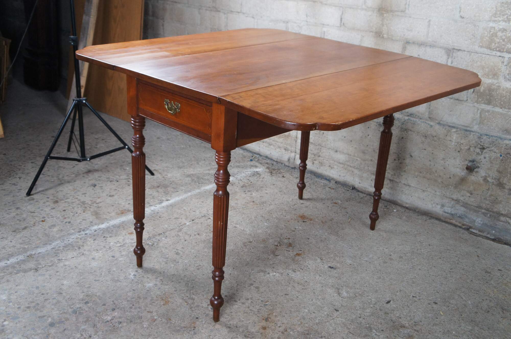 Early 19th Century American Sheraton Drop Leaf Table. Made from cherry with a hand-dovetailed and inlaid drawer within the frieze. The table features contoured corners and is supported by ring-turned-reeded legs leading to arrow feet. Great for use as a dining / breakfast table or console table.